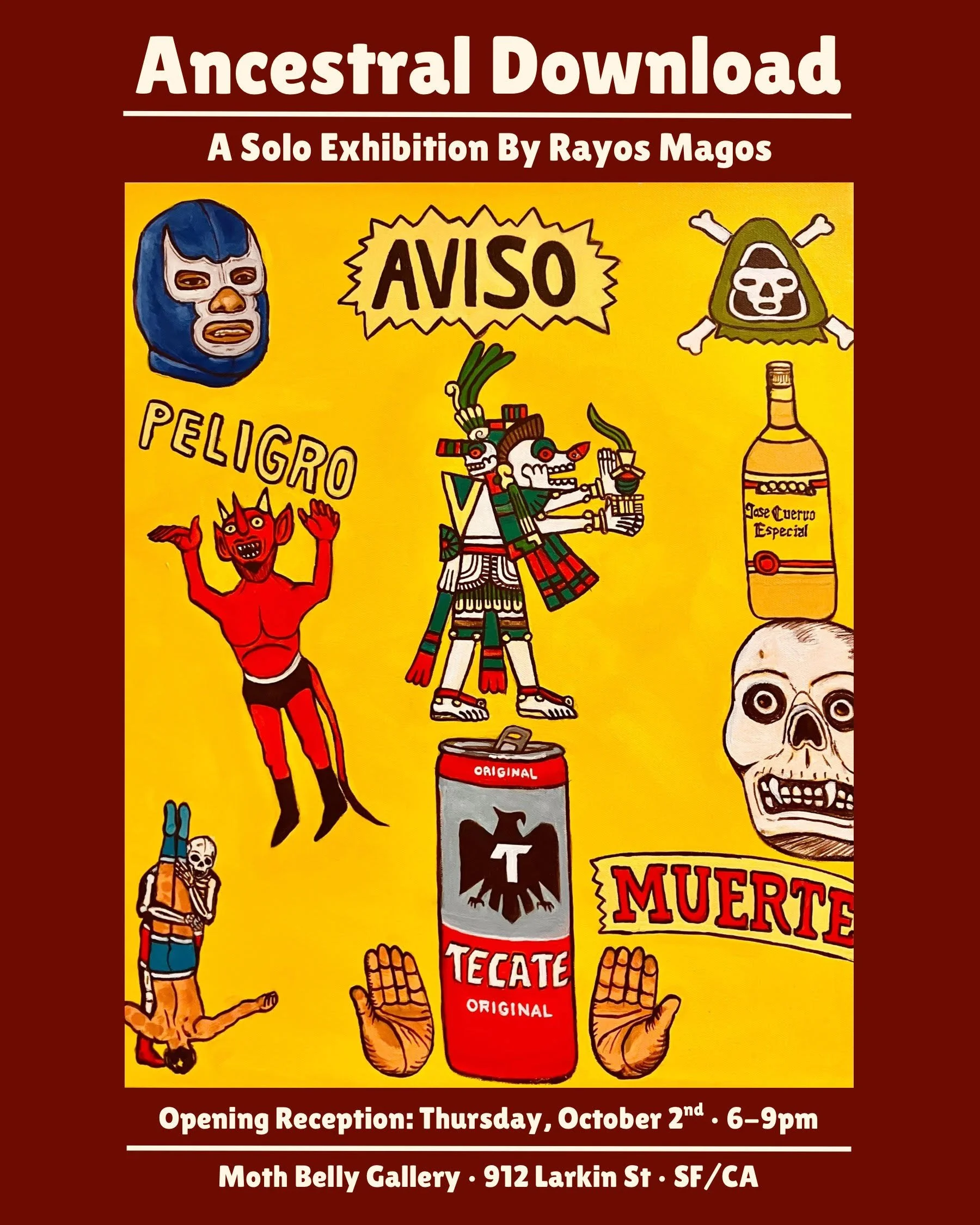 For our October/November solo exhibition, we are proud to present Ancestral Download by our friend Rayos Magos. This new body of paintings–over a year in the making–extends Rayos’ exploration of symbolism, from Mesoamerican glyphs to brands tied to the U.S. and Mexico, adds another step in his lifelong journey of reclaiming identity. The show show also marks a farewell send-off, as Rayos heads to Toronto to begin the next chapter of his life and art.