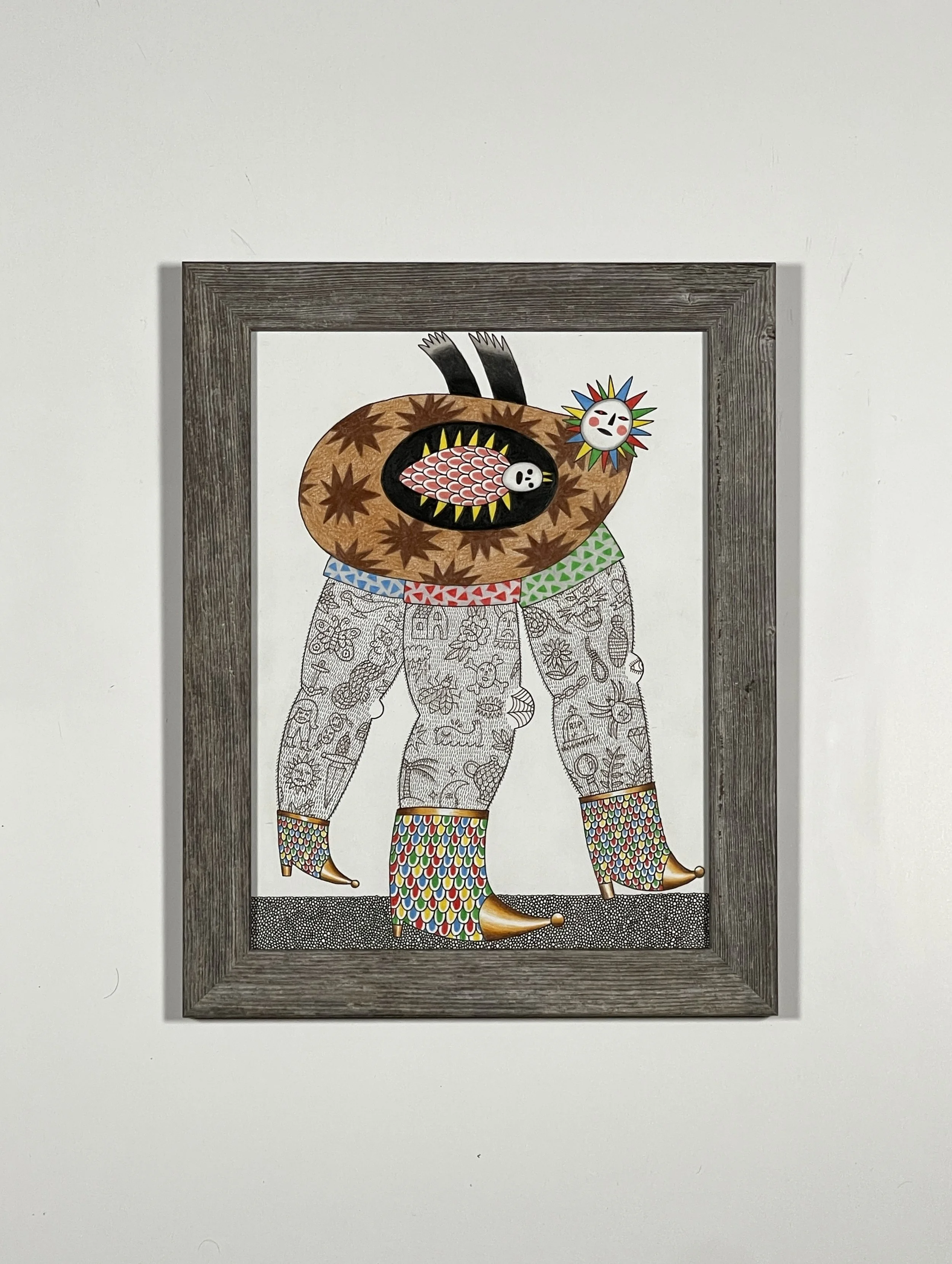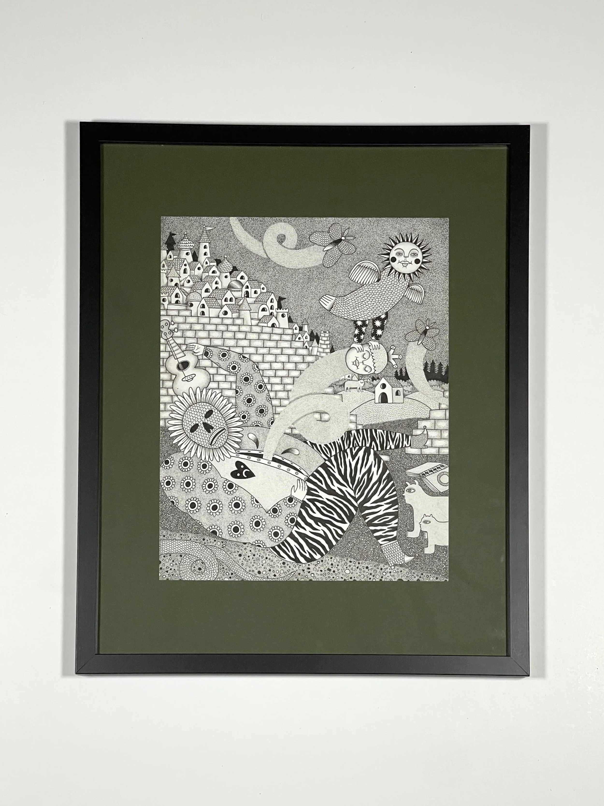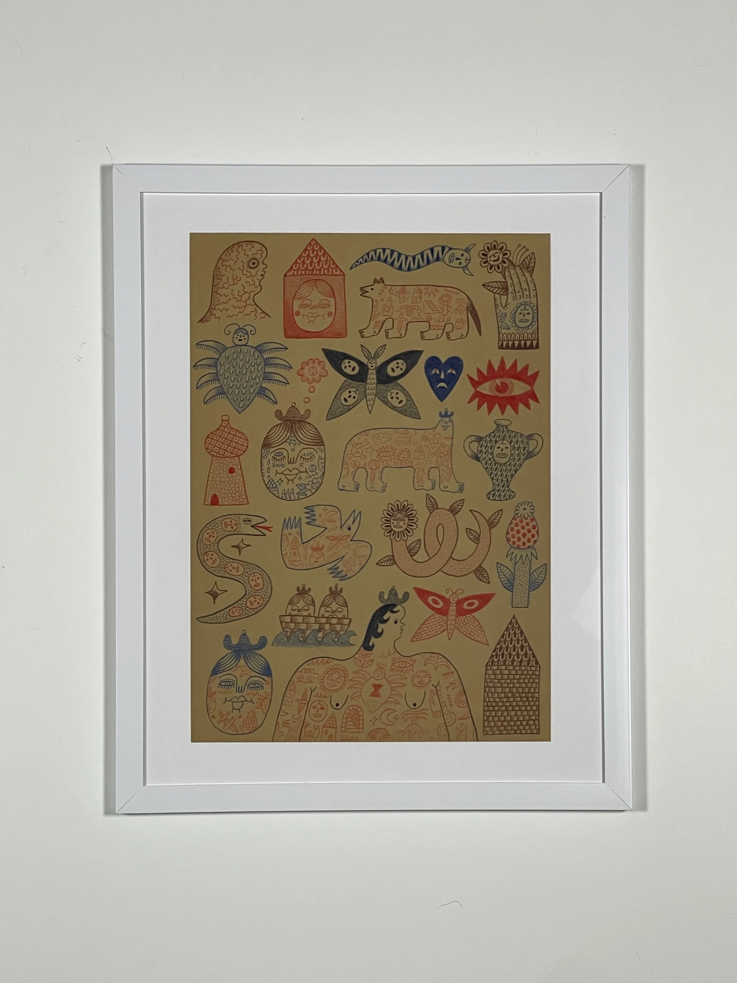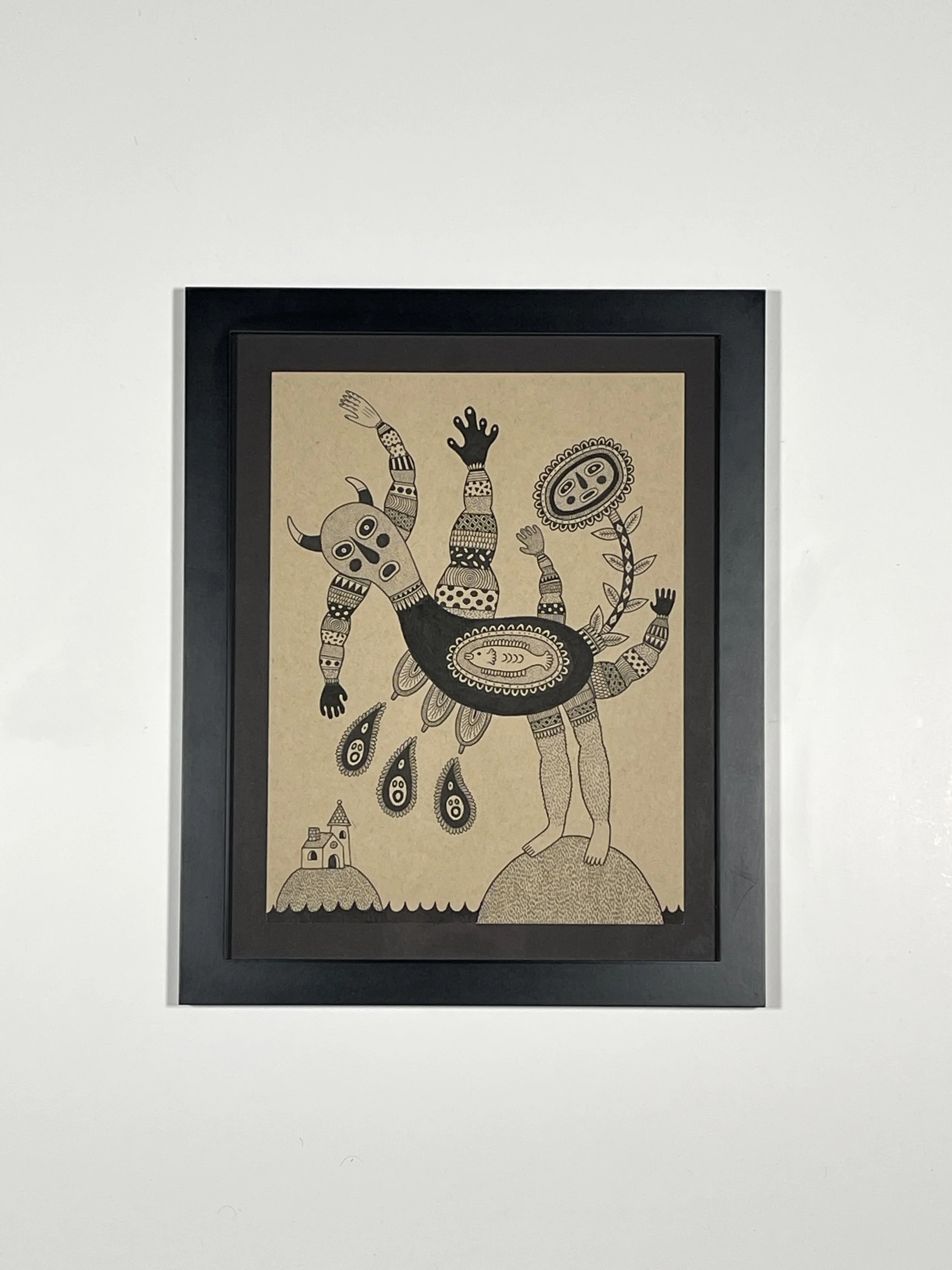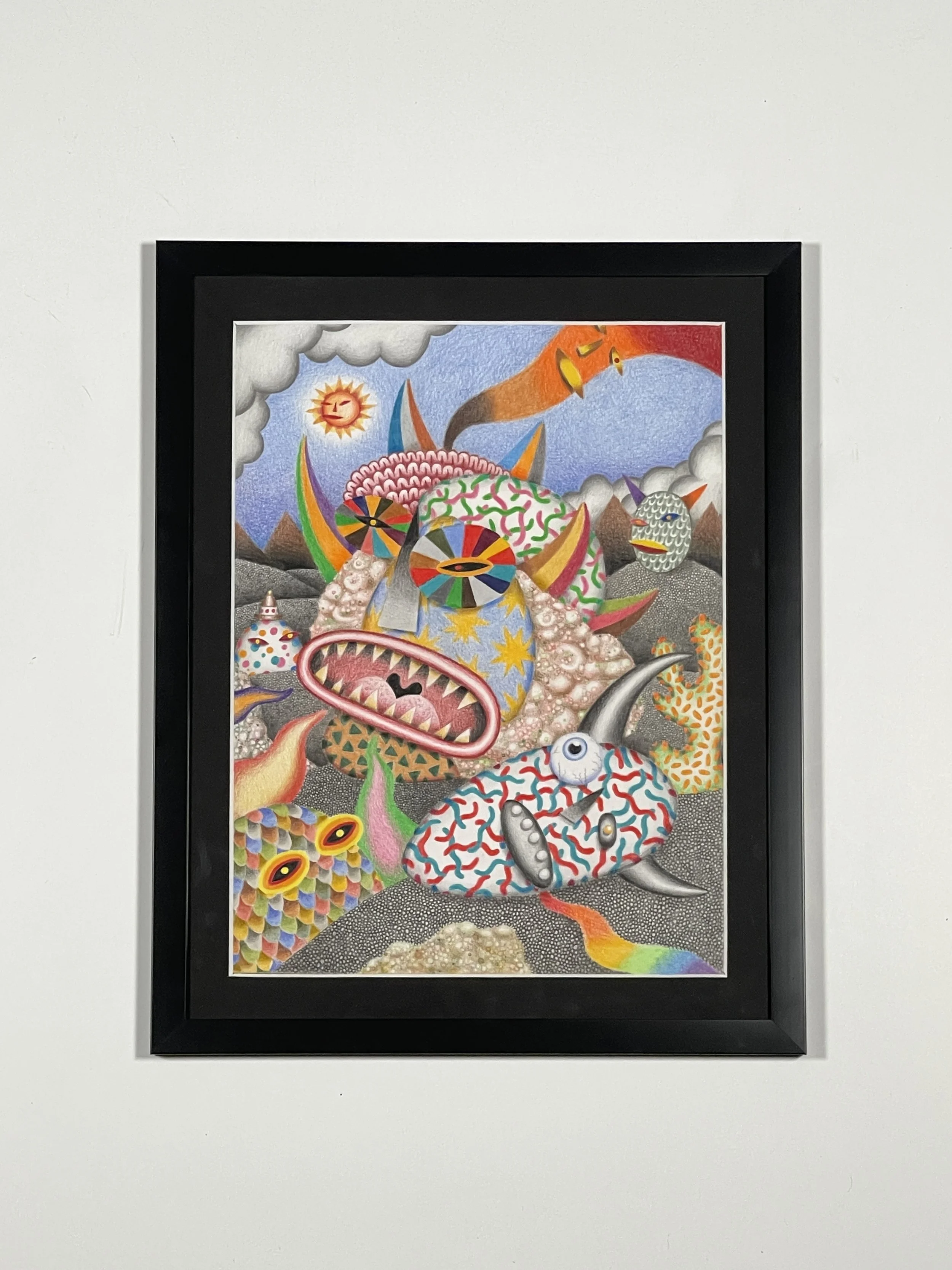 Starting in June 2021, I set aside my X-Acto knife indefinitely and began exploring drawing as my primary artistic medium. Working mostly with micron pens or oil-based colored pencils, the drawings in this collection were done over an almost three year period. They reflect my journey of self-discovery and the resulting creativity as I transformed into a new, different version of myself. The work gravitates between rotating styles, yet draws from a consistent visual language of patterns and motifs, as well as influences from my roots in surrealism, to folk and naive art, to the world of tattooing, which I worked in for three years until the pandemic in 2020.