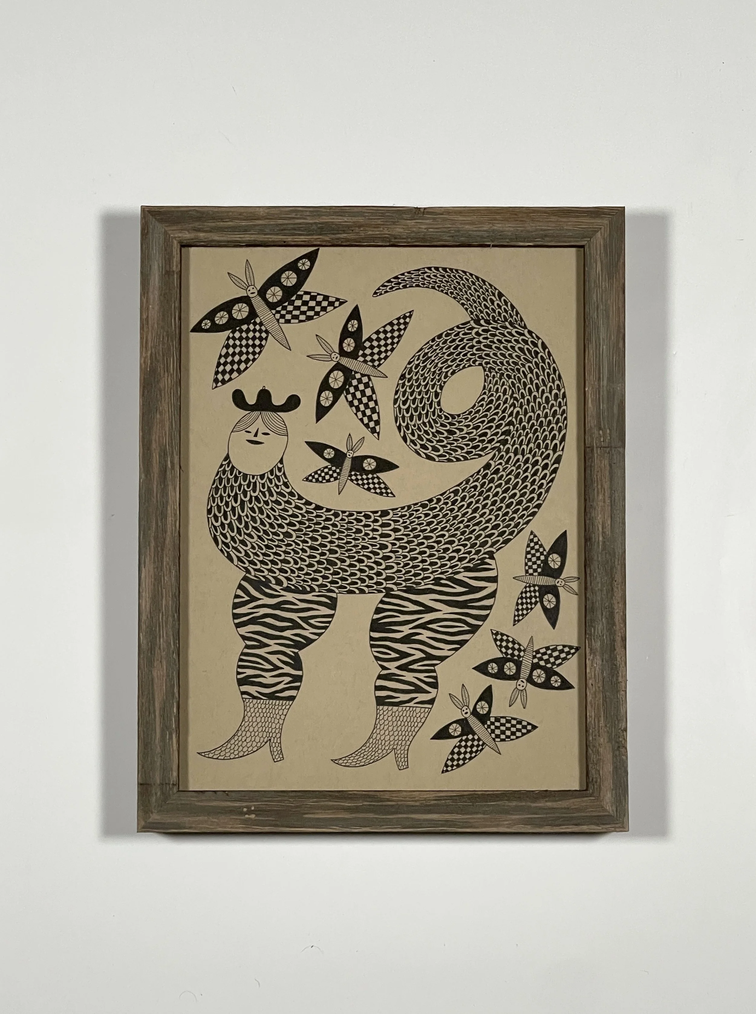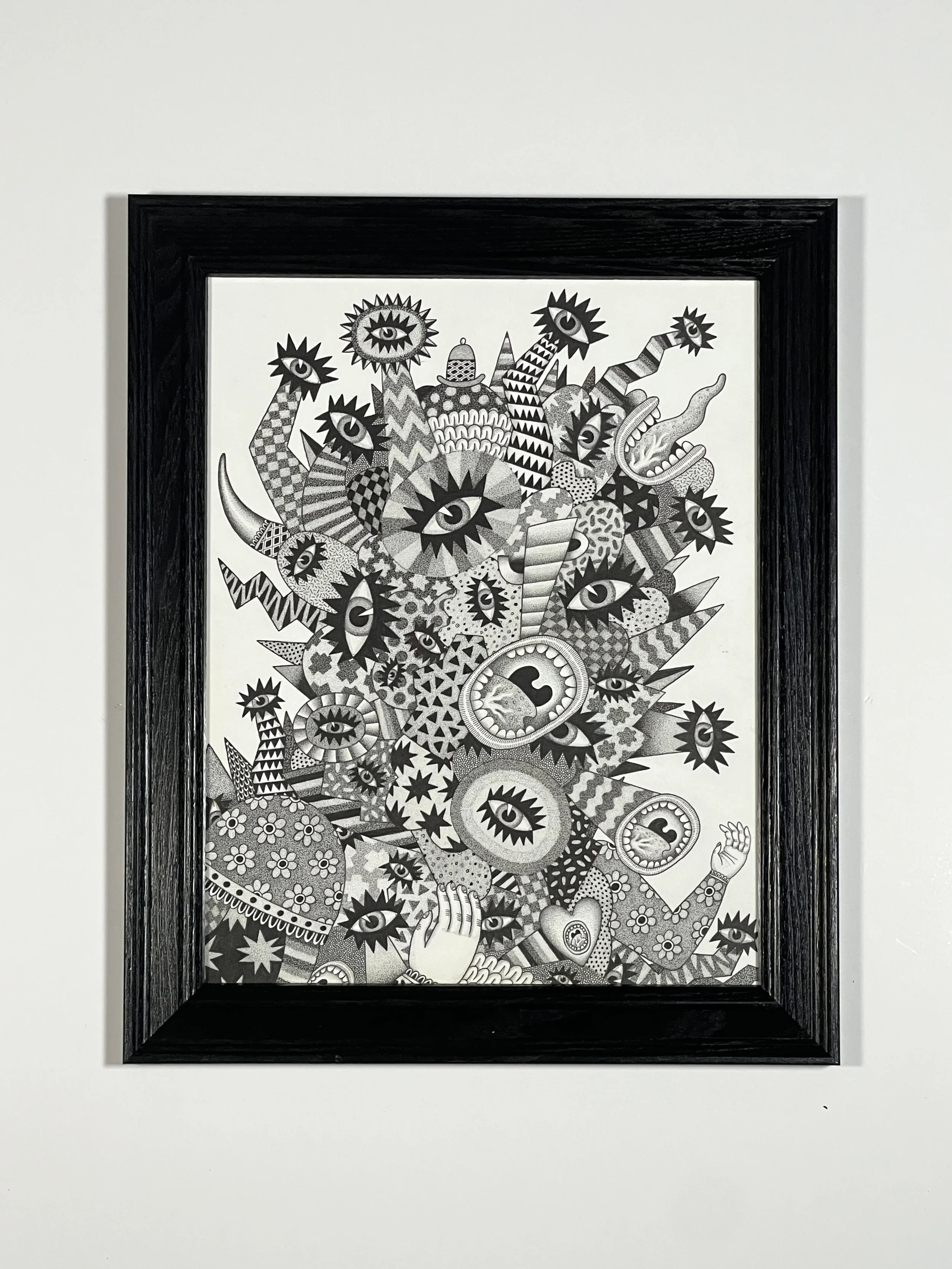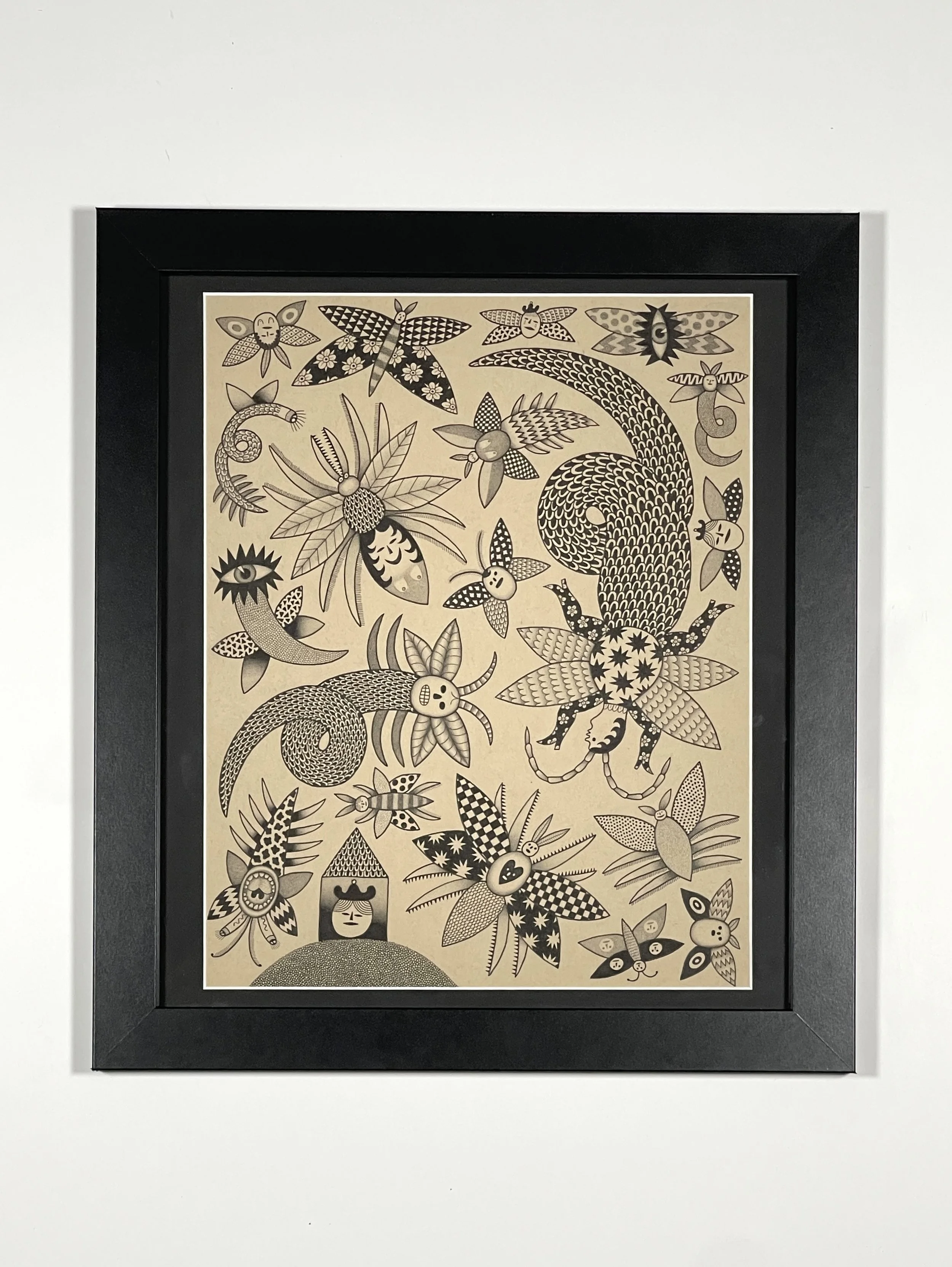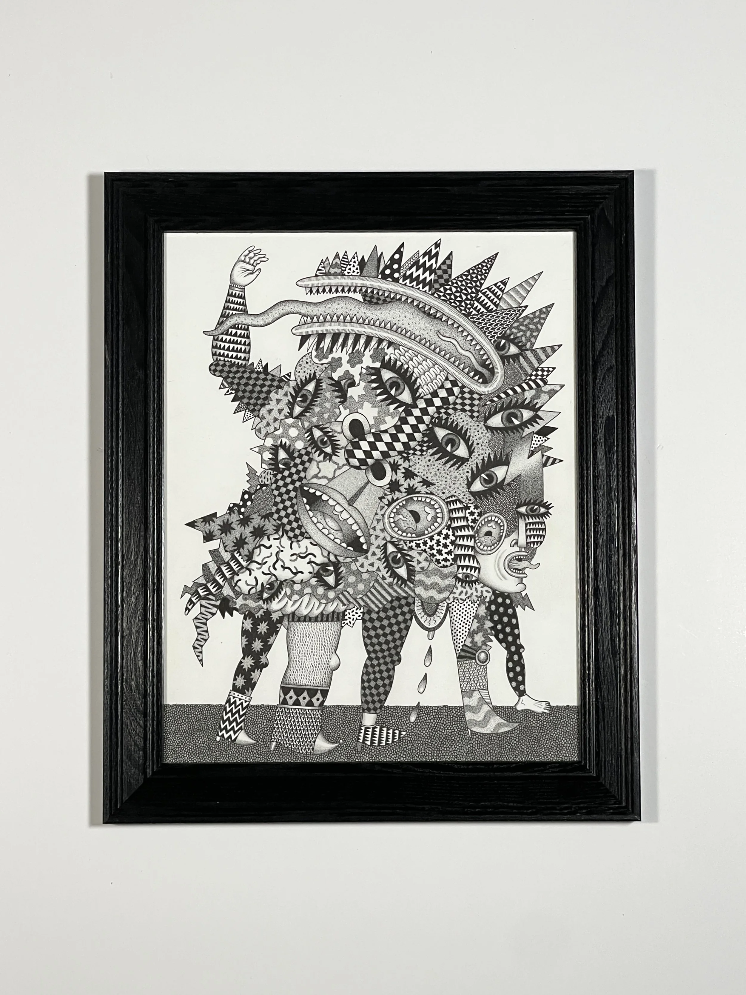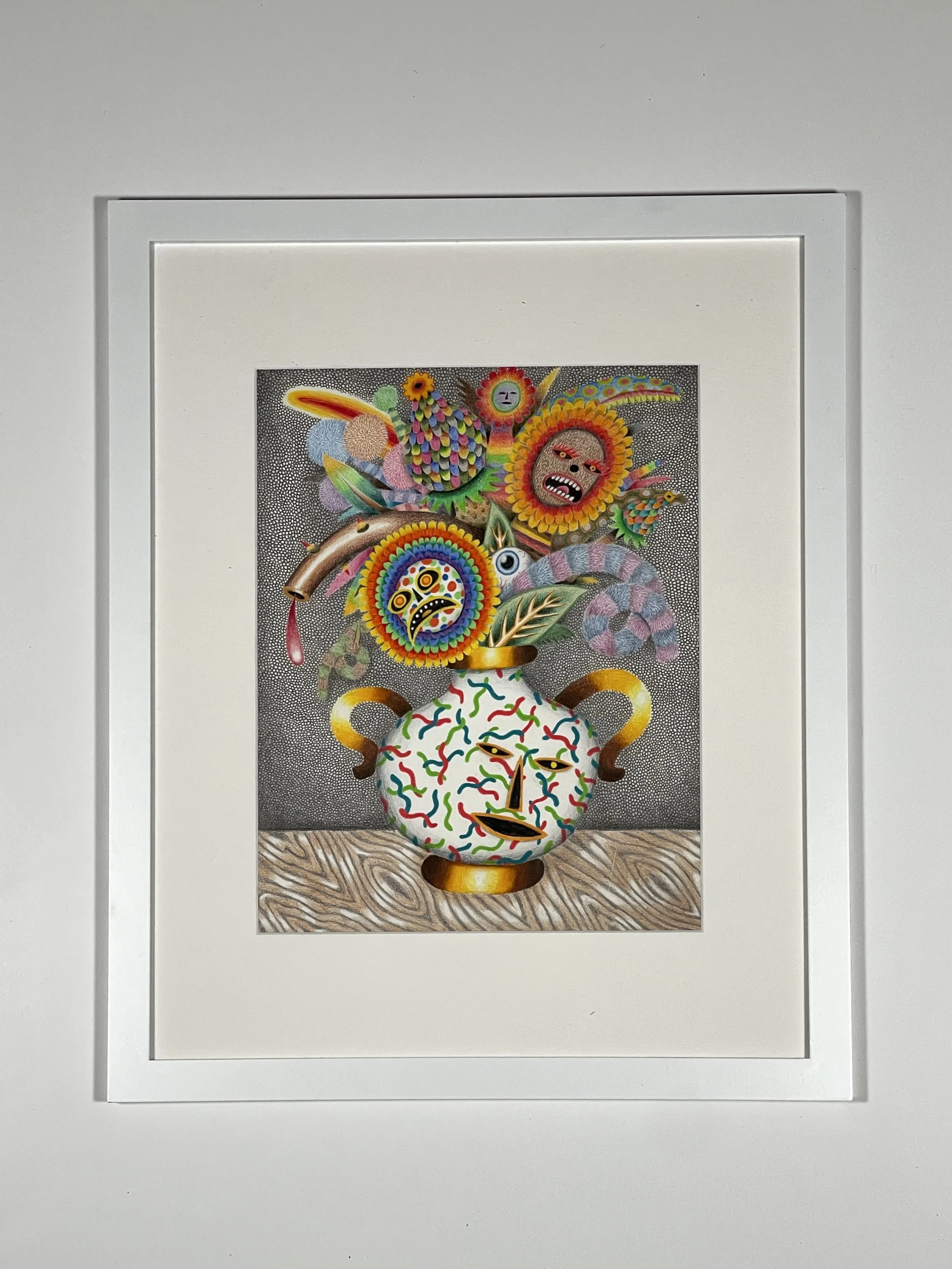 Starting in June 2021, I set aside my X-Acto knife indefinitely and began exploring drawing as my primary artistic medium. Working mostly with micron pens or oil-based colored pencils, the drawings in this collection were done over an almost three year period. They reflect my journey of self-discovery and the resulting creativity as I transformed into a new, different version of myself. The work gravitates between rotating styles, yet draws from a consistent visual language of patterns and motifs, as well as influences from my roots in surrealism, to folk and naive art, to the world of tattooing, which I worked in for three years until the pandemic in 2020.