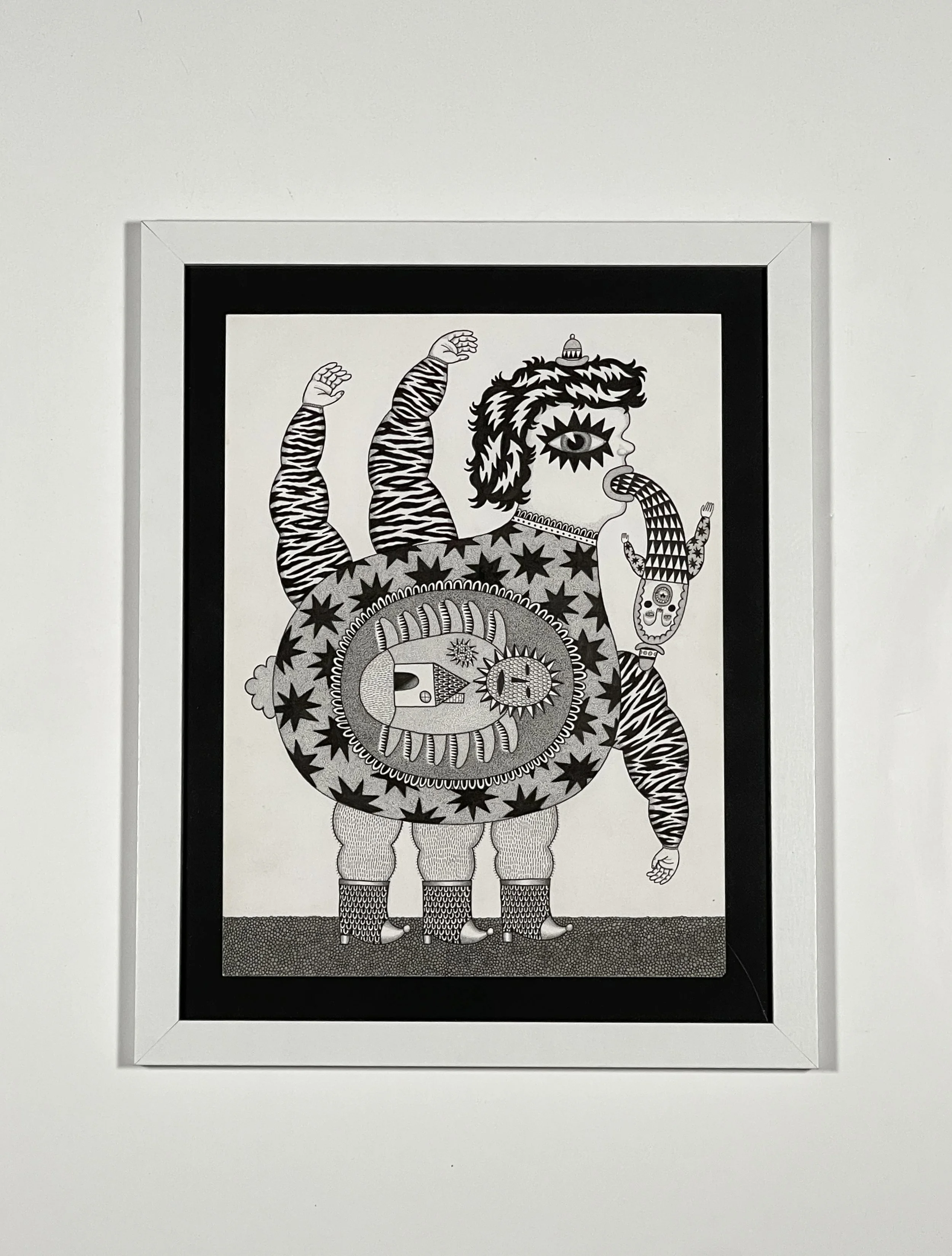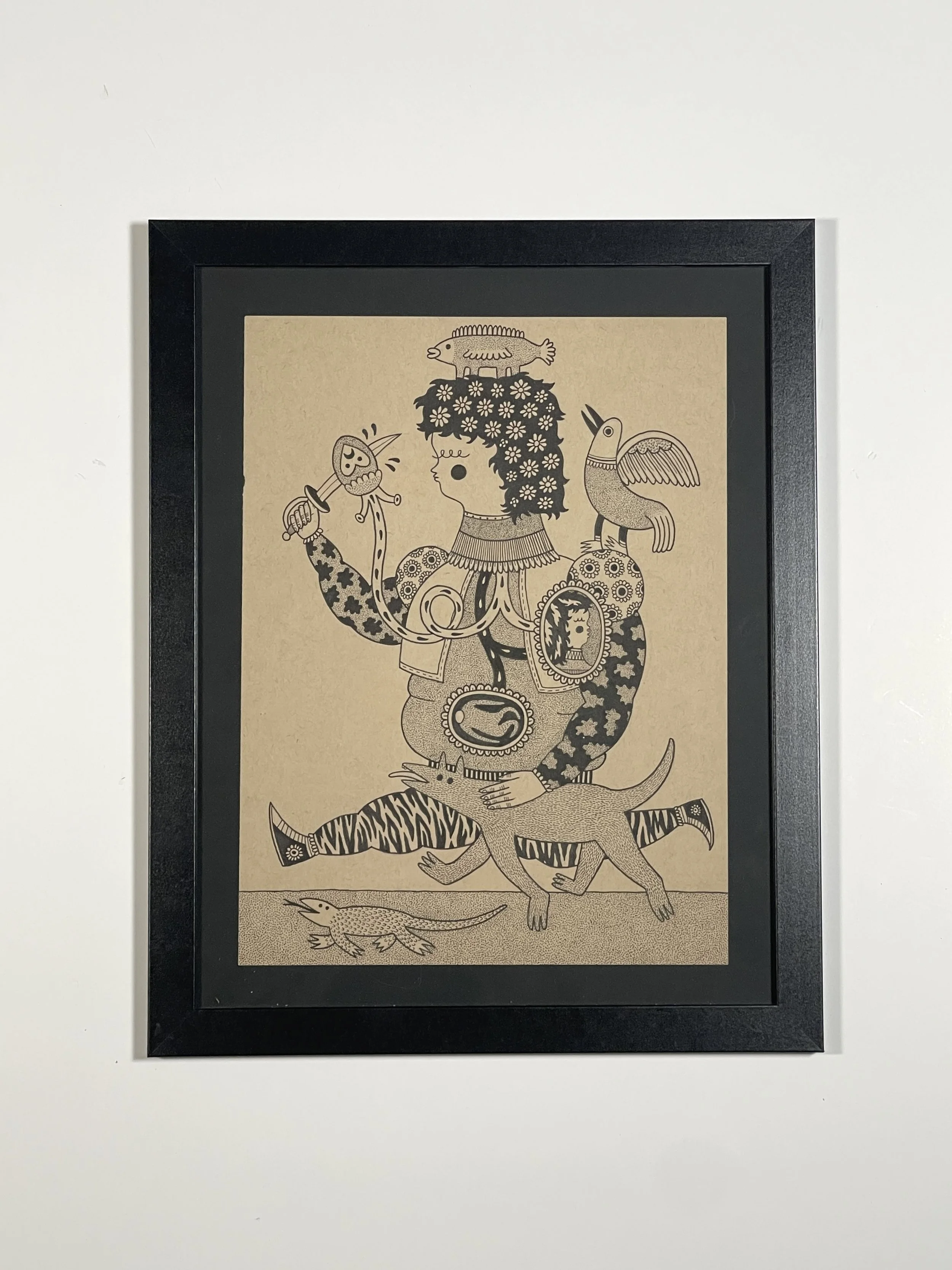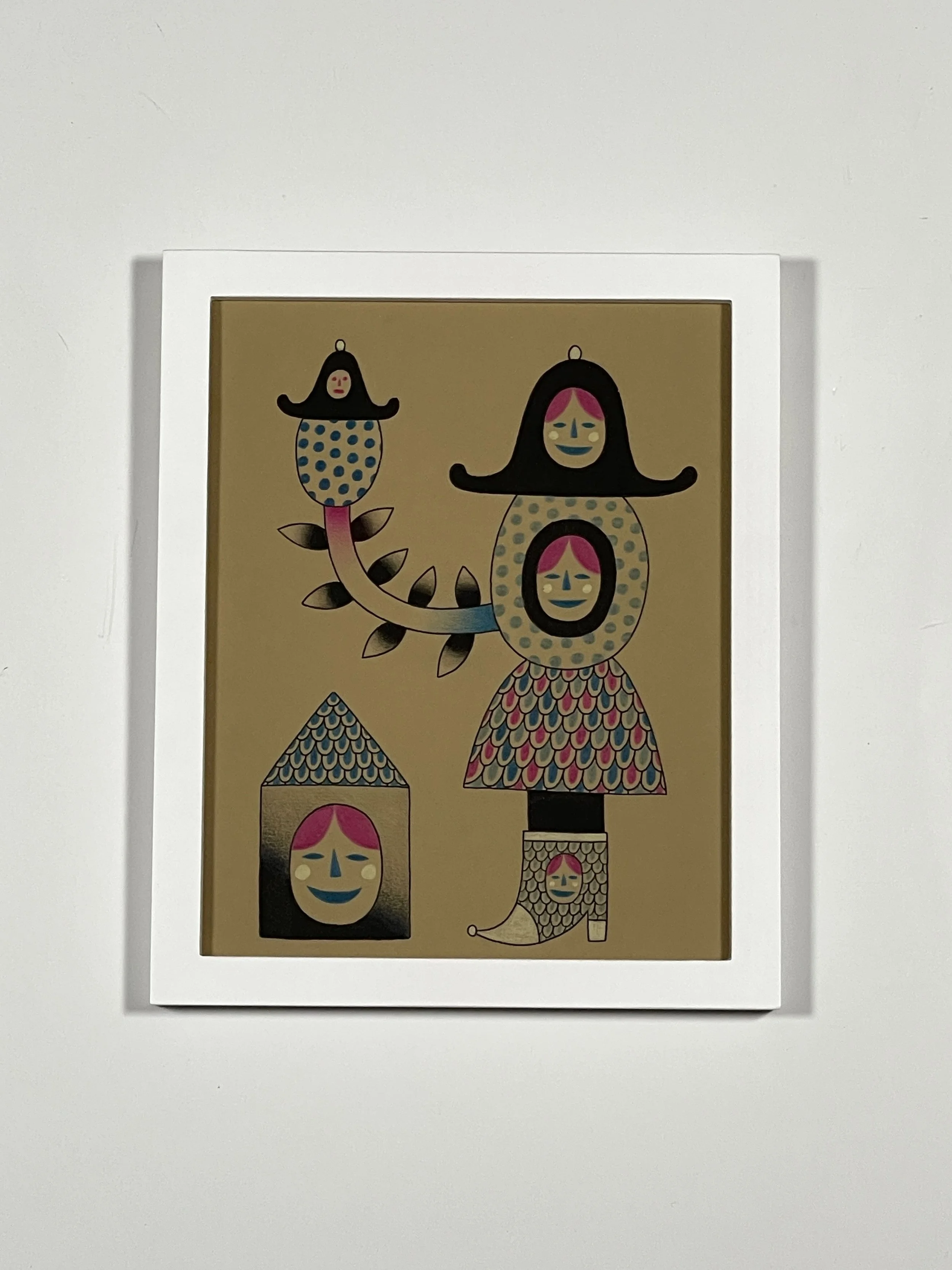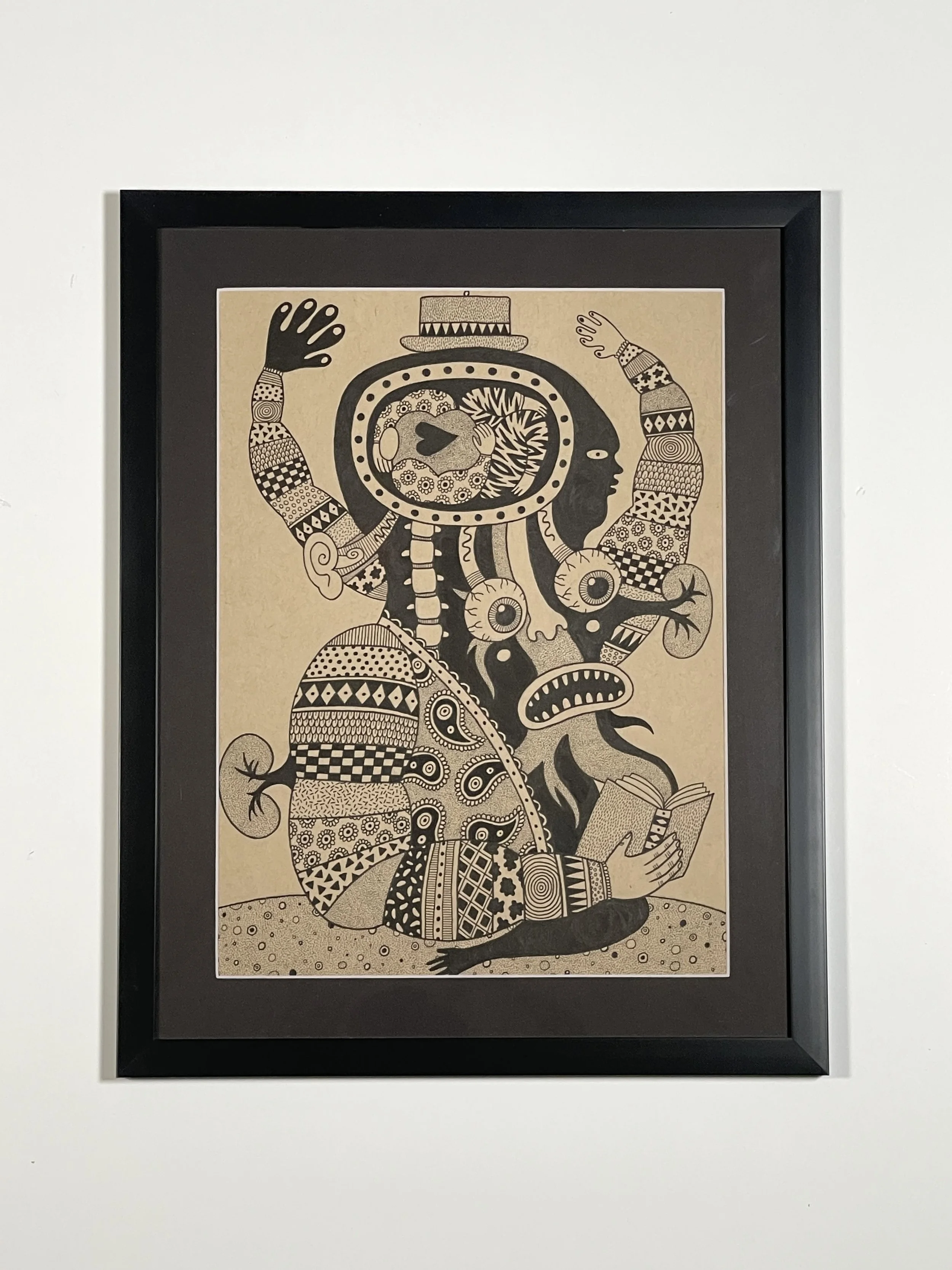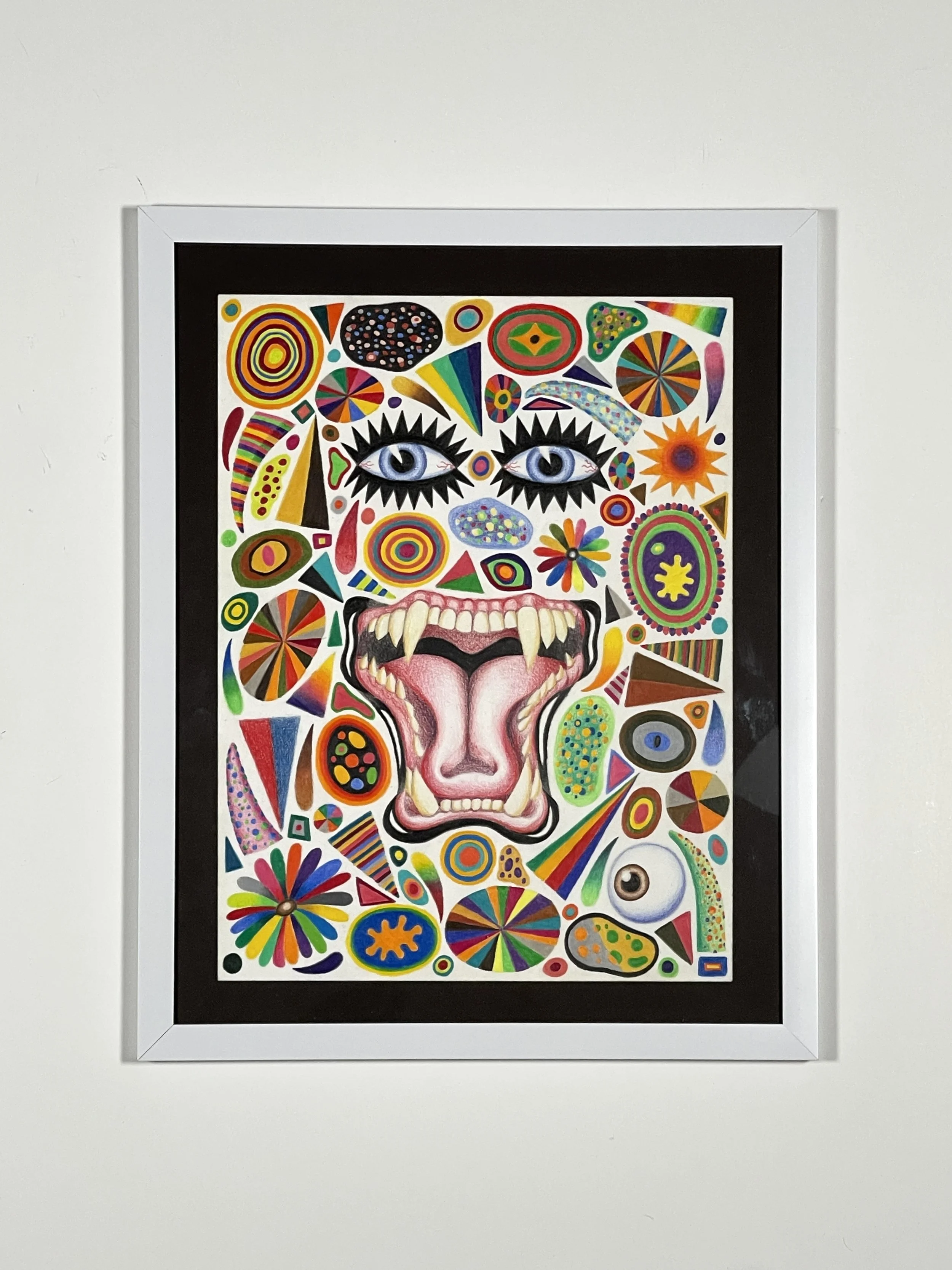 Starting in June 2021, I set aside my X-Acto knife indefinitely and began exploring drawing as my primary artistic medium. Working mostly with micron pens or oil-based colored pencils, the drawings in this collection were done over an almost three year period. They reflect my journey of self-discovery and the resulting creativity as I transformed into a new, different version of myself. The work gravitates between rotating styles, yet draws from a consistent visual language of patterns and motifs, as well as influences from my roots in surrealism, to folk and naive art, to the world of tattooing, which I worked in for three years until the pandemic in 2020.