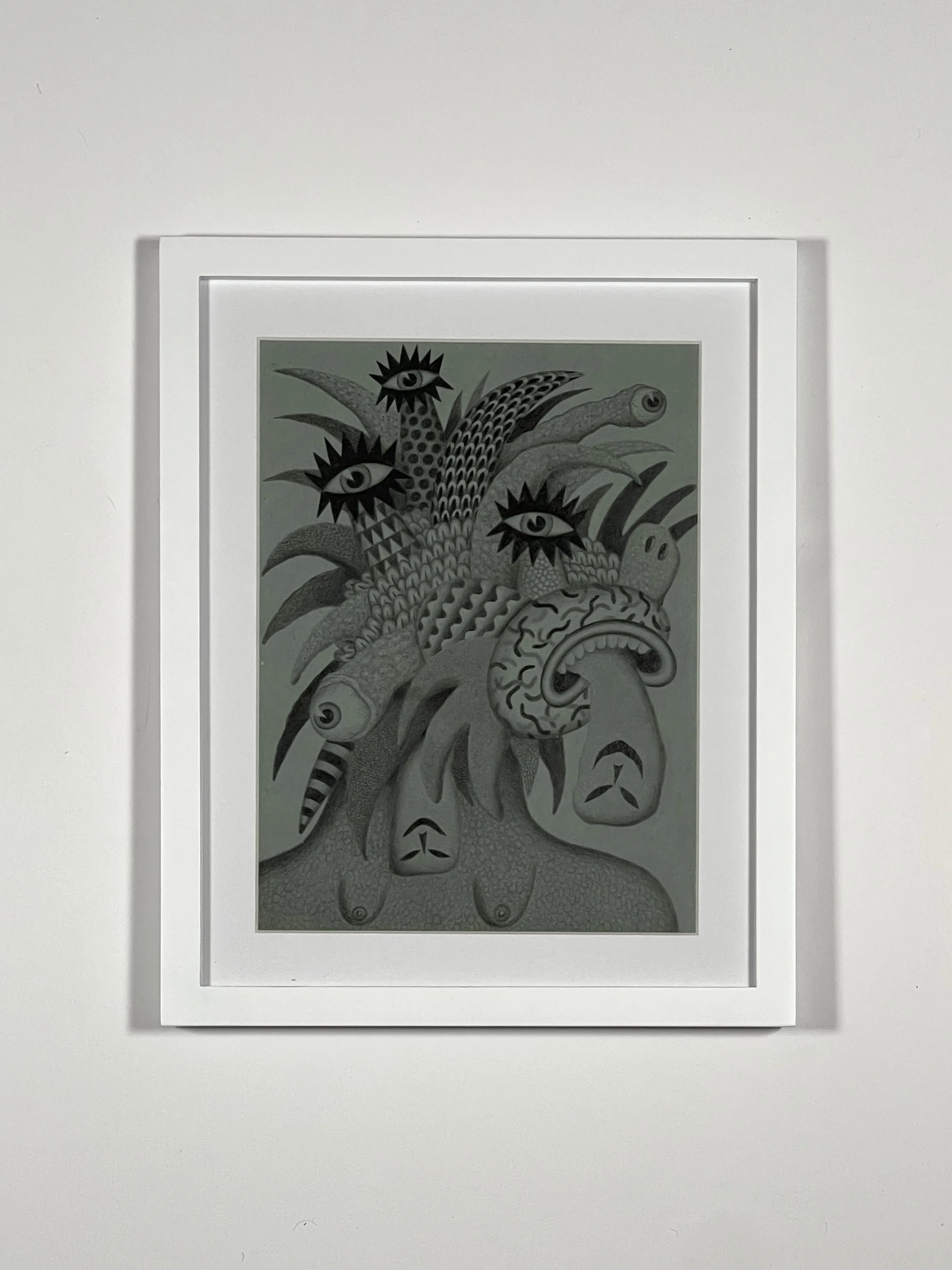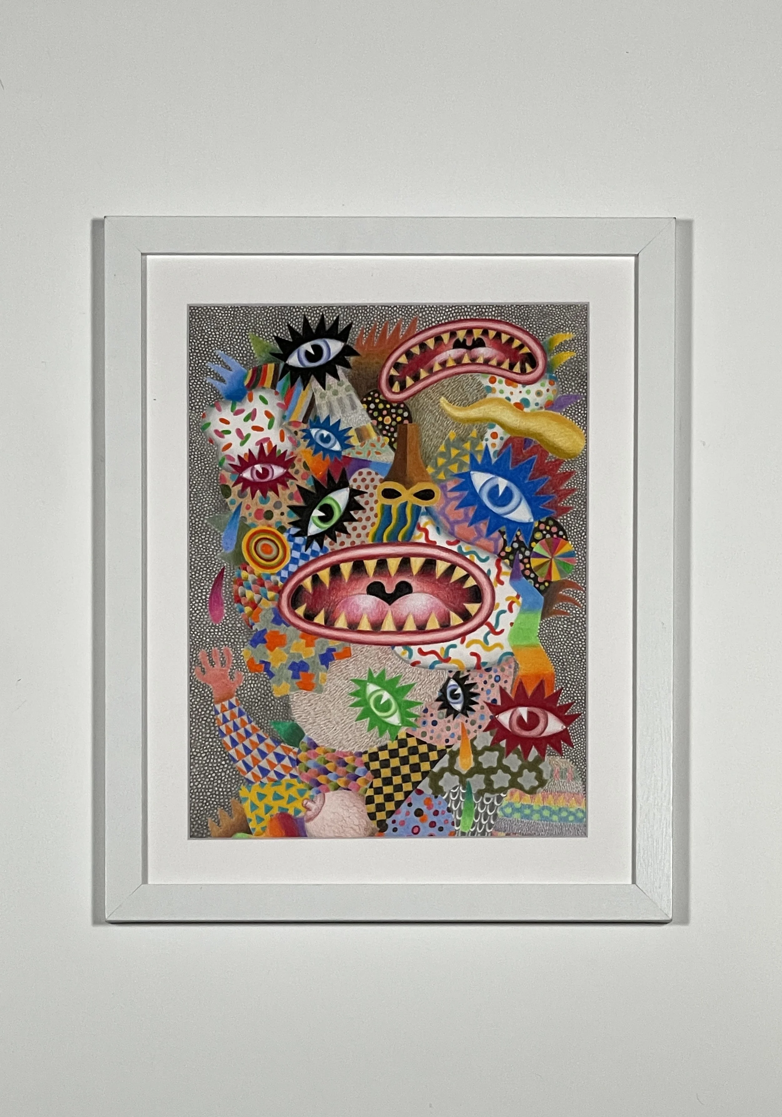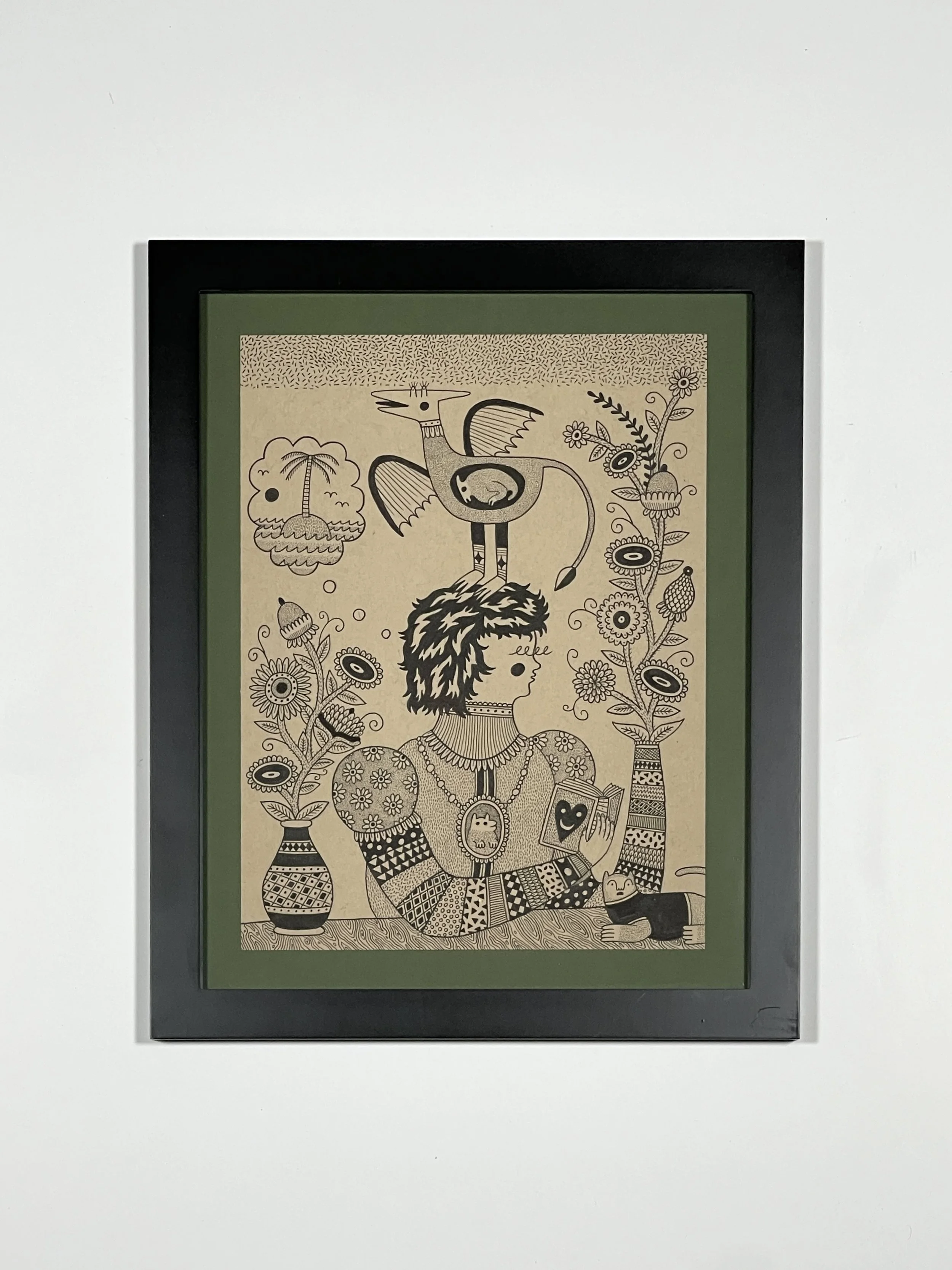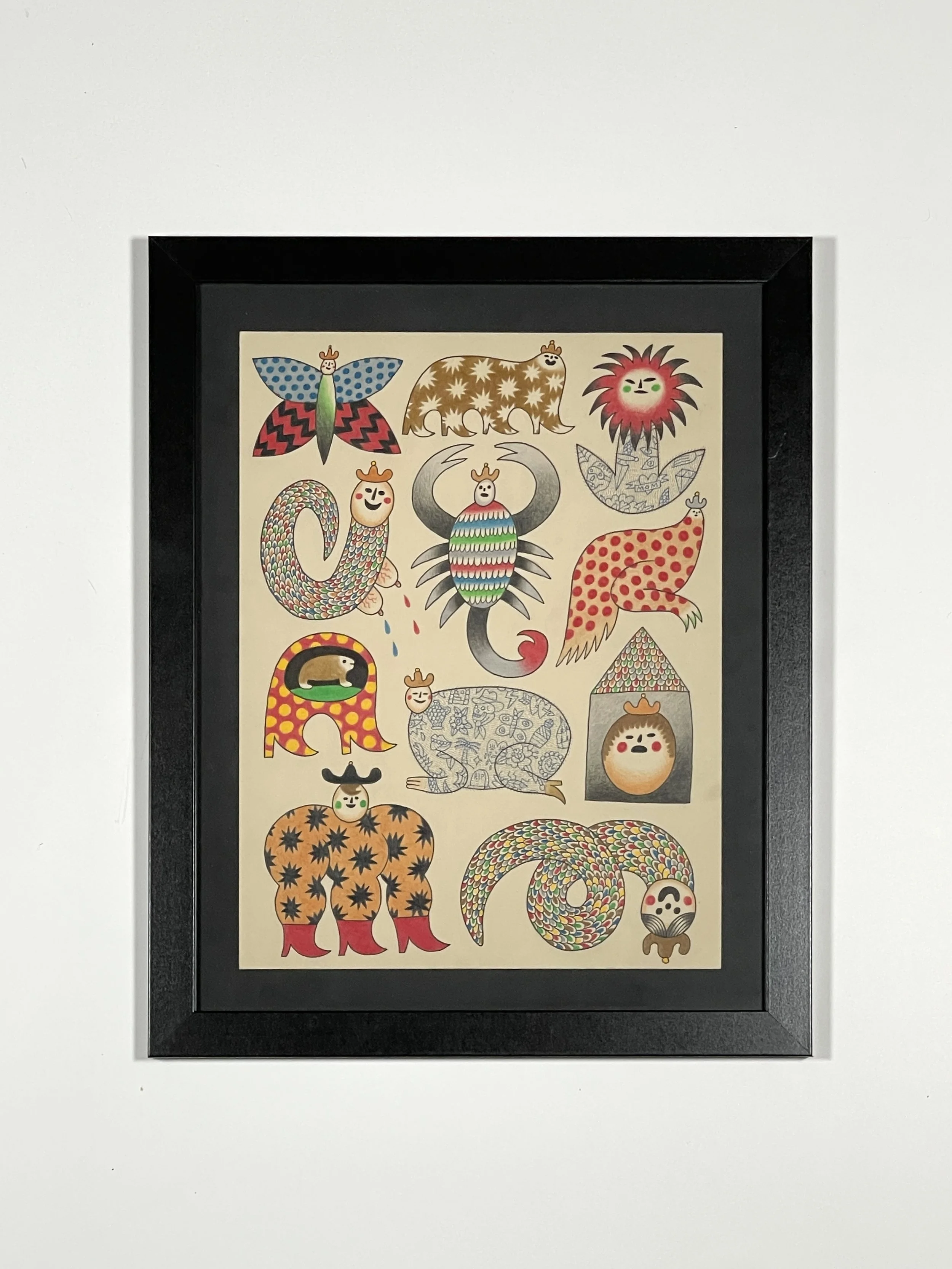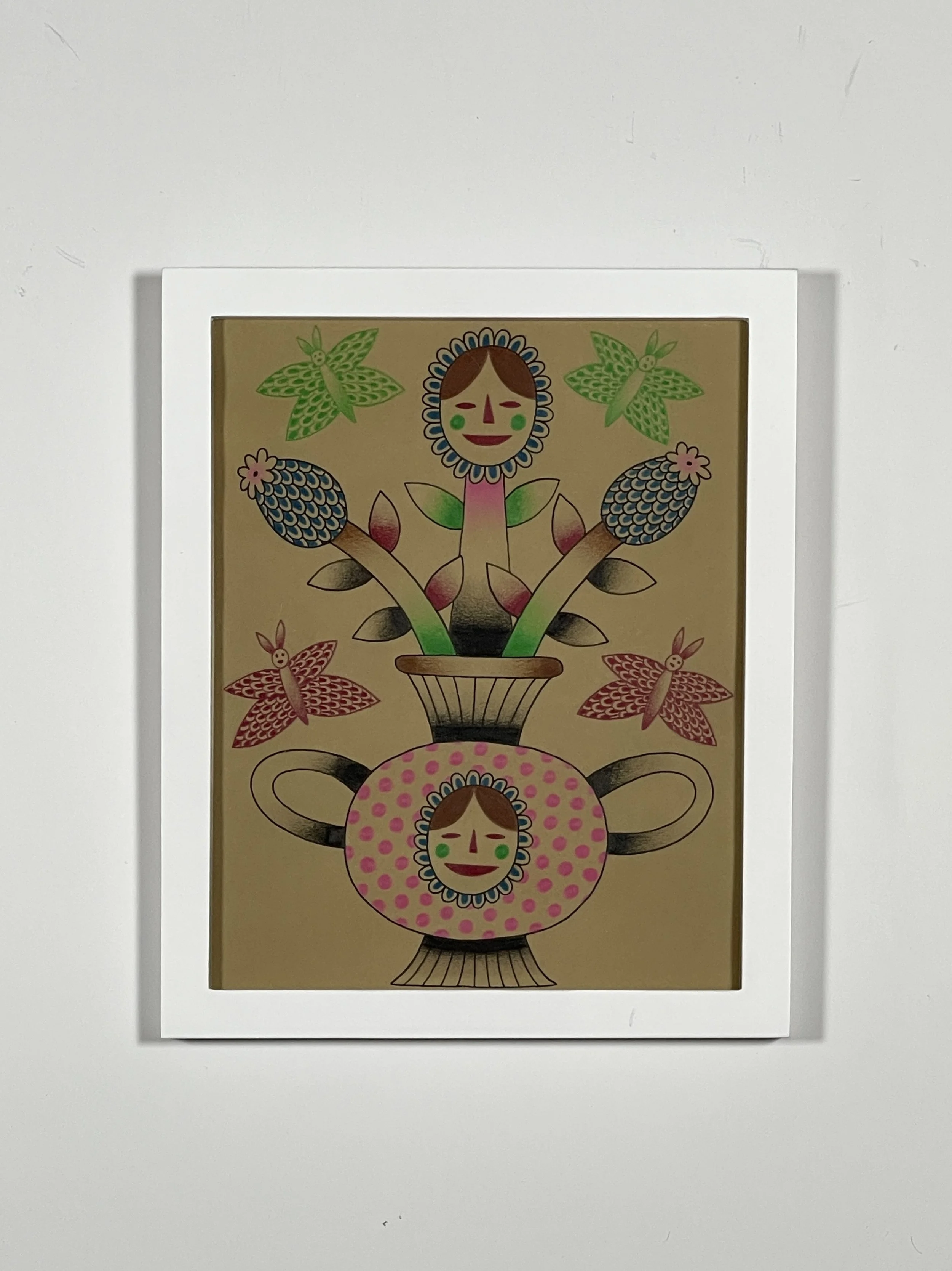 Starting in June 2021, I set aside my X-Acto knife indefinitely and began exploring drawing as my primary artistic medium. Working mostly with micron pens or oil-based colored pencils, the drawings in this collection were done over an almost three year period. They reflect my journey of self-discovery and the resulting creativity as I transformed into a new, different version of myself. The work gravitates between rotating styles, yet draws from a consistent visual language of patterns and motifs, as well as influences from my roots in surrealism, to folk and naive art, to the world of tattooing, which I worked in for three years until the pandemic in 2020.