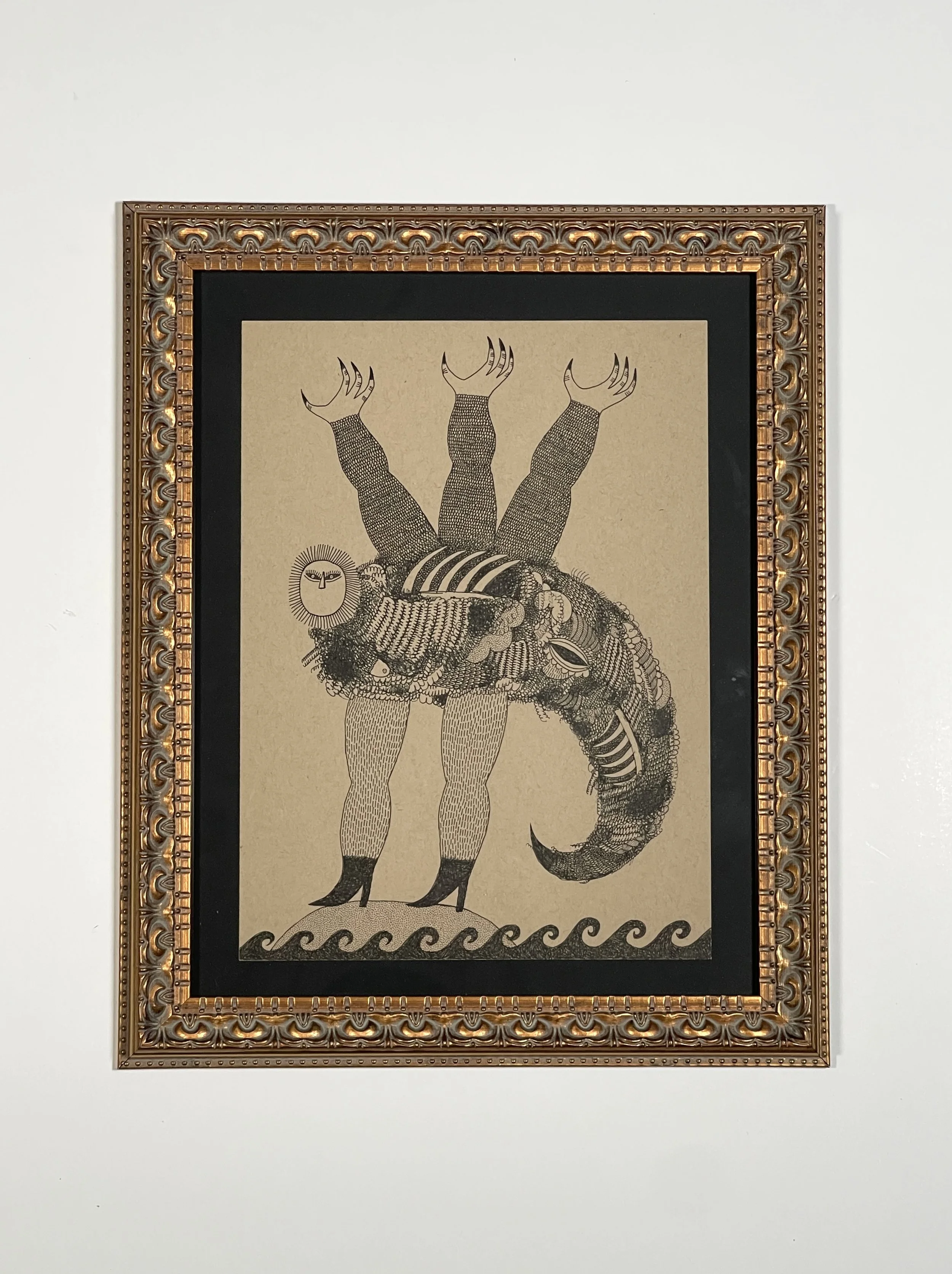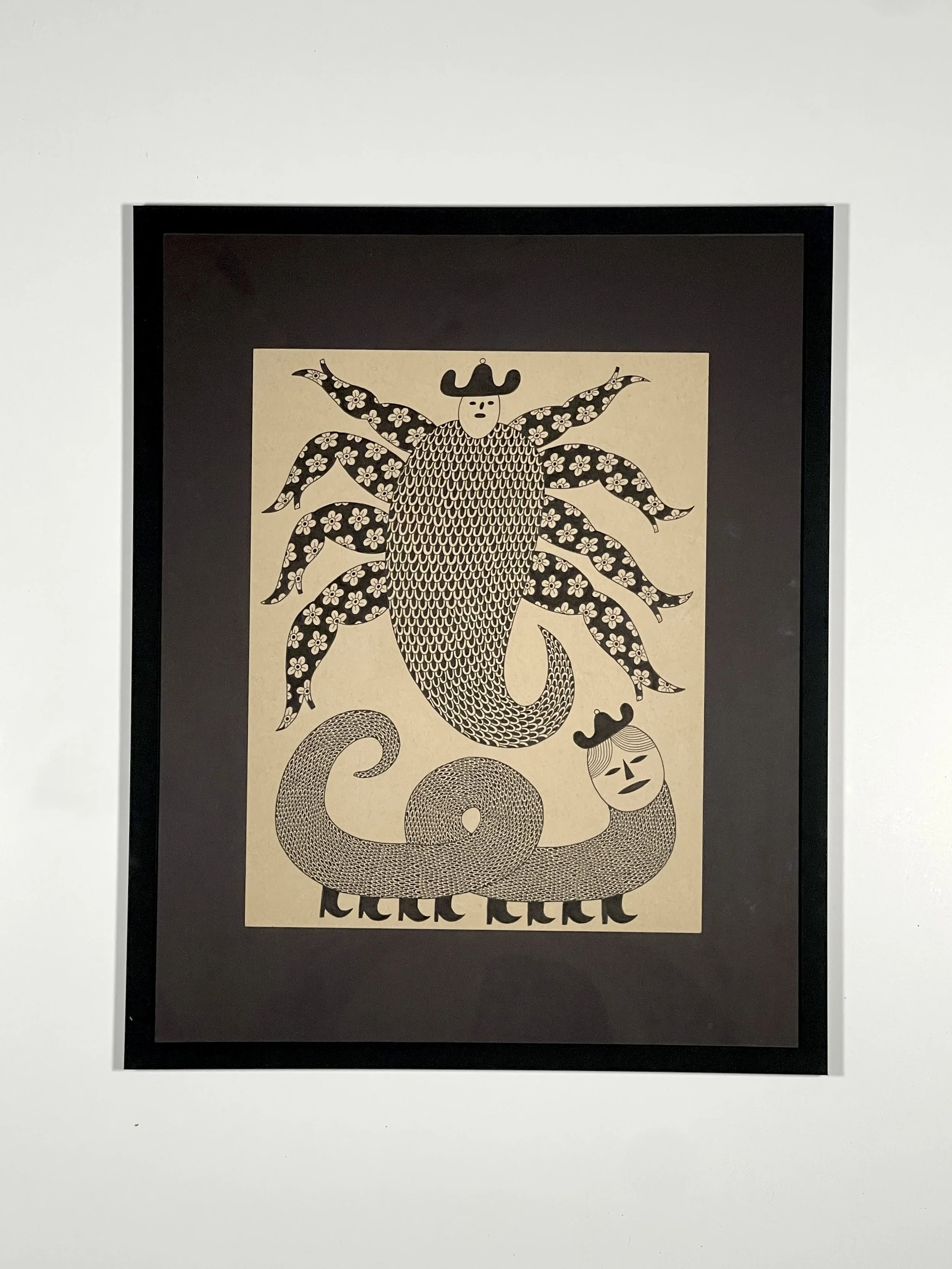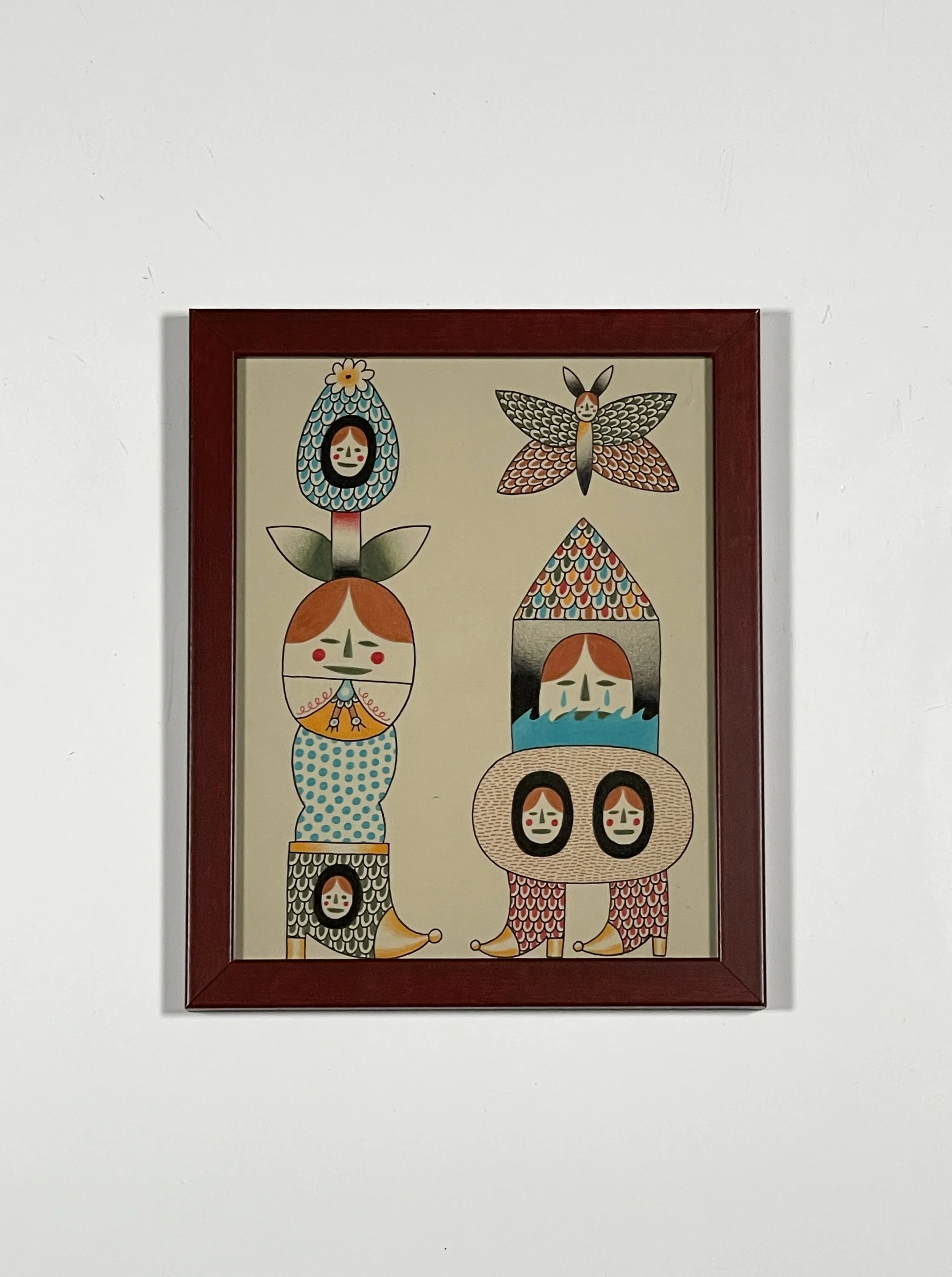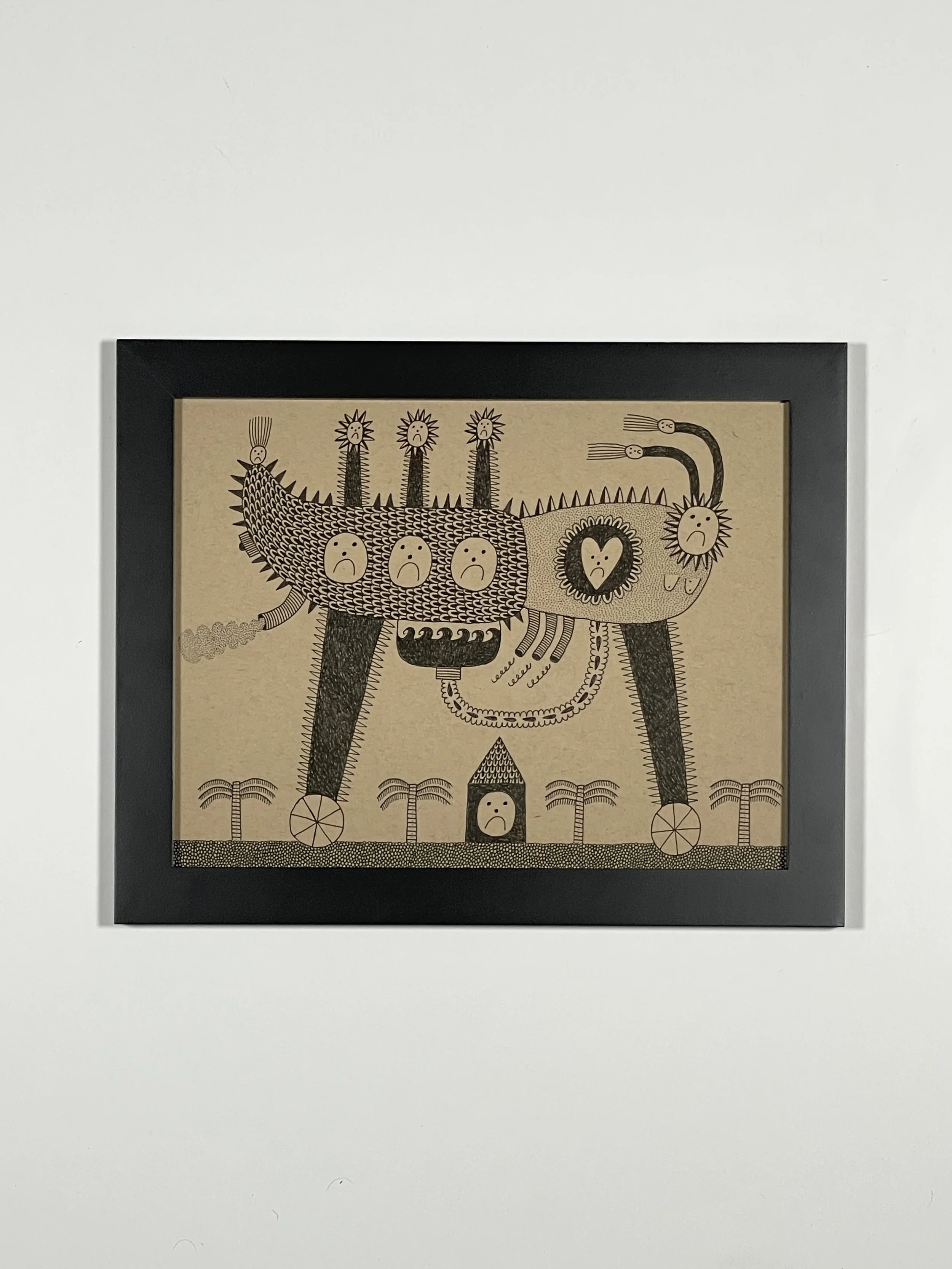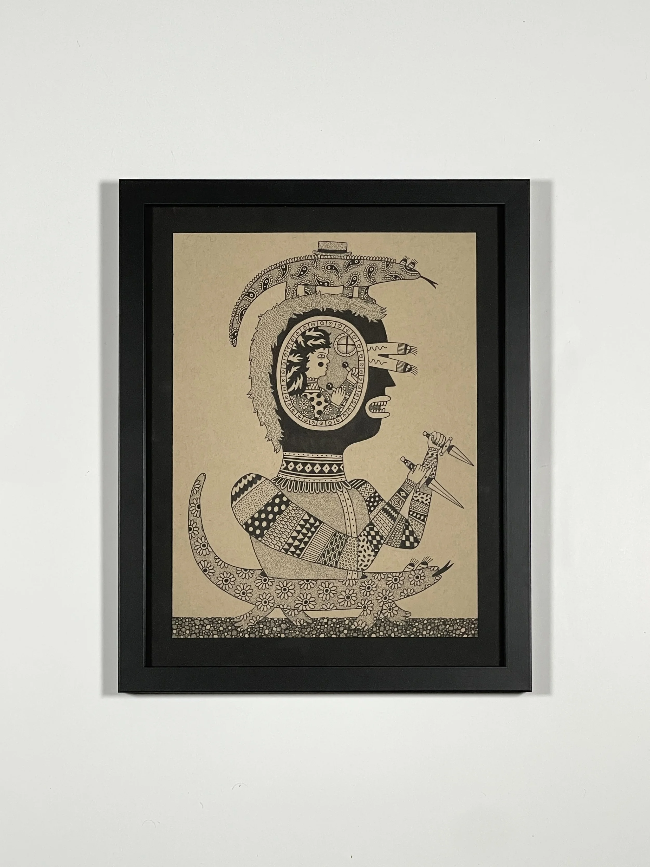 Starting in June 2021, I set aside my X-Acto knife indefinitely and began exploring drawing as my primary artistic medium. Working mostly with micron pens or oil-based colored pencils, the drawings in this collection were done over an almost three year period. They reflect my journey of self-discovery and the resulting creativity as I transformed into a new, different version of myself. The work gravitates between rotating styles, yet draws from a consistent visual language of patterns and motifs, as well as influences from my roots in surrealism, to folk and naive art, to the world of tattooing, which I worked in for three years until the pandemic in 2020.