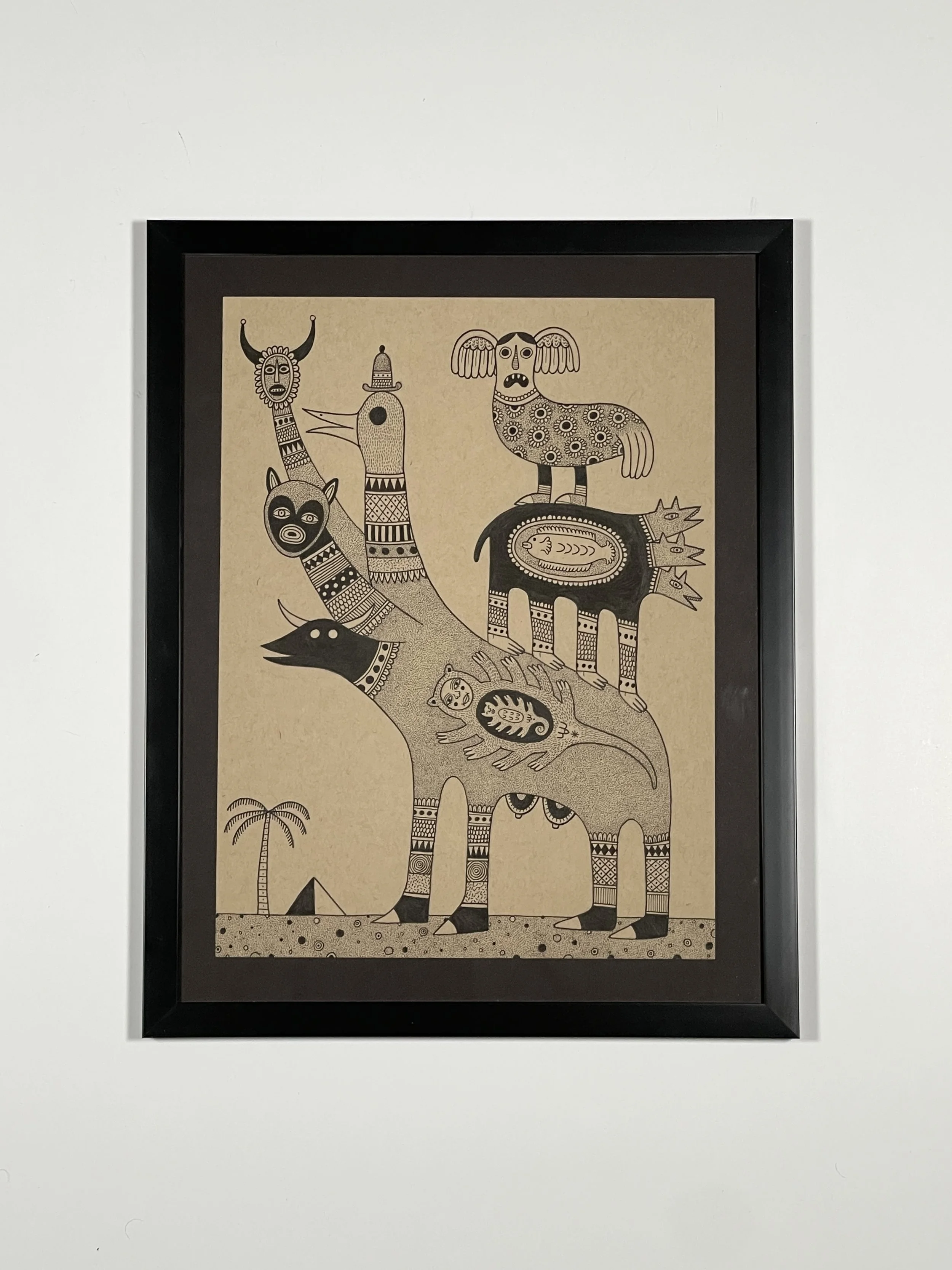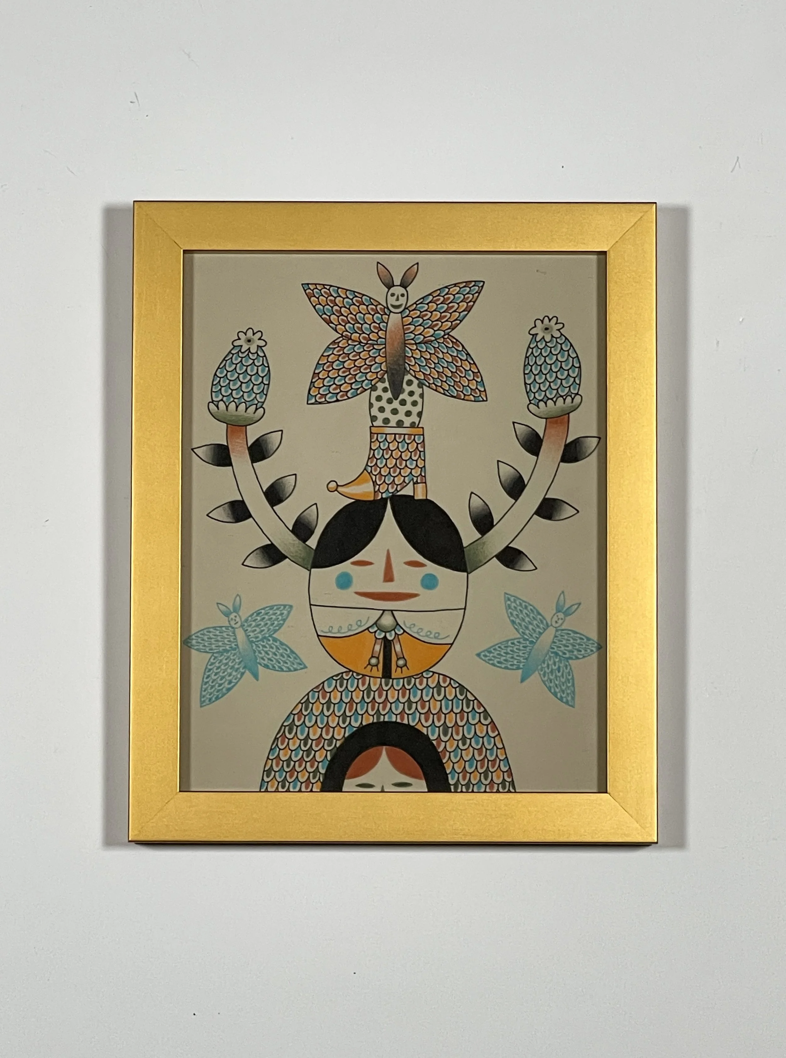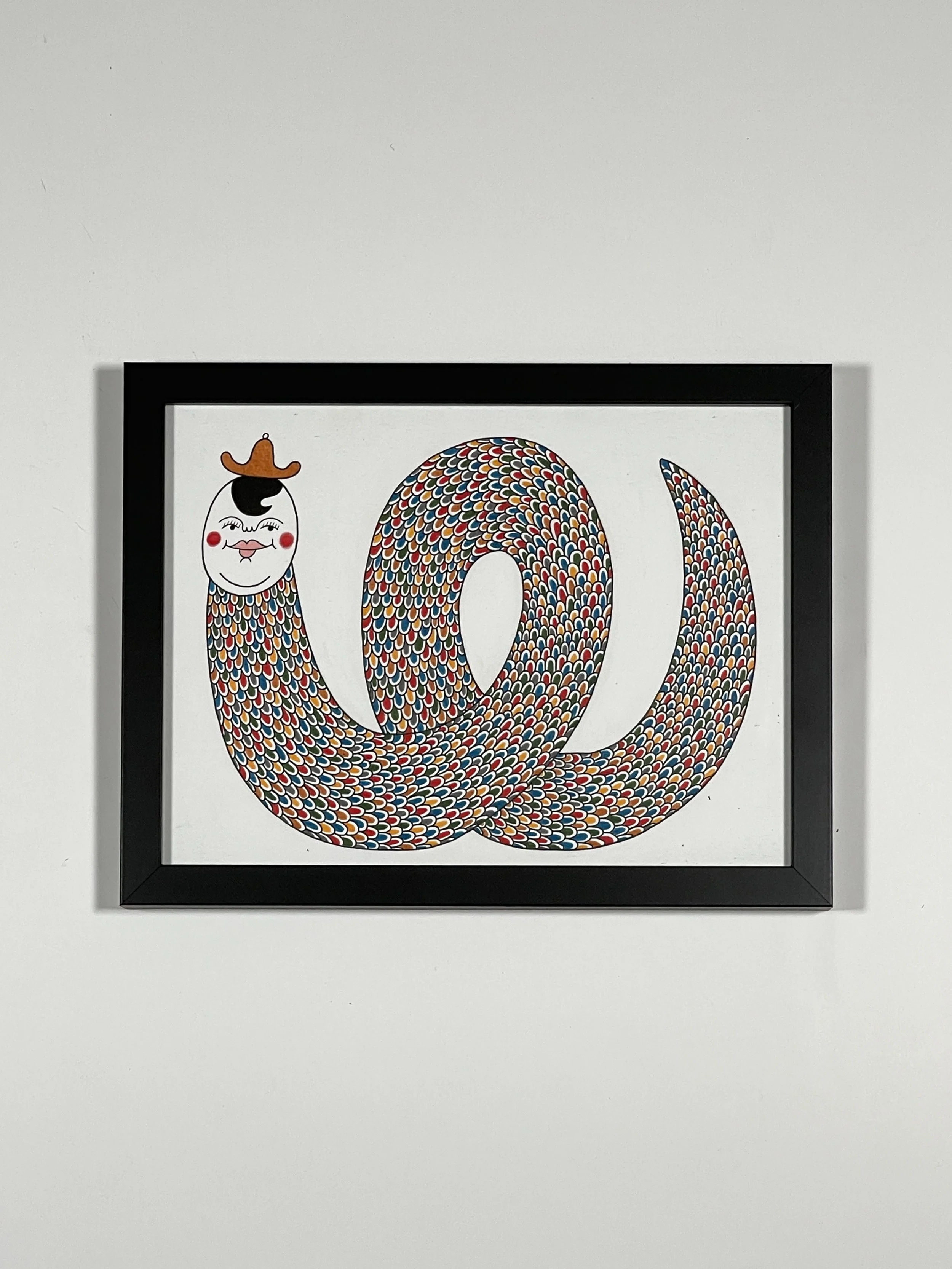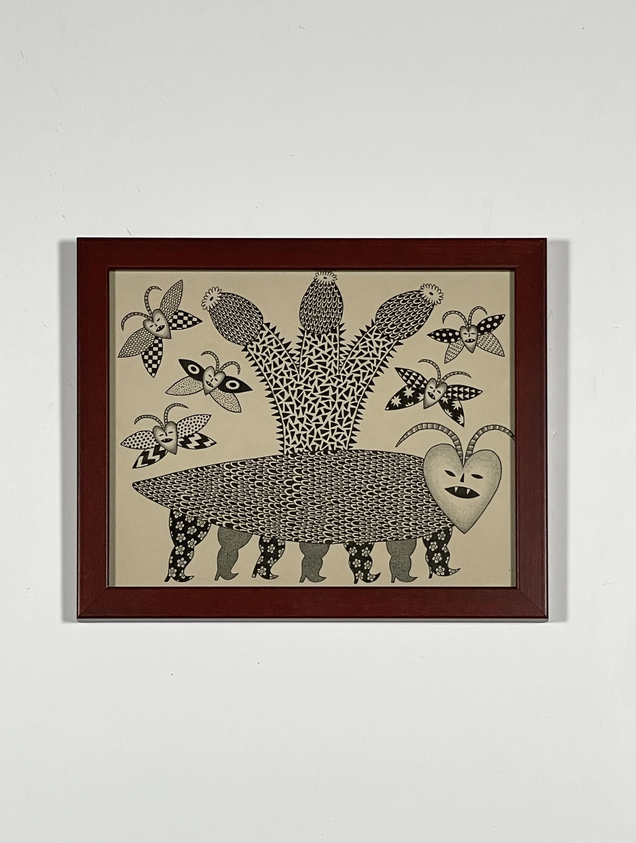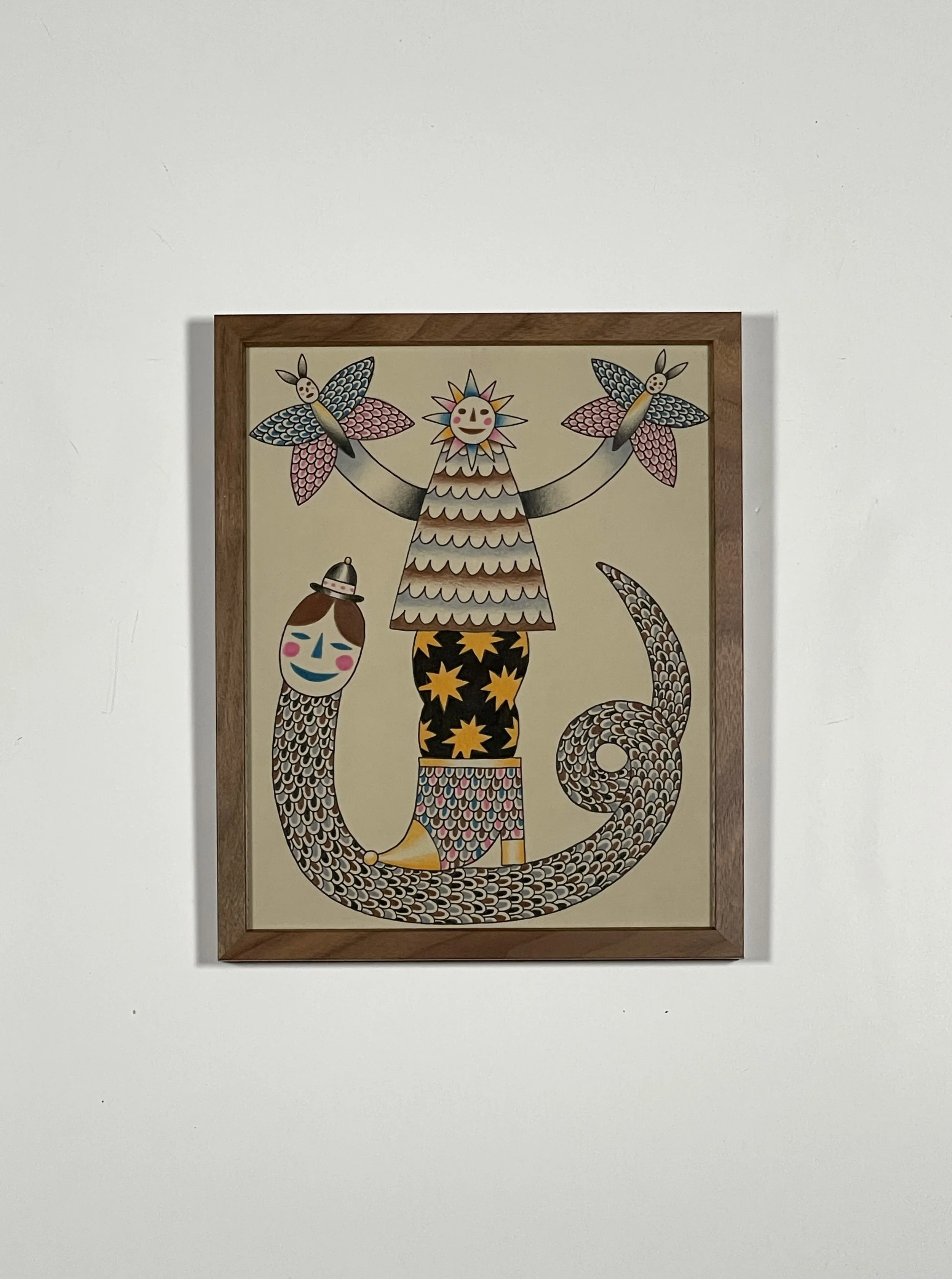 Starting in June 2021, I set aside my X-Acto knife indefinitely and began exploring drawing as my primary artistic medium. Working mostly with micron pens or oil-based colored pencils, the drawings in this collection were done over an almost three year period. They reflect my journey of self-discovery and the resulting creativity as I transformed into a new, different version of myself. The work gravitates between rotating styles, yet draws from a consistent visual language of patterns and motifs, as well as influences from my roots in surrealism, to folk and naive art, to the world of tattooing, which I worked in for three years until the pandemic in 2020.