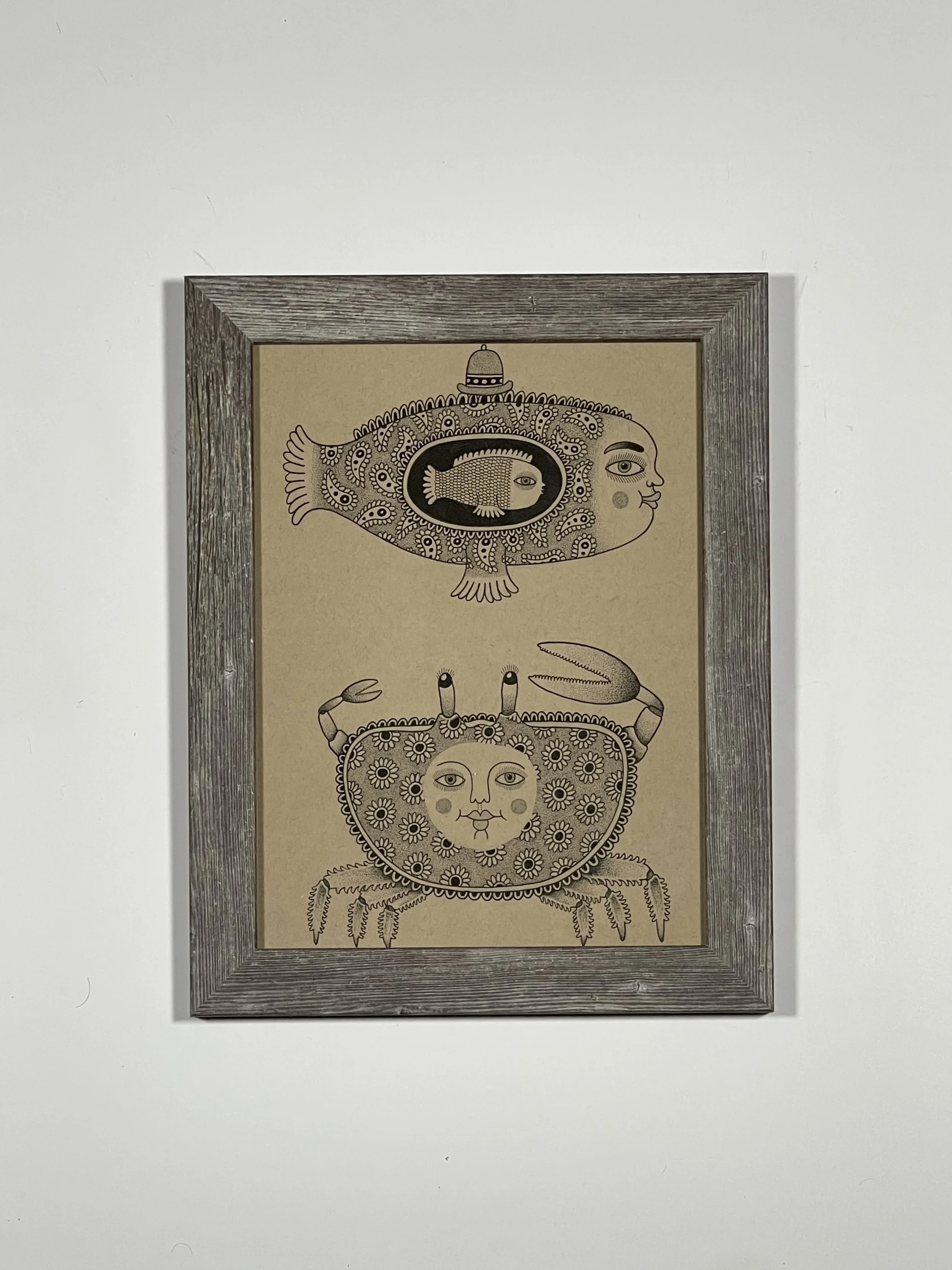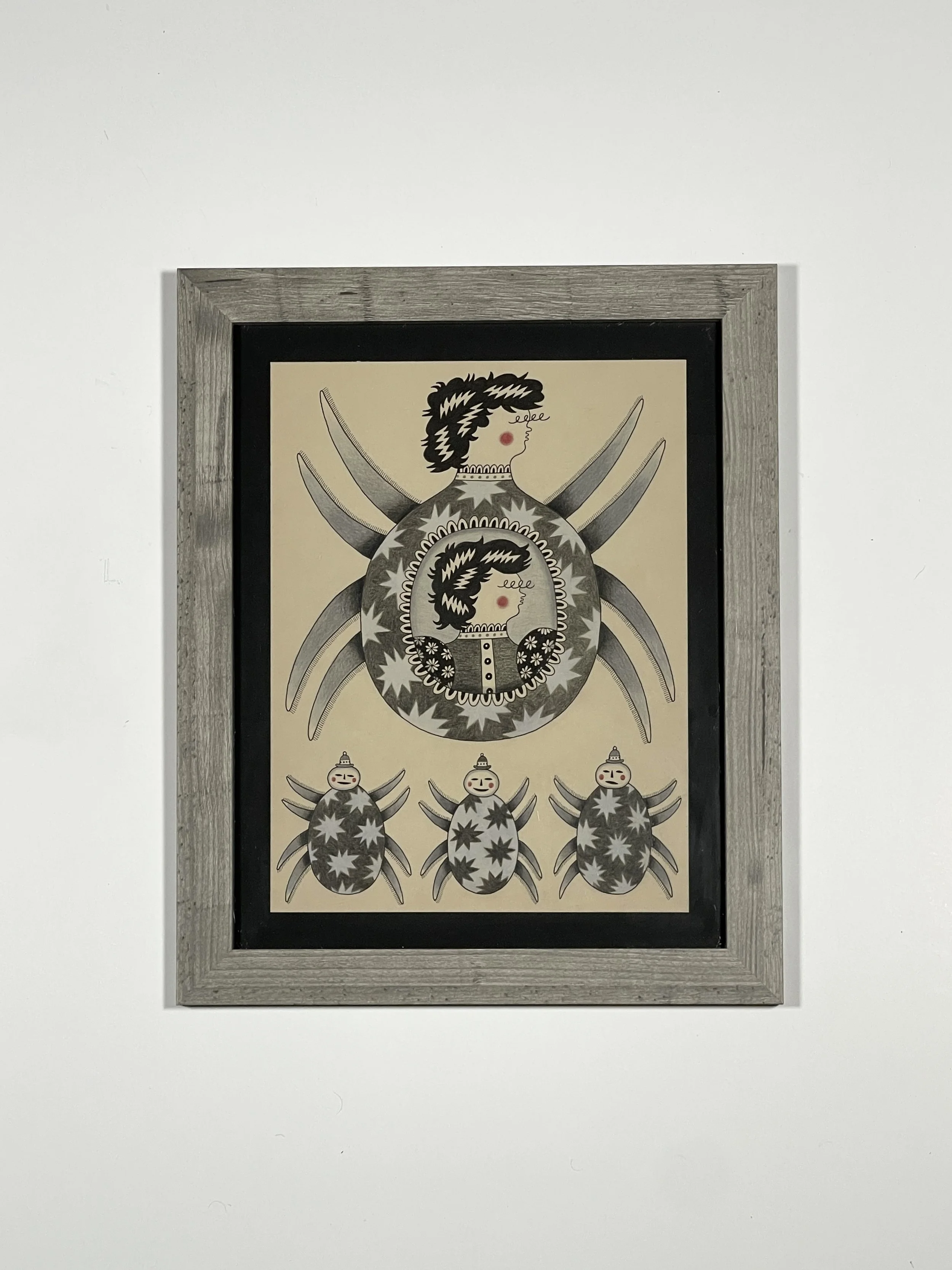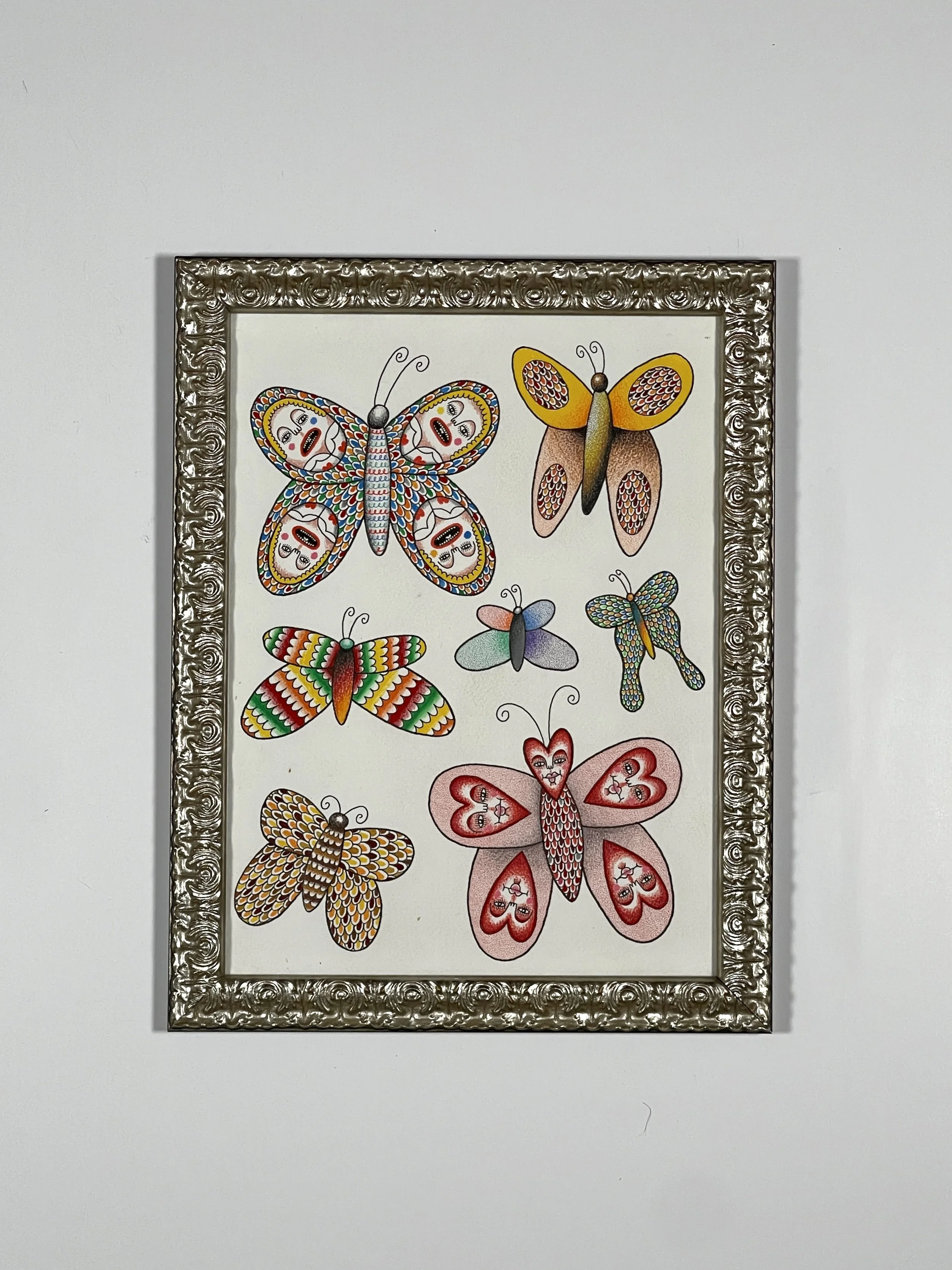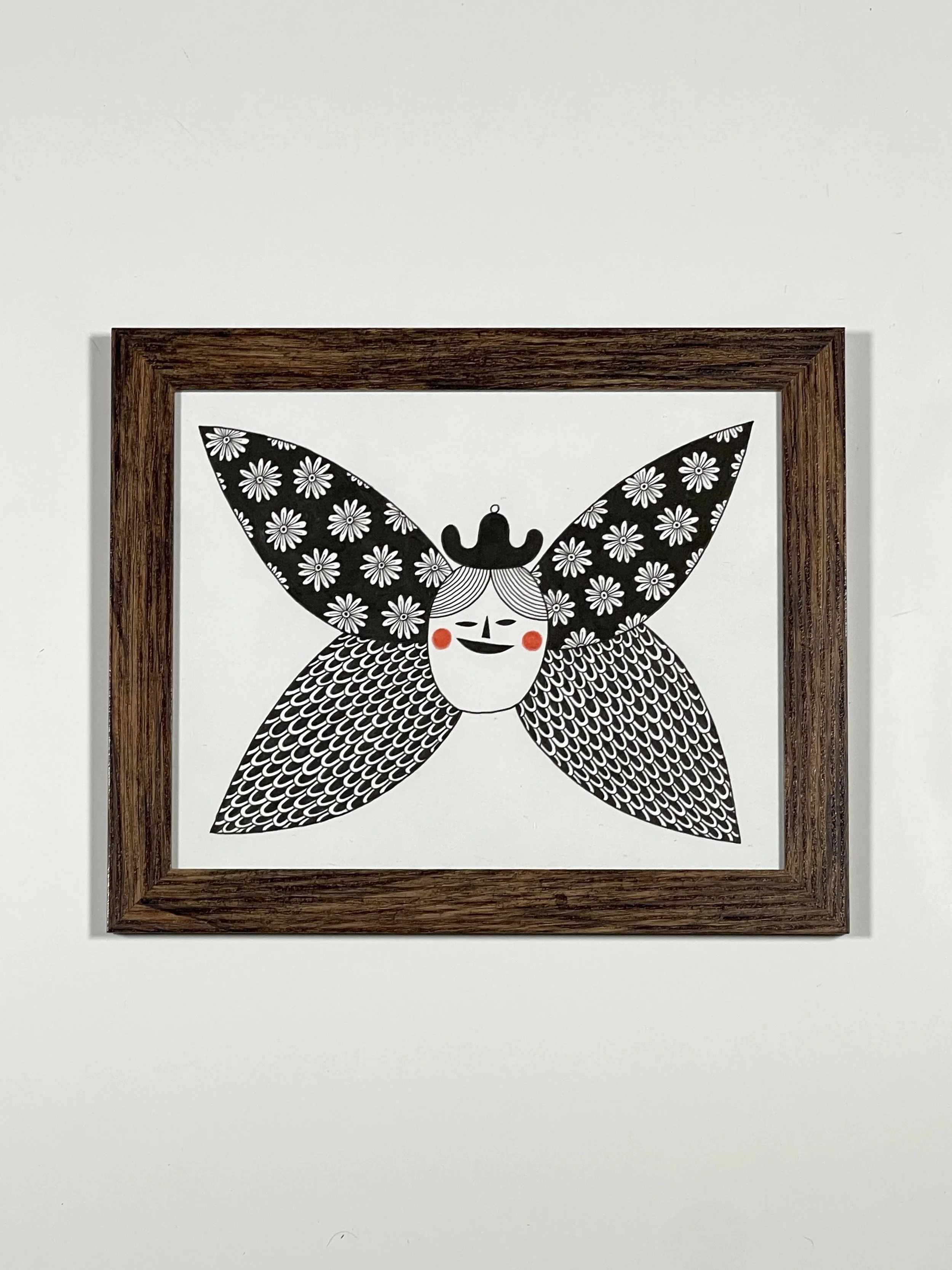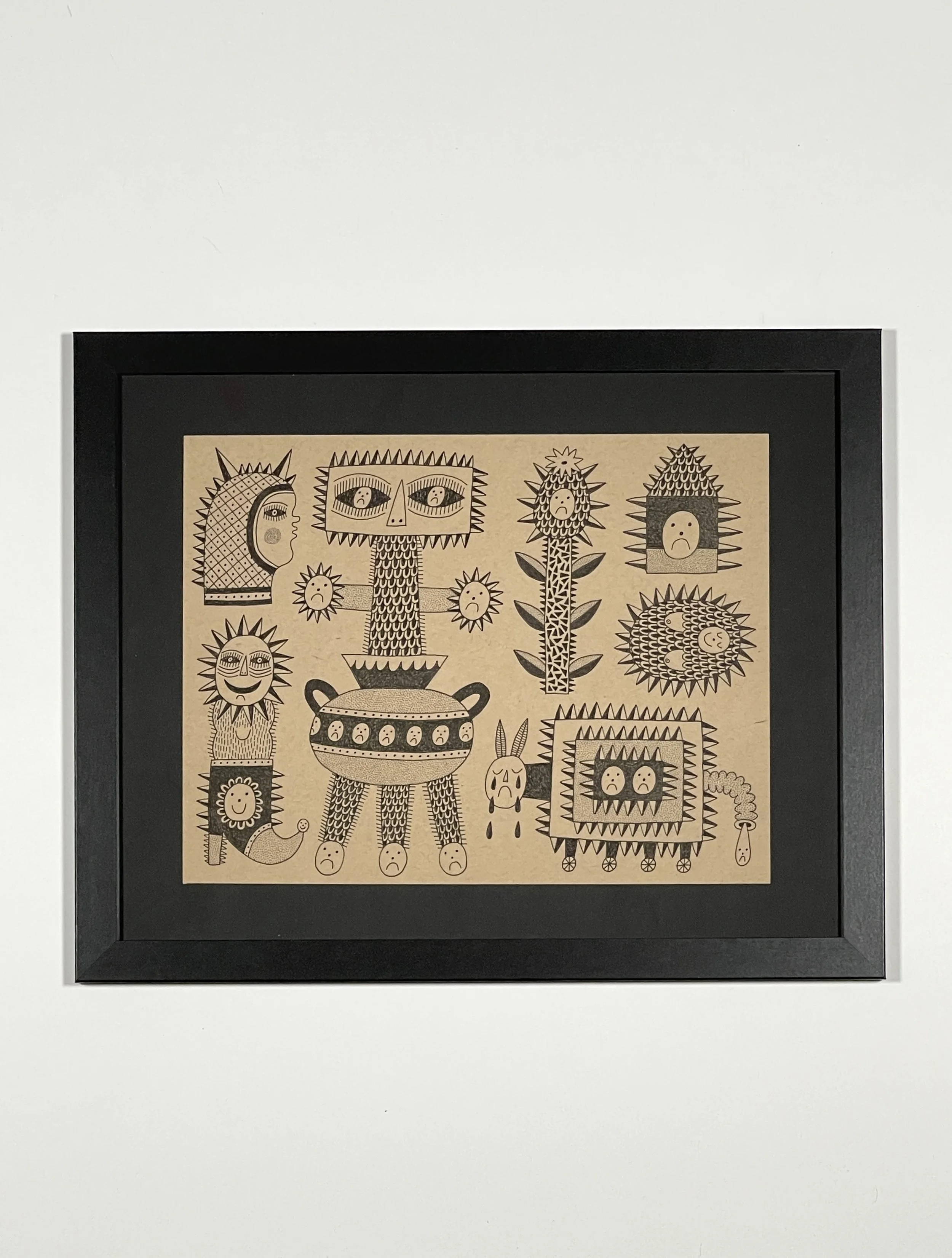 Starting in June 2021, I set aside my X-Acto knife indefinitely and began exploring drawing as my primary artistic medium. Working mostly with micron pens or oil-based colored pencils, the drawings in this collection were done over an almost three year period. They reflect my journey of self-discovery and the resulting creativity as I transformed into a new, different version of myself. The work gravitates between rotating styles, yet draws from a consistent visual language of patterns and motifs, as well as influences from my roots in surrealism, to folk and naive art, to the world of tattooing, which I worked in for three years until the pandemic in 2020.