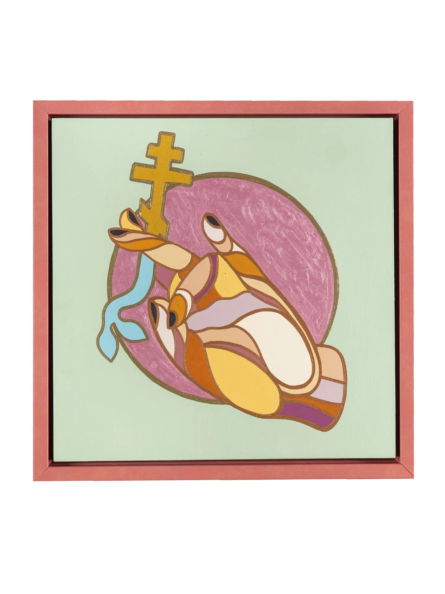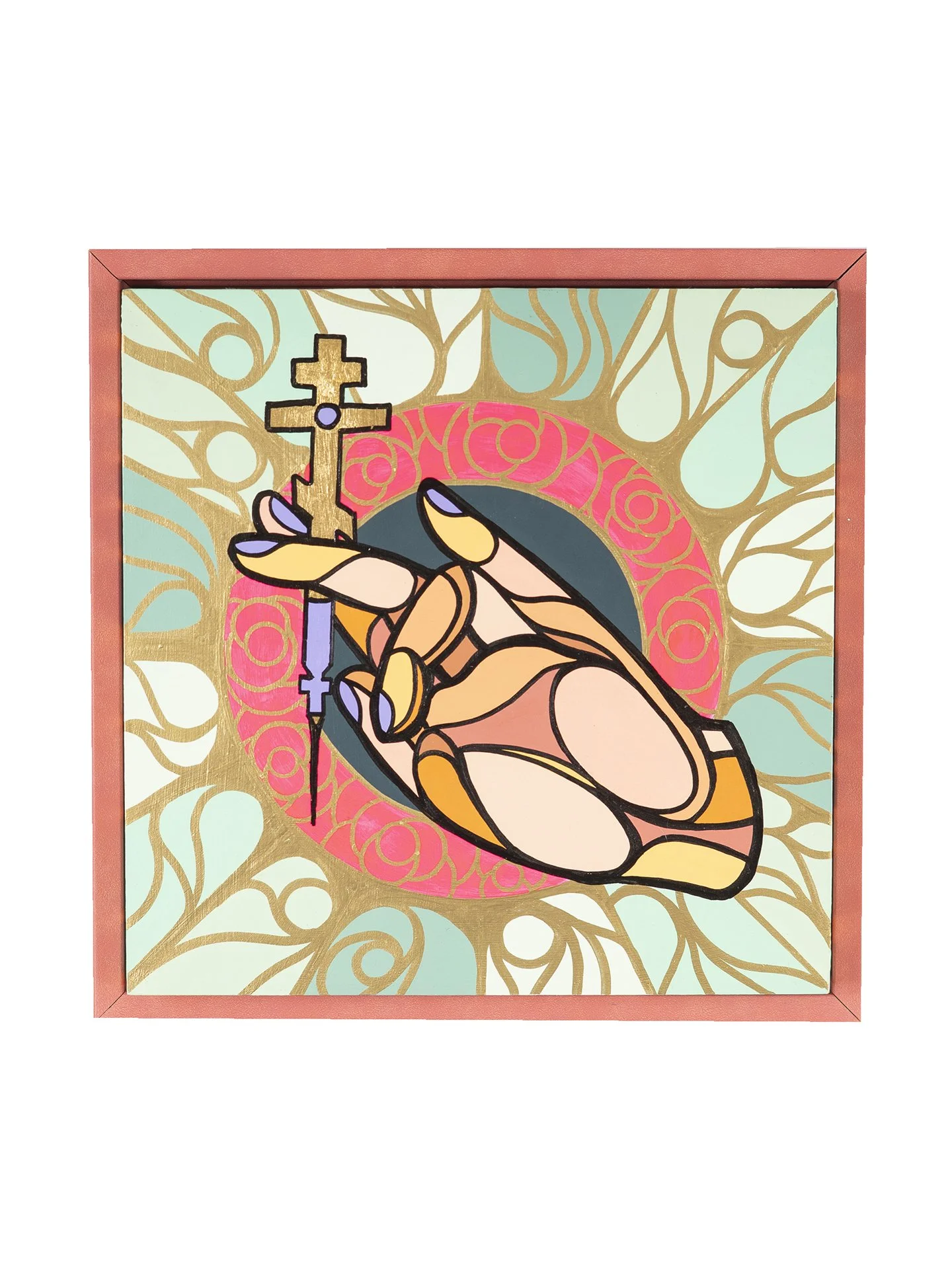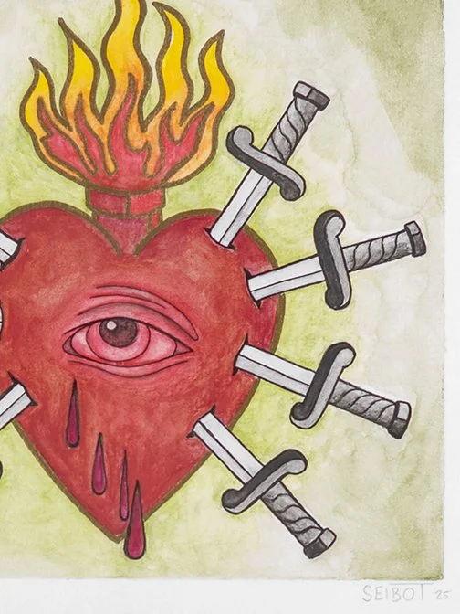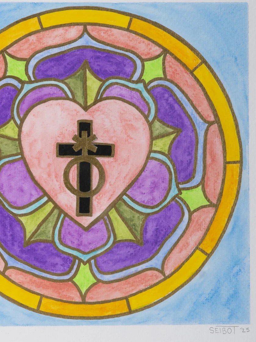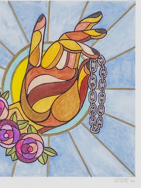 Be Not Afraid is the debut solo exhibition by KT Seibert (aka Seibot), a collection of paintings, stained glass, and devotional icons made during a year of personal upheaval, transformation, and creative reckoning. The show reimagines Catholic and Orthodox visual language through a queer and trans lens—infusing traditional symbols like sacred hearts, halos, and crosses with bright color, glitter, and defiant joy.