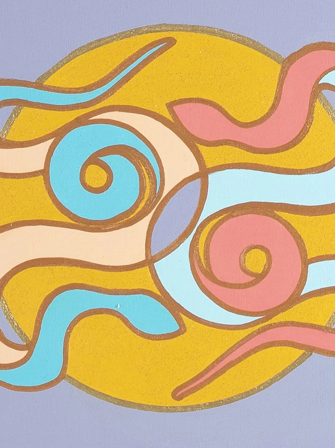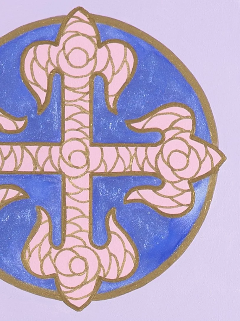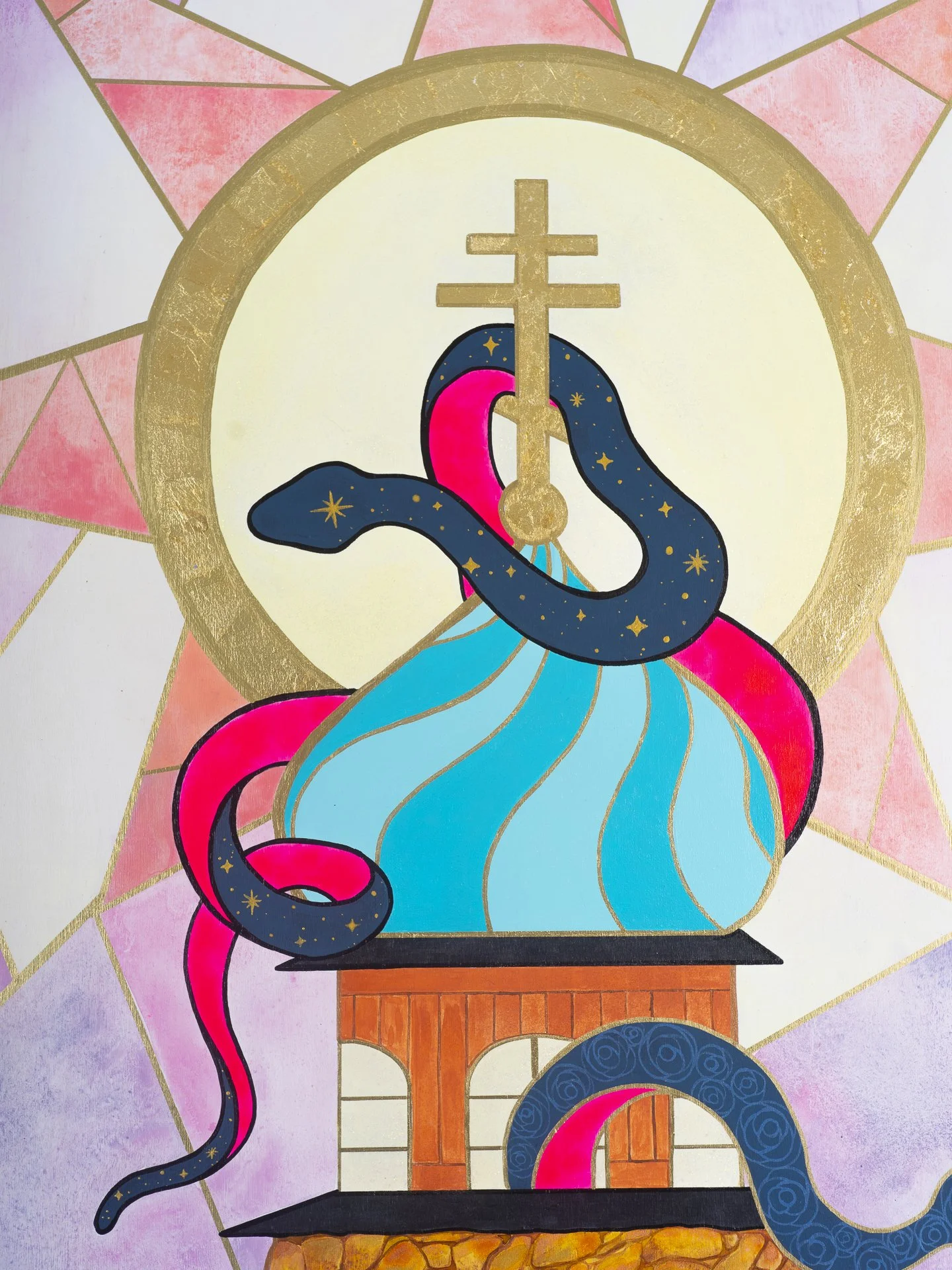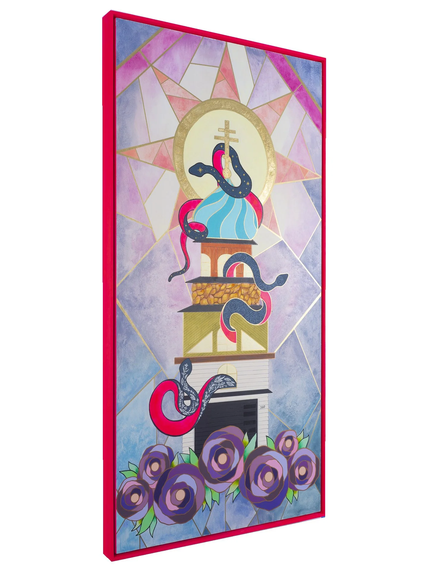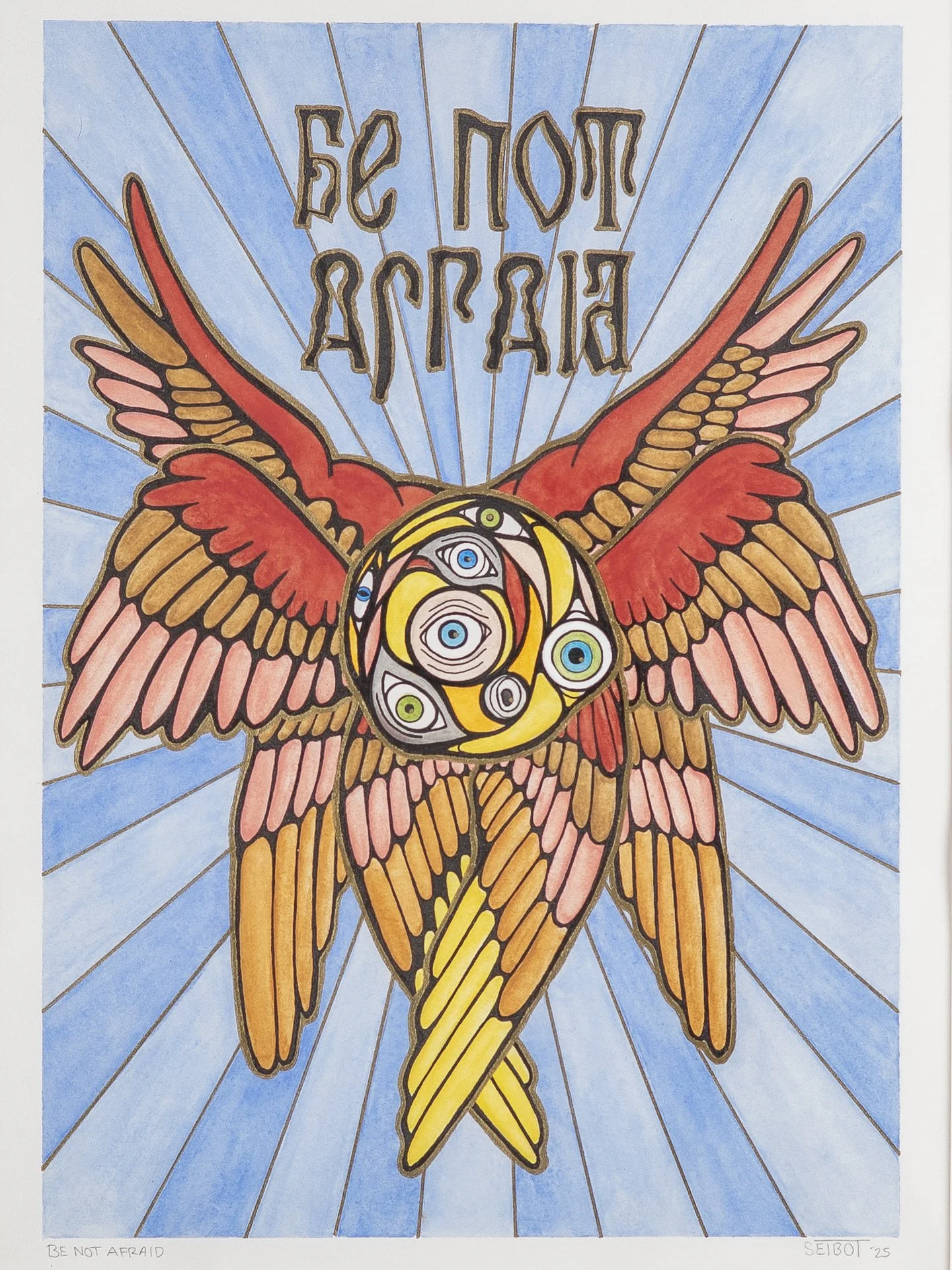 Be Not Afraid is the debut solo exhibition by KT Seibert (aka Seibot), a collection of paintings, stained glass, and devotional icons made during a year of personal upheaval, transformation, and creative reckoning. The show reimagines Catholic and Orthodox visual language through a queer and trans lens—infusing traditional symbols like sacred hearts, halos, and crosses with bright color, glitter, and defiant joy.