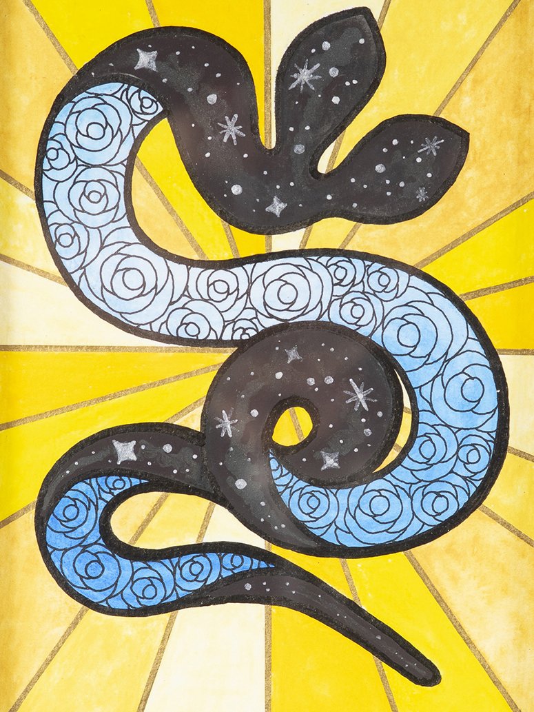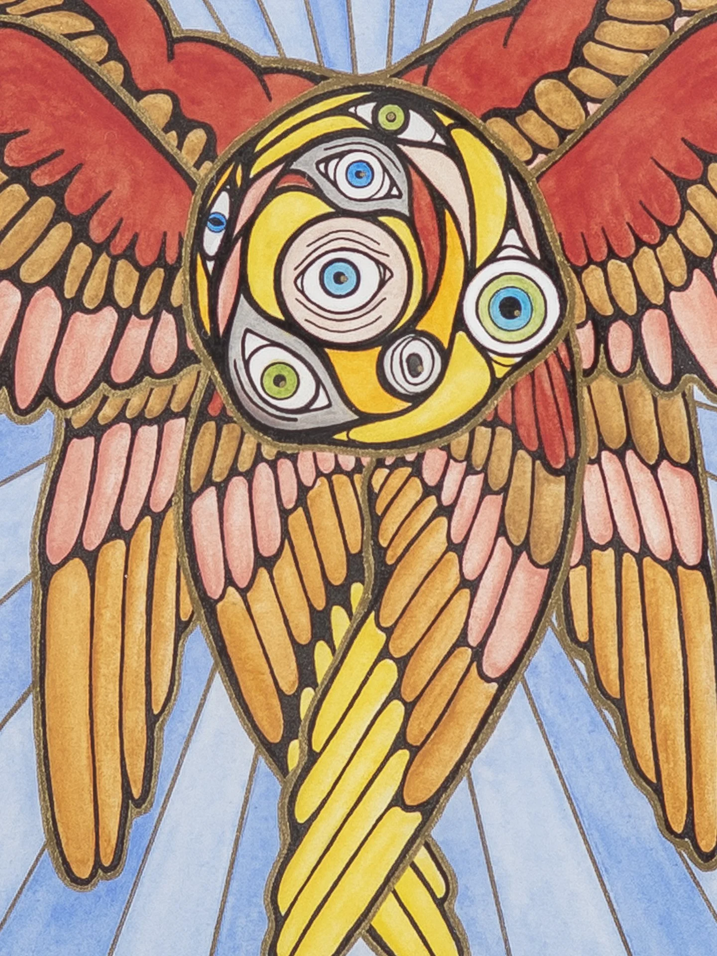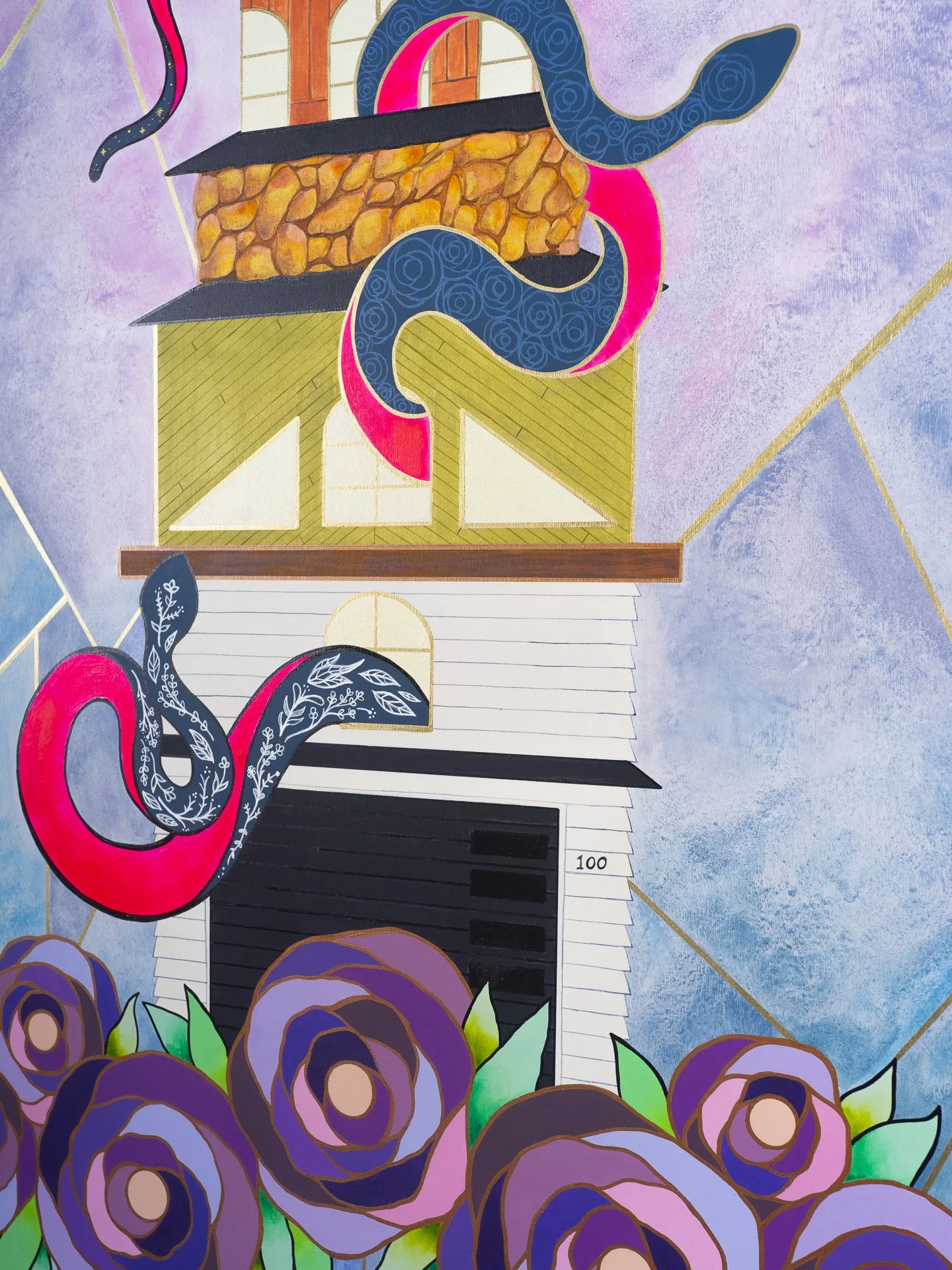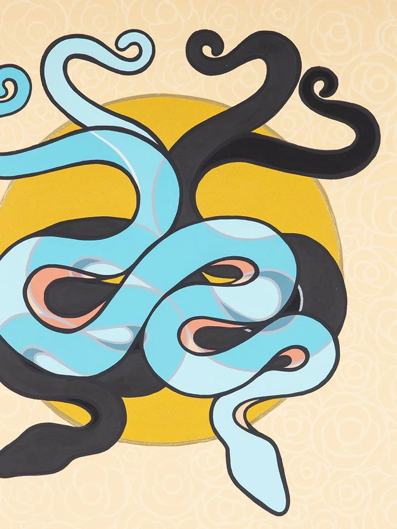 Each piece is a prayer, a process, a portrait of survival. Expect serpents, stars, sacred hearts, keys, and flames. Heavy themes, wrapped in radiant color.