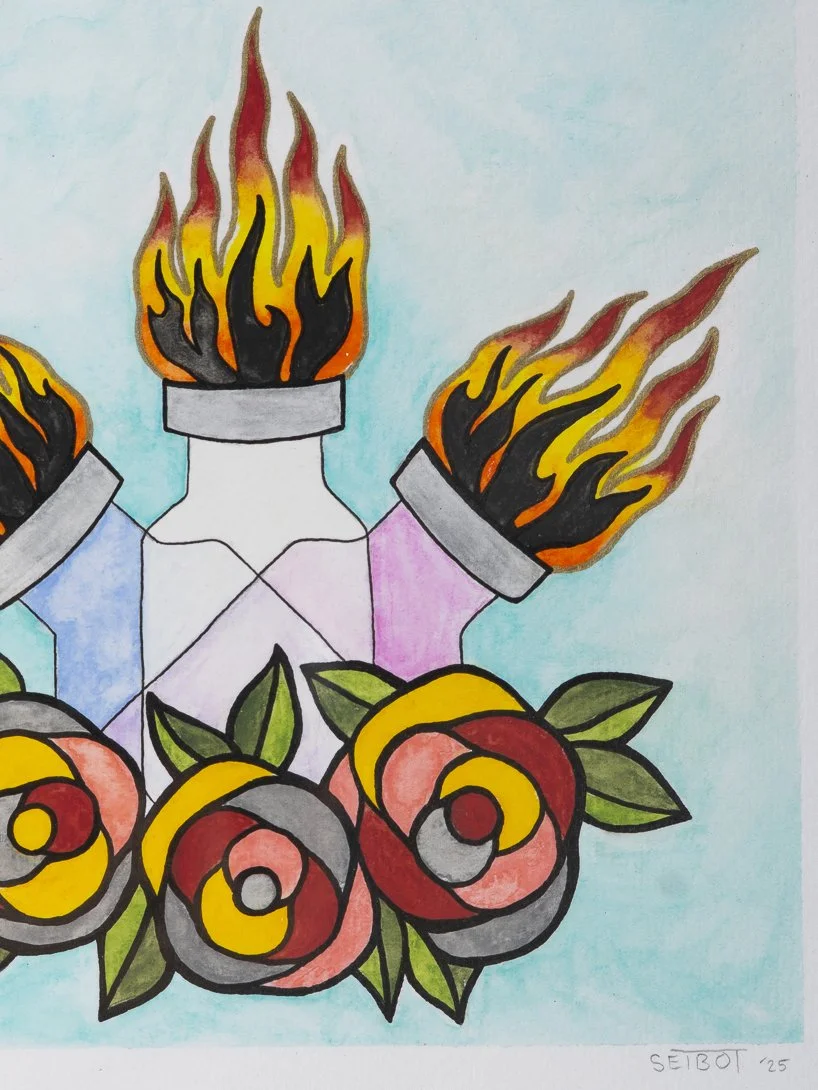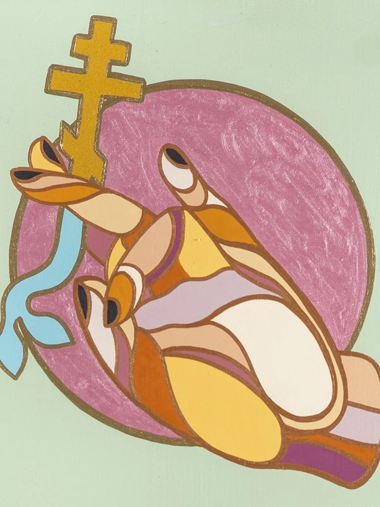 Raised Catholic, and deeply influenced by the Russian Orthodox icons painted and collected by their great-grandfather, Seibot creates work that’s both reverent and subversive—an altar of bright resistance built from the inherited materials of their upbringing. “I’ve always felt I’d be queer and trans in any era,” they explain. “If I had been born in medieval times, I would’ve joined a monastery and spent my life making painstakingly detailed religious art.” That thought experiment became a guiding force in the work.