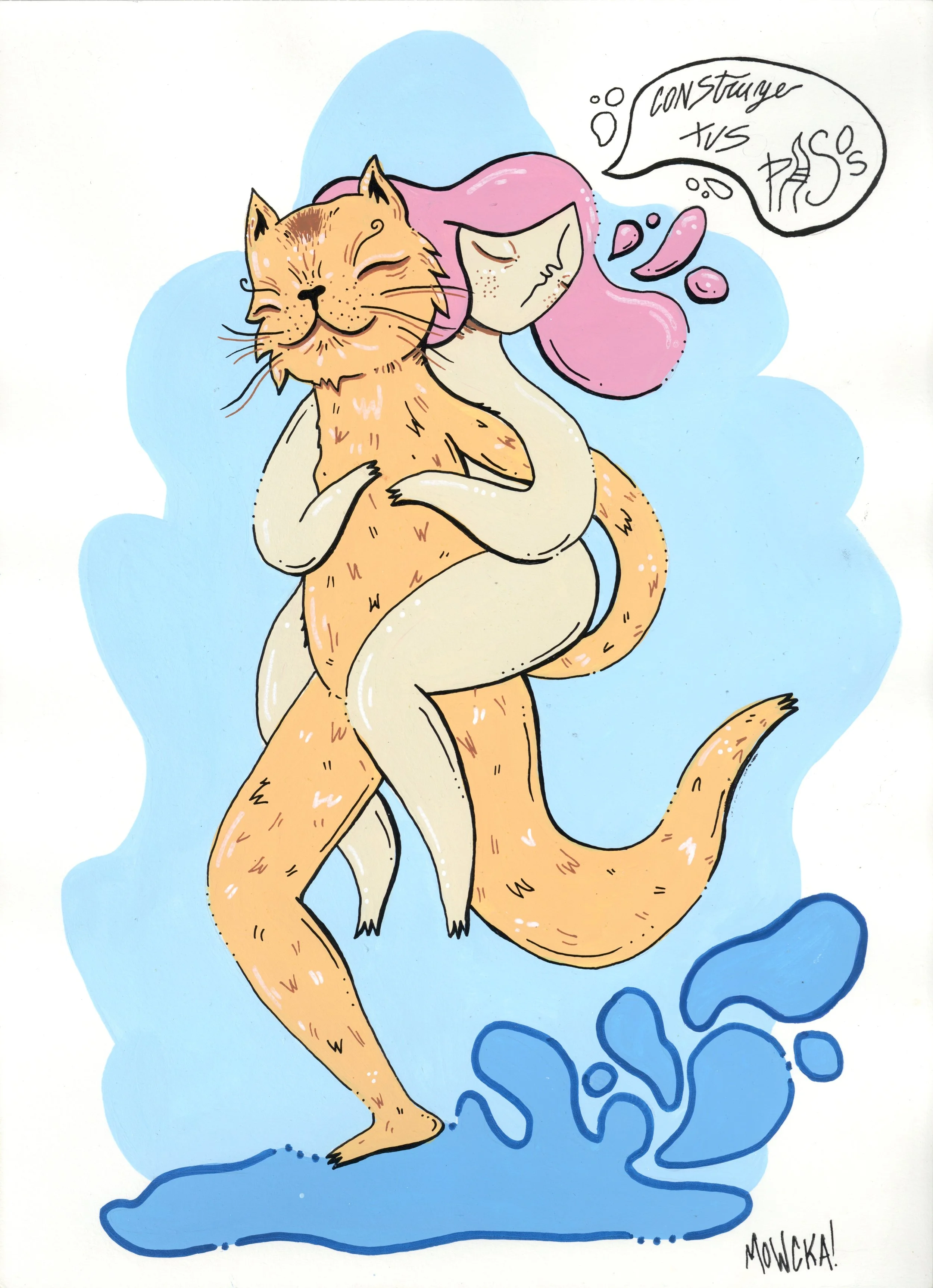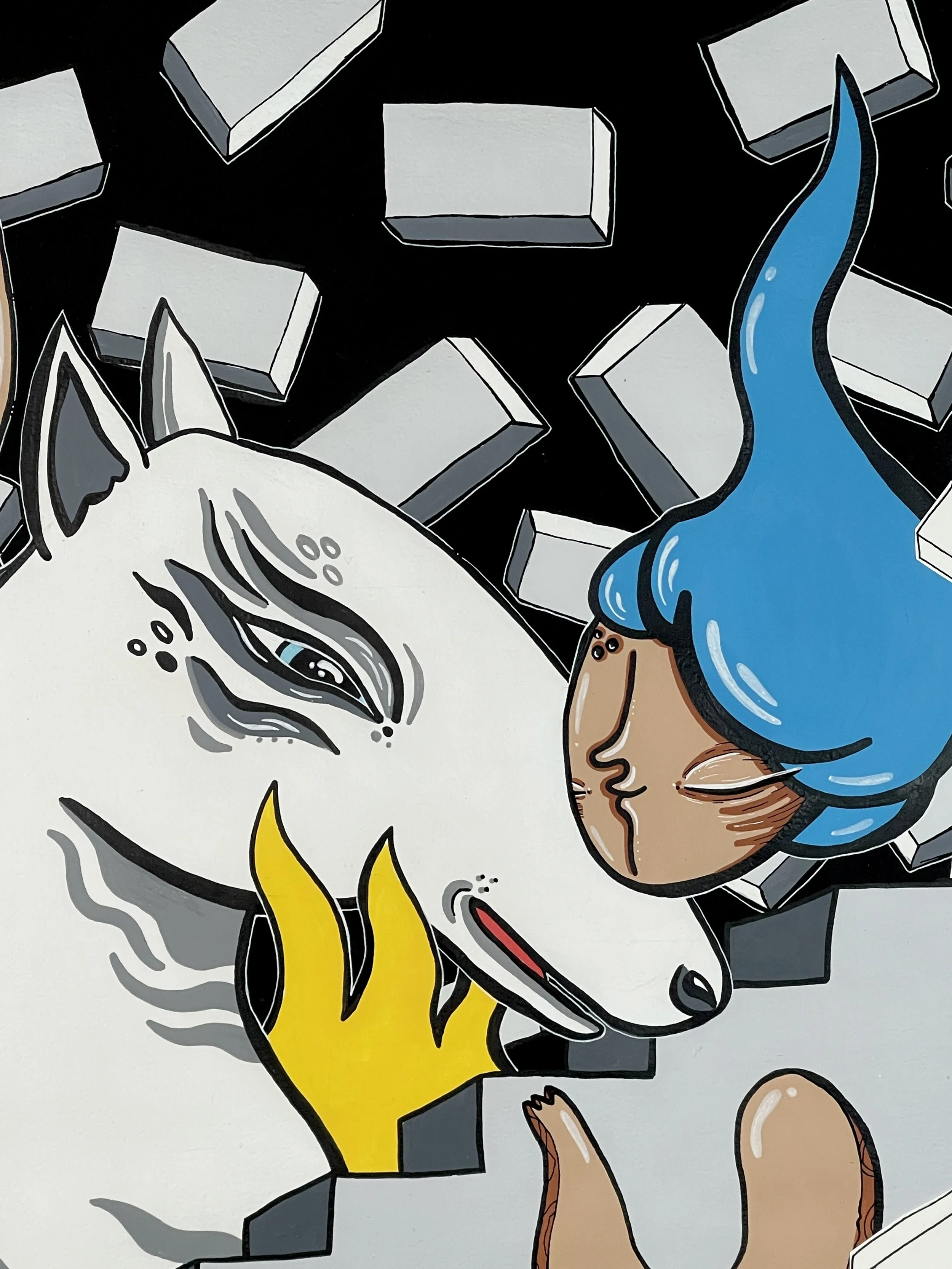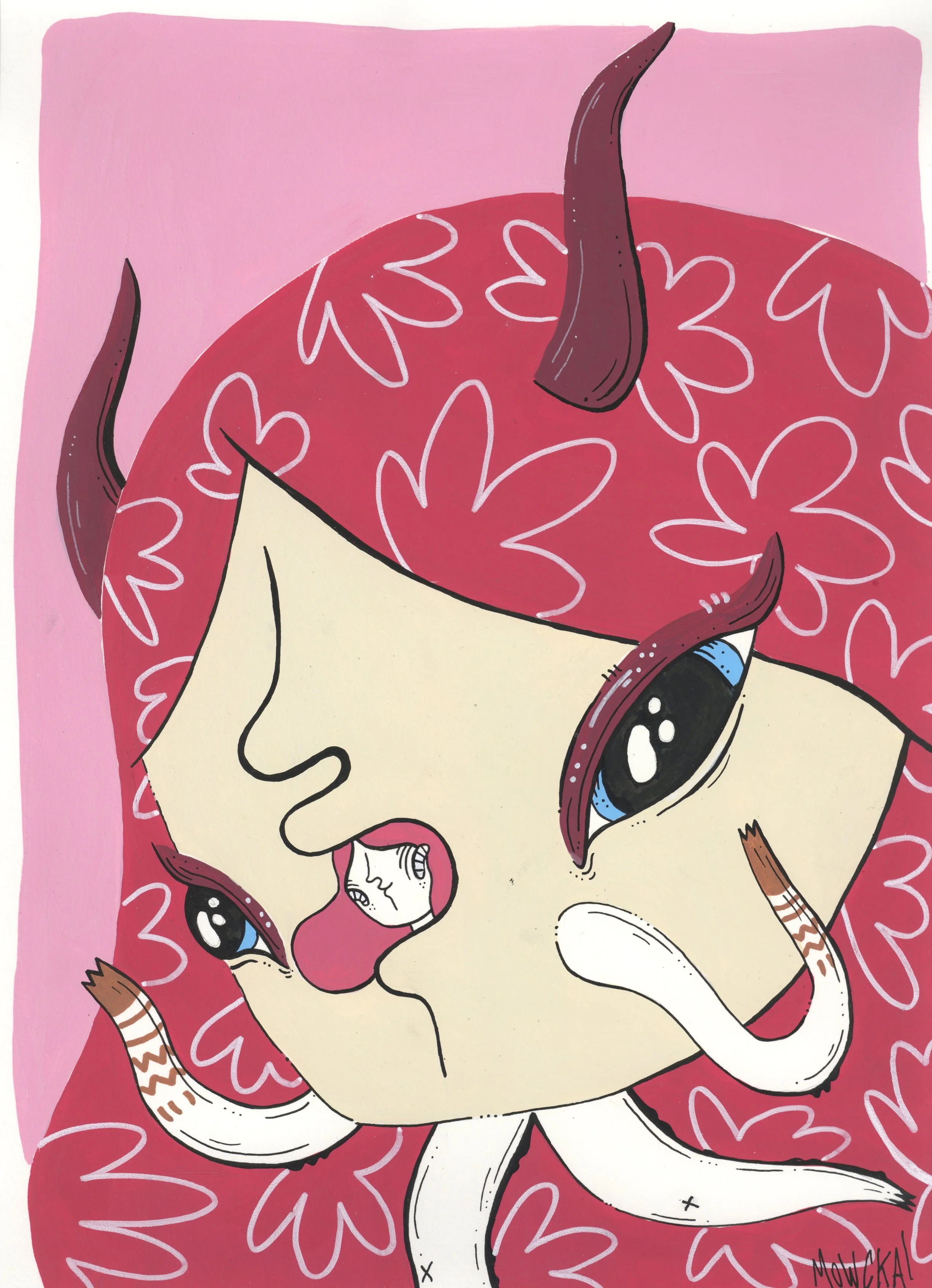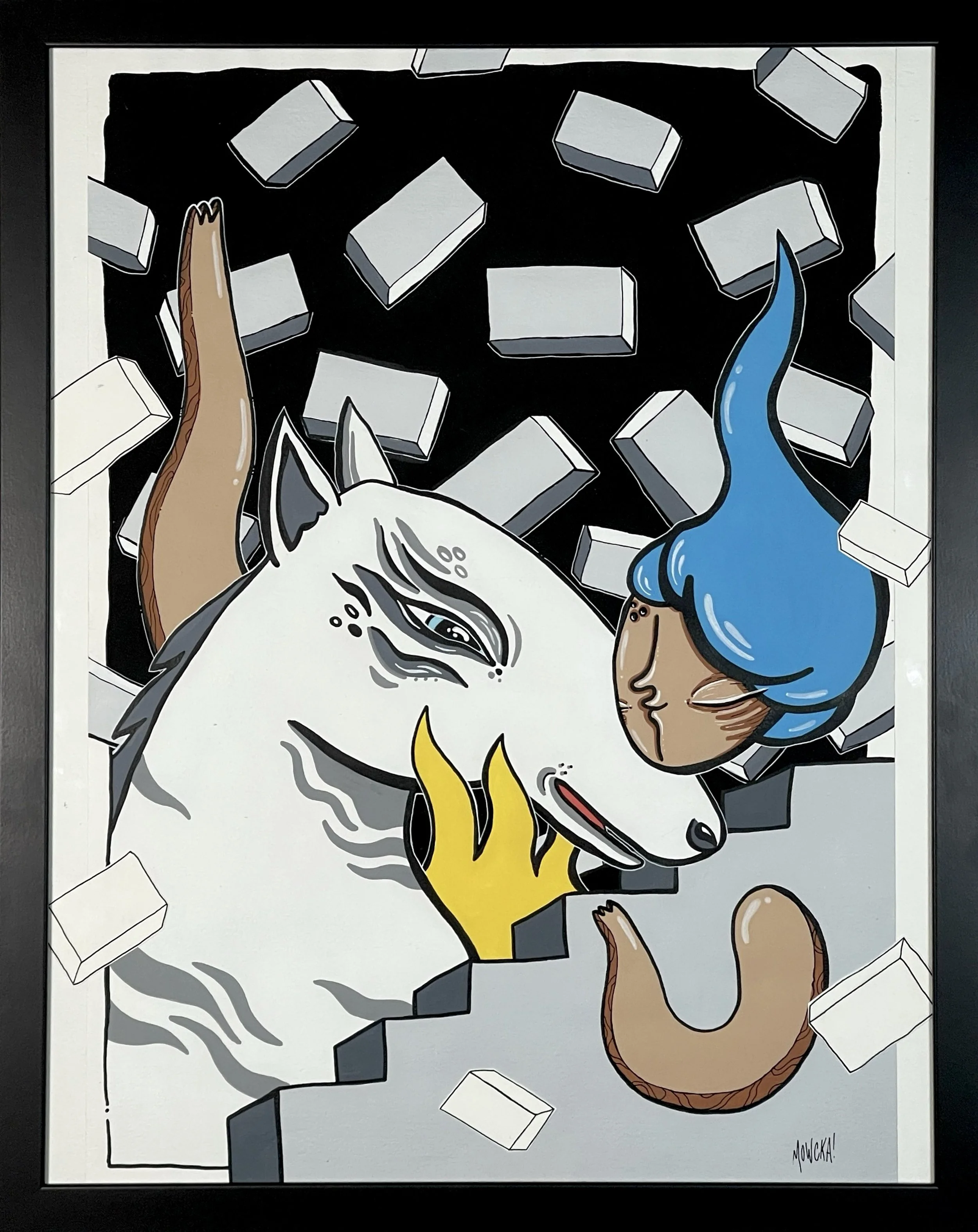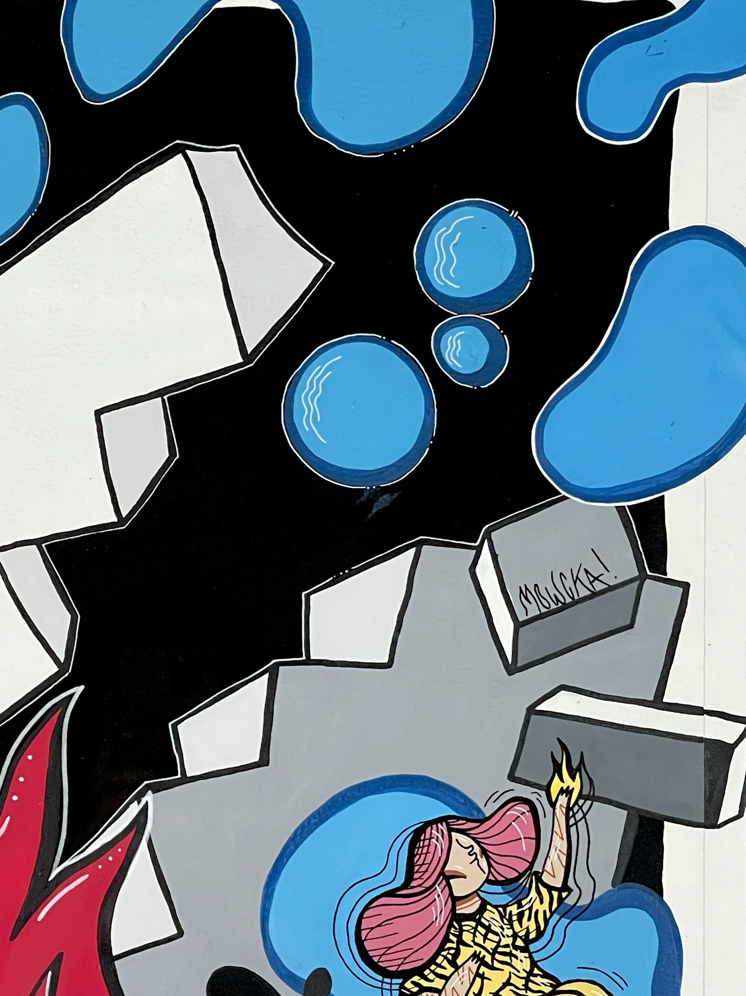 “Merging Pathways” brings the artwork of our dear friend and prolific international street artist Mowcka here to San Francisco, via our friends and neighbors Mini Mart Gallery who leant us their space to organize this exhibition. Born in Argentina, but living between Barcelona and London for the past 13 years, Mowcka has steadily established herself as one of the most prominent street artists in Western Europe and the UK. Now, after 4 months of travel in Argentina and Mexico, she has concluded her journey here with us in California with a new body of work featuring several new pieces made over the course of two continents, and some of which were finished or created entirely here at Moth Belly Gallery in the days preceding the opening. The work explores the importance of dreams, the inevitability of fate, and lastly the artist’s ongoing conflict between being a metropolitan artist yet constantly yearning for a return to nature and the natural world.