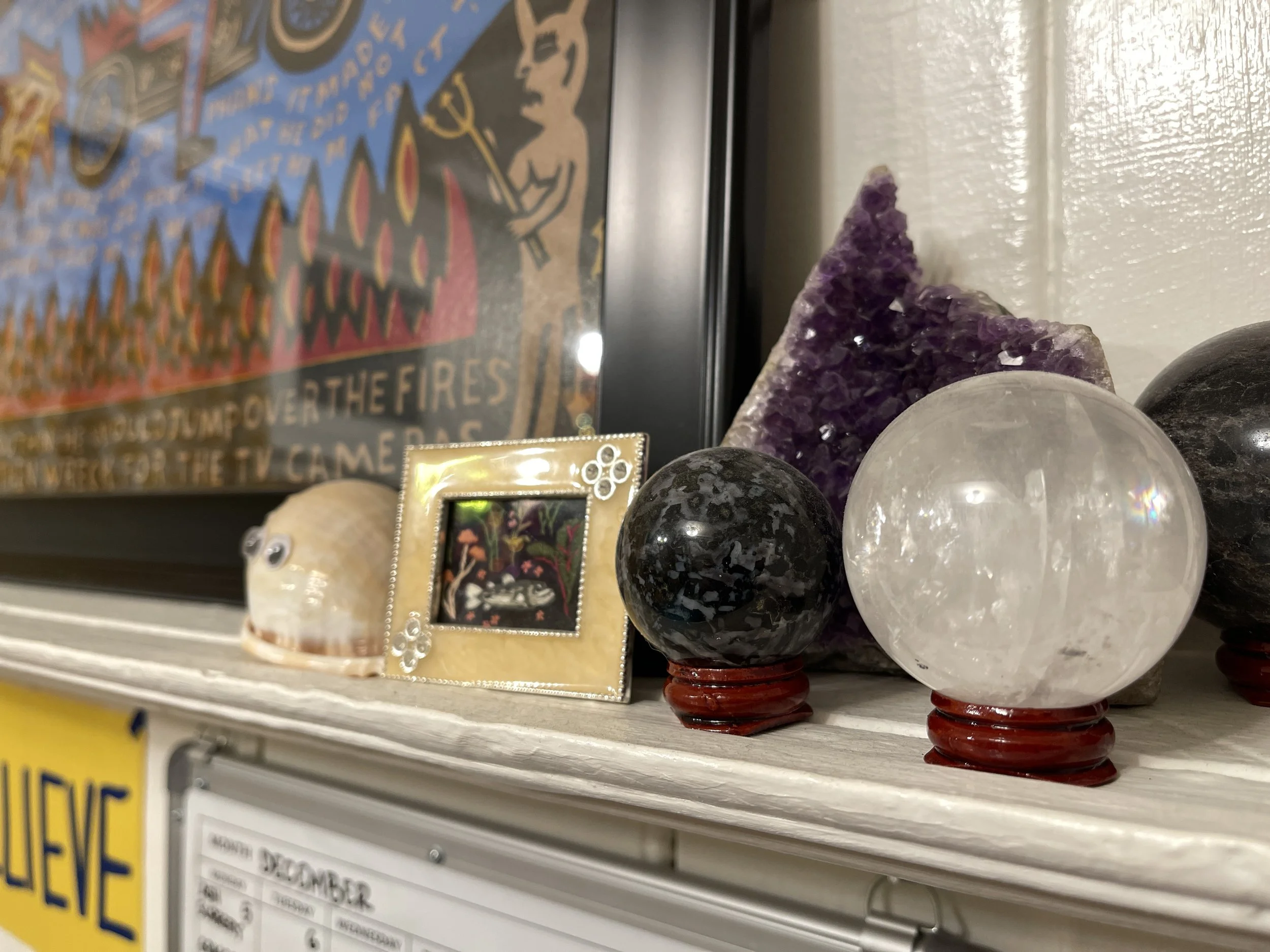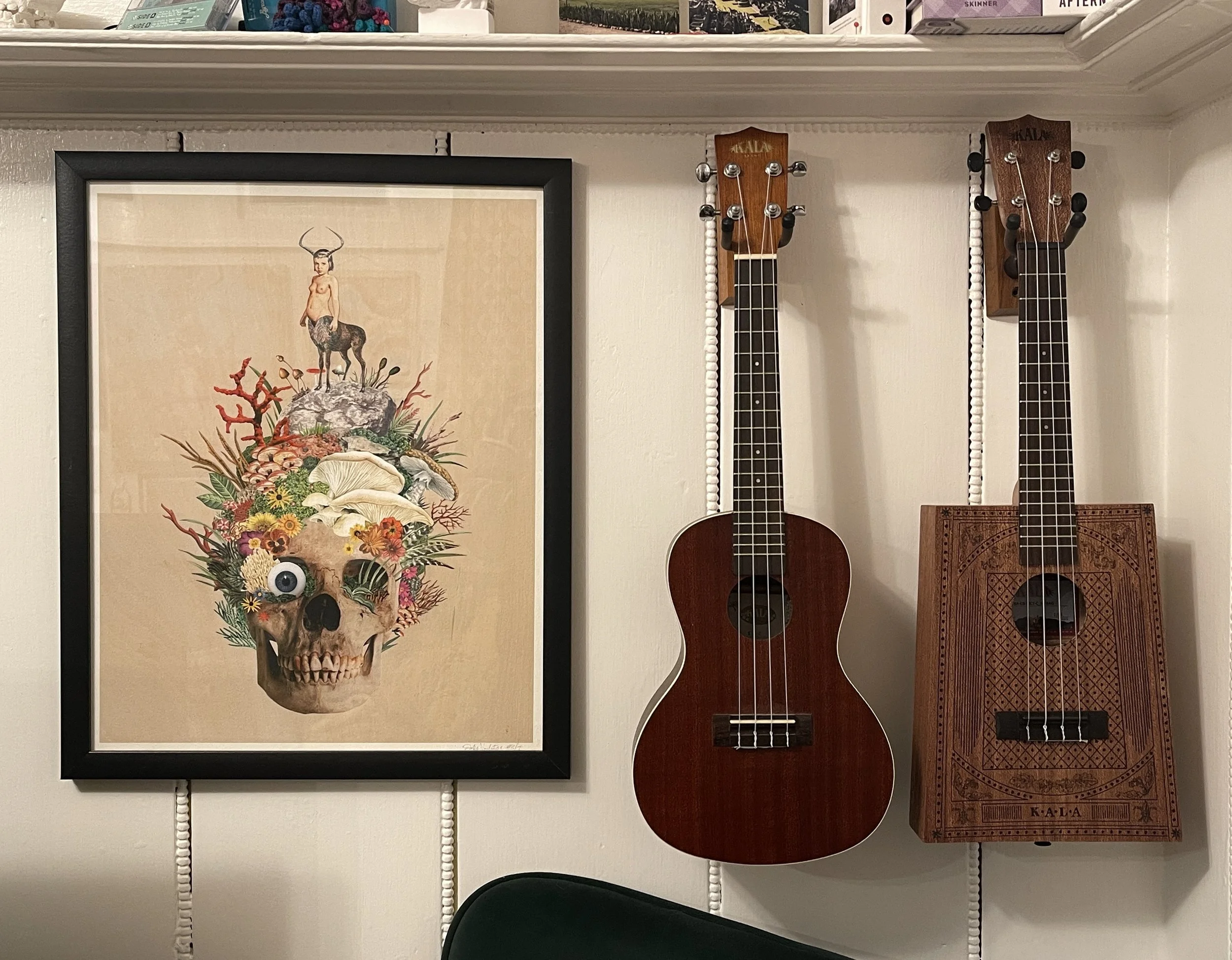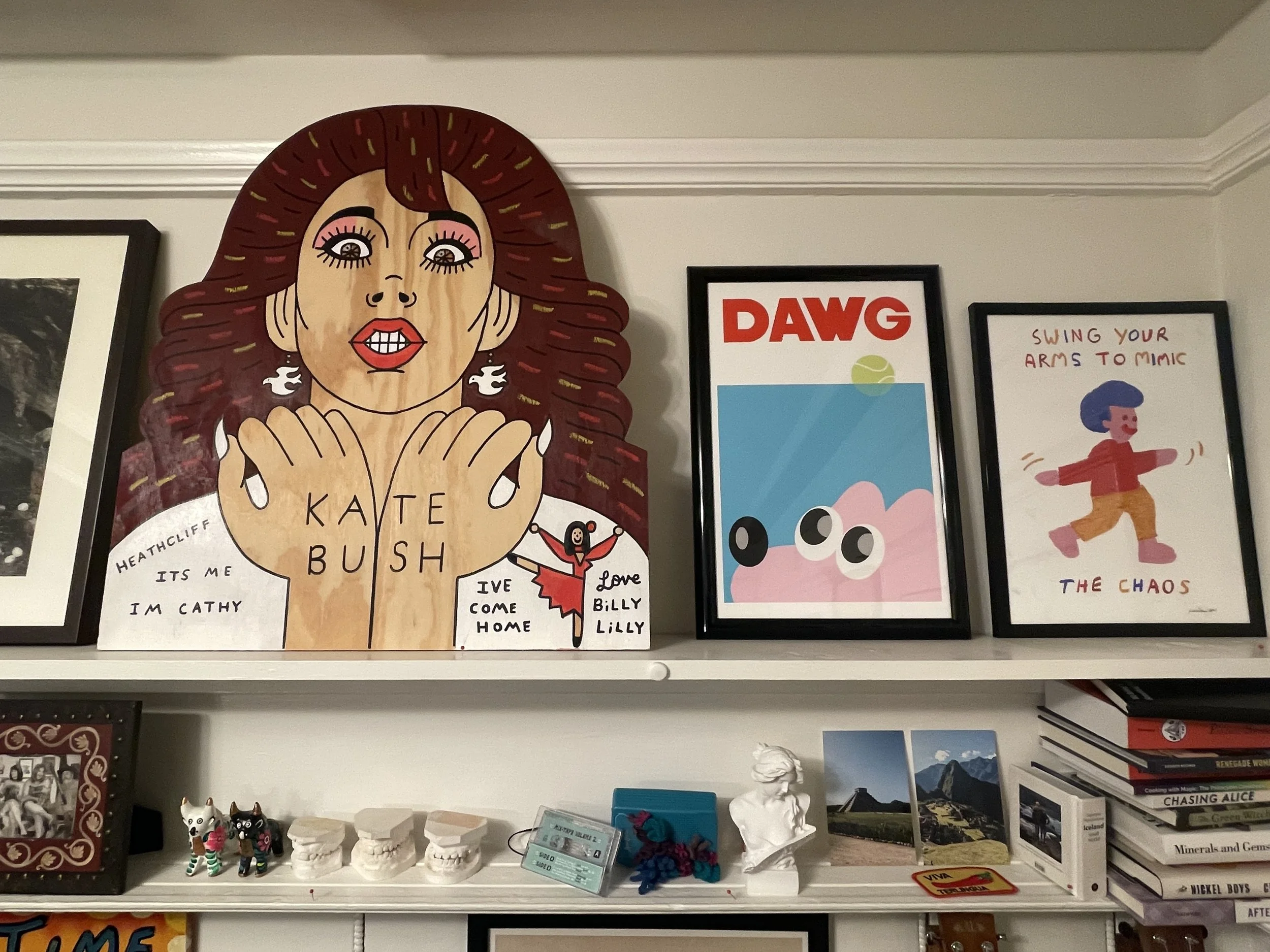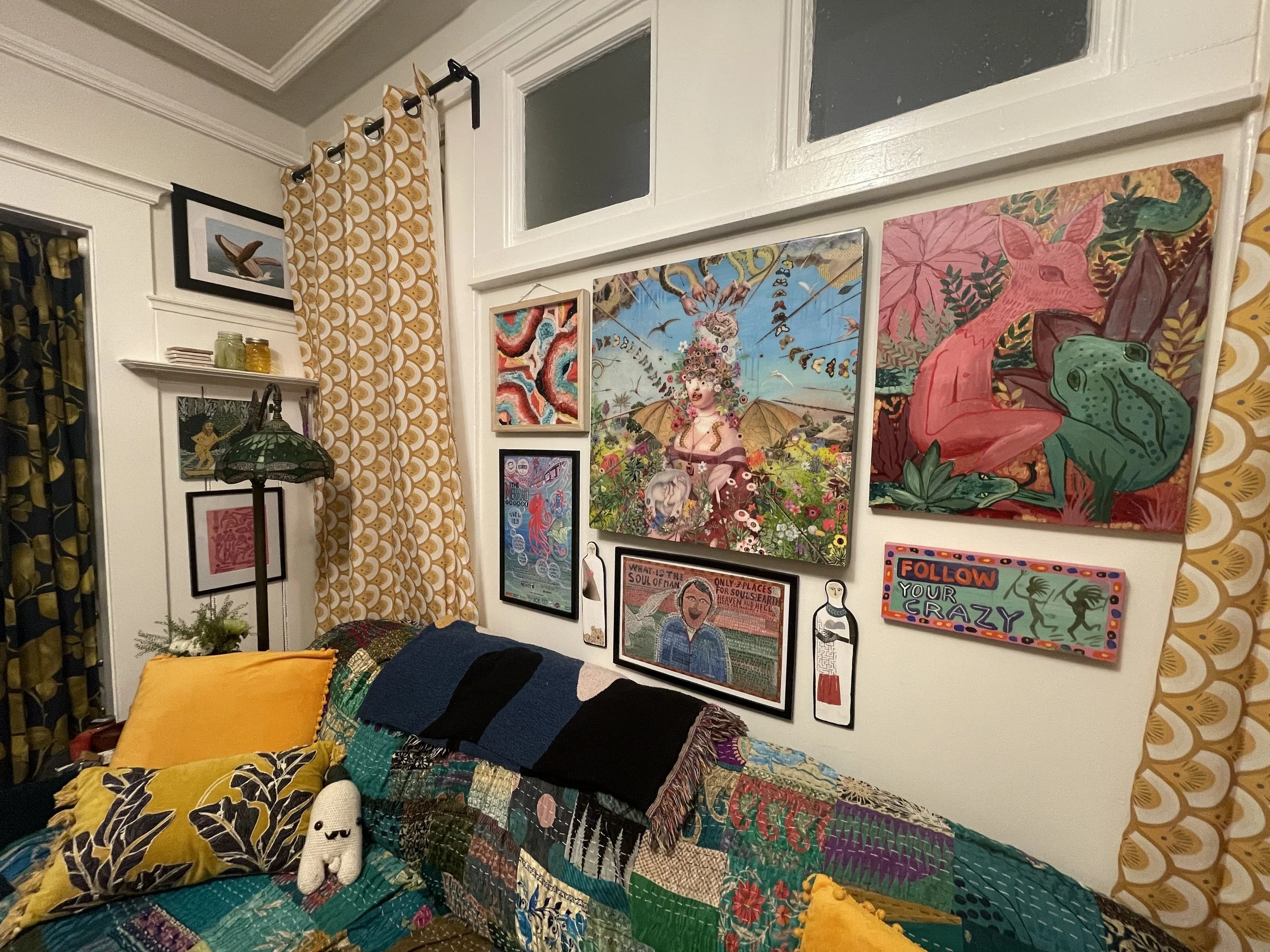 Aw, hard question because I love all my art! I recently got a Jade Rivera print while in Lima, Peru after spending the morning seeing all of his murals around the city. The moment Kate Bush is having right now makes me appreciate my Billy Lilly Kate Bush cut-out all the more. Allison Sommers once drew me a blue whale holding an umbrella on fire that I wanted to get as a tattoo but never got around to. My friend Kate Parnell is the brain behind Garfield from Memory and paints Garfield (yeah, the cartoon cat) into all sorts of different environments. I love love love the Garfield whale of hers on my wall. My Evel Knievel print is by a guy named Kevin Bradley who has a prolific collection of hillbilly and Appalachian centric posters which you can get on his VooDooRocket (formerly Church of Type) Etsy page. In Louisiana is this an amazing roadside attraction / museum called the Abita Mystery House, which is the brainchild of folk artist John Preble. For years I had wanted to visit there, and finally in 2018 I made it! They had original John Preble signs in their gift shop; so, I of course went home with one, which is my "FOLLOW YOUR CRAZY" sign in the living room. I wish I had more. So, all the more reason to go back! I suppose my piece de resistance though is the John Vochatzer resin covered collage in my living room. It is my most cherished gift.