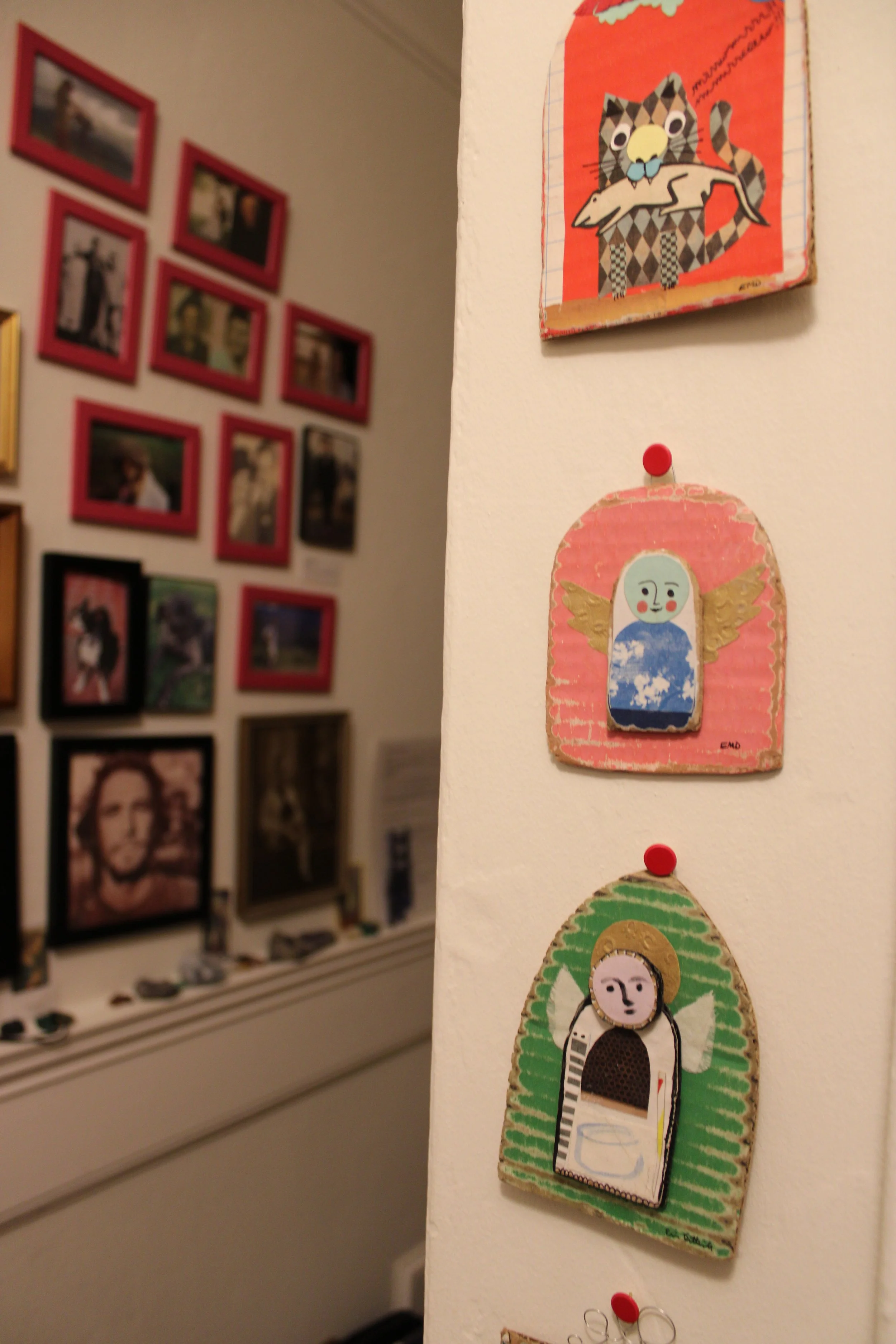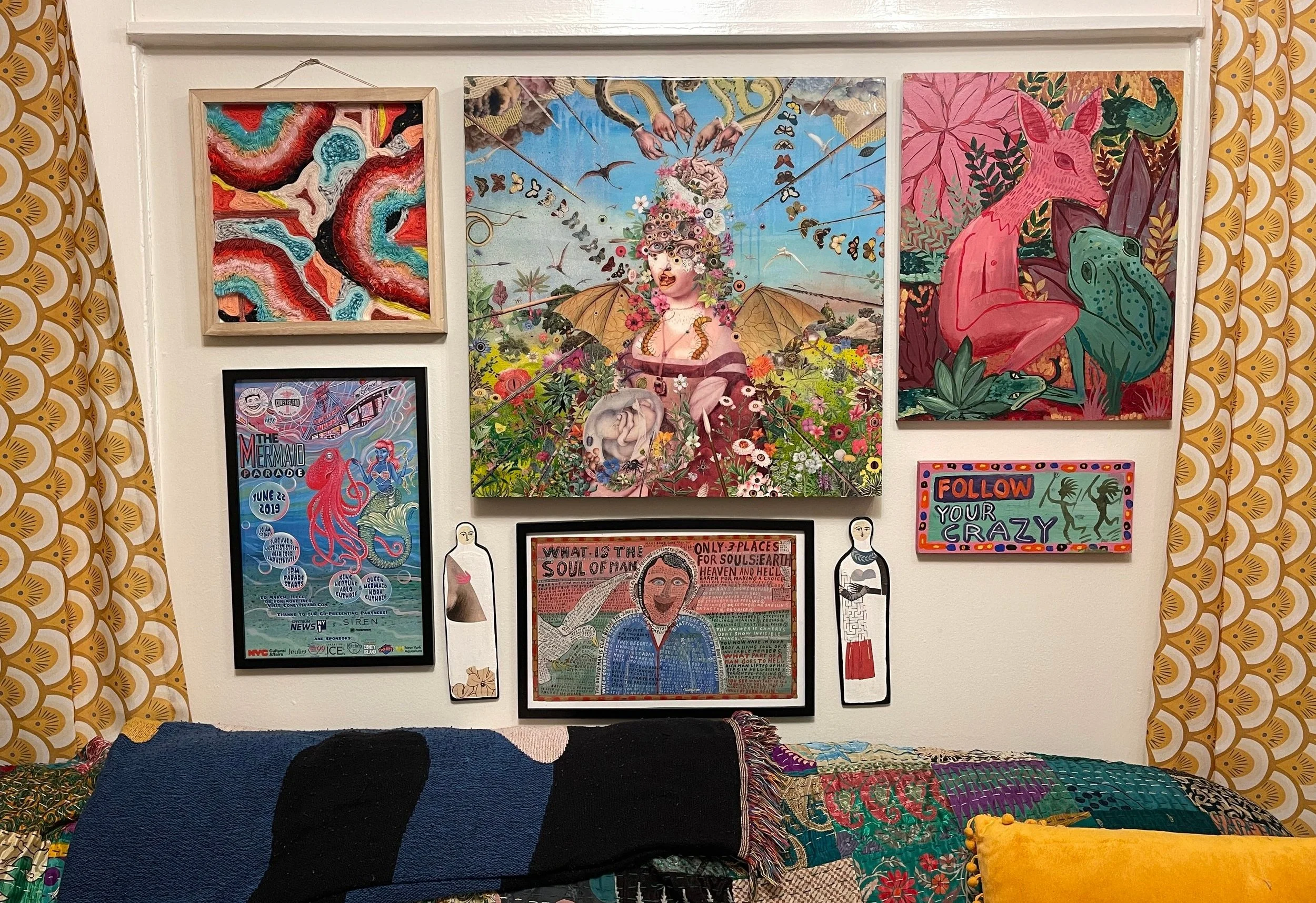 Yarn piece by Wren Sayler (top left), resin collage by John Vochatzer (top middle), painting by Andrew Catanese (top right), Coney Island Mermaid poster by Jennie Jones (bottom left), “What is the Soul of Man” by Howard Finster (bottom middle), angel figures by Erin Dittrich (bottom middle), Follow Your Crazy by John Preble (bottom right).