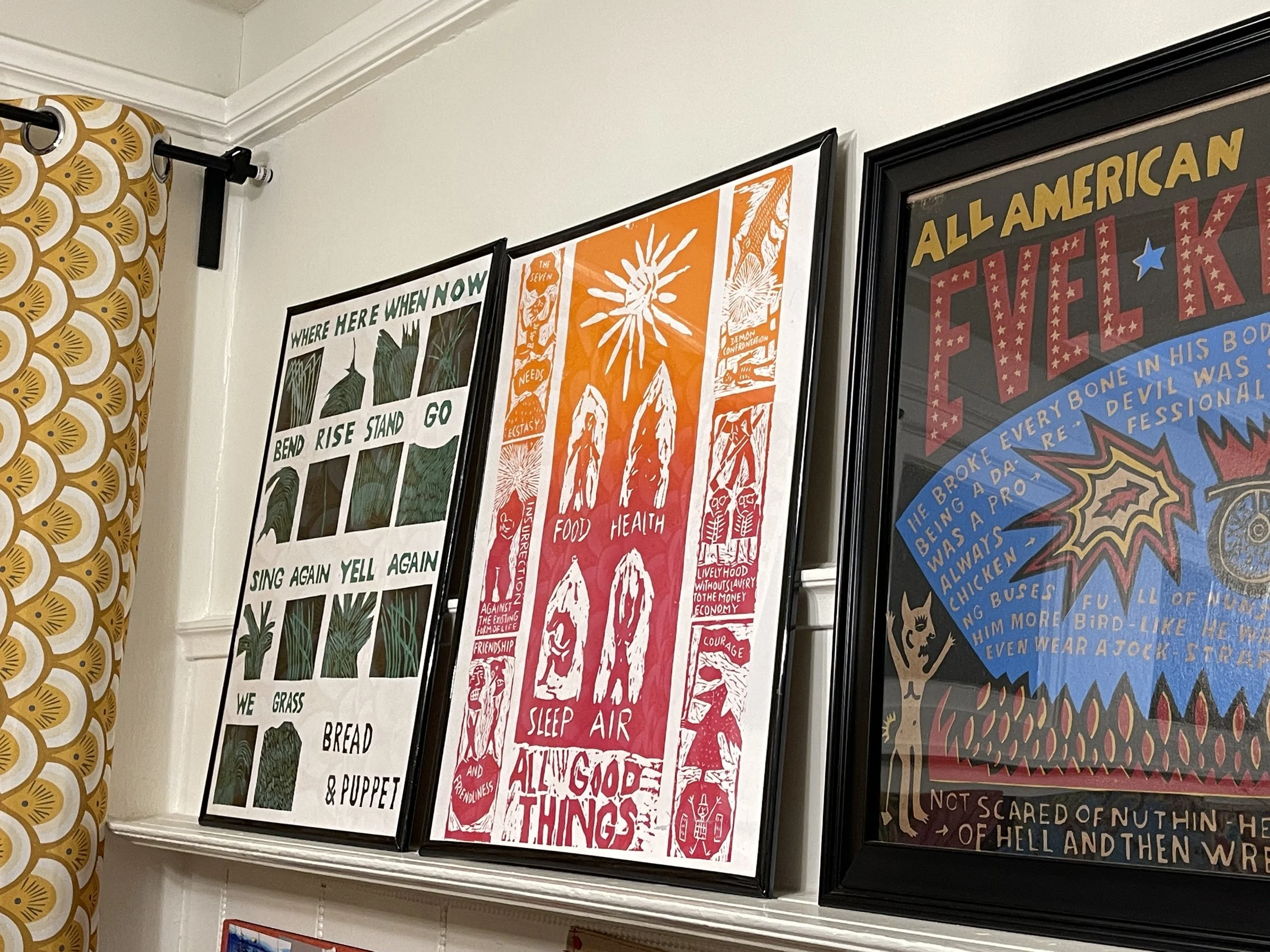 Prints from Bread & Puppet Theatre (Left), Evel Knievel print by Kevin Bradley.