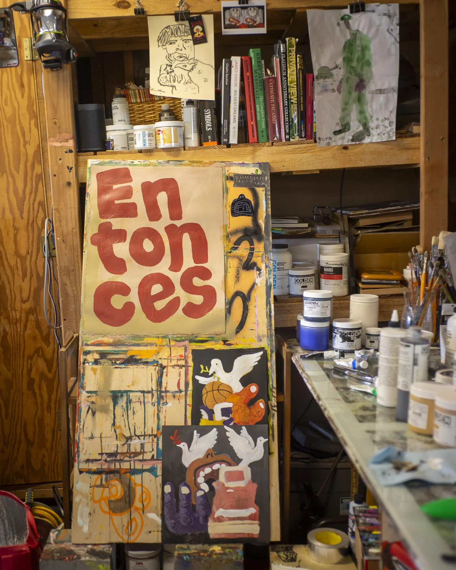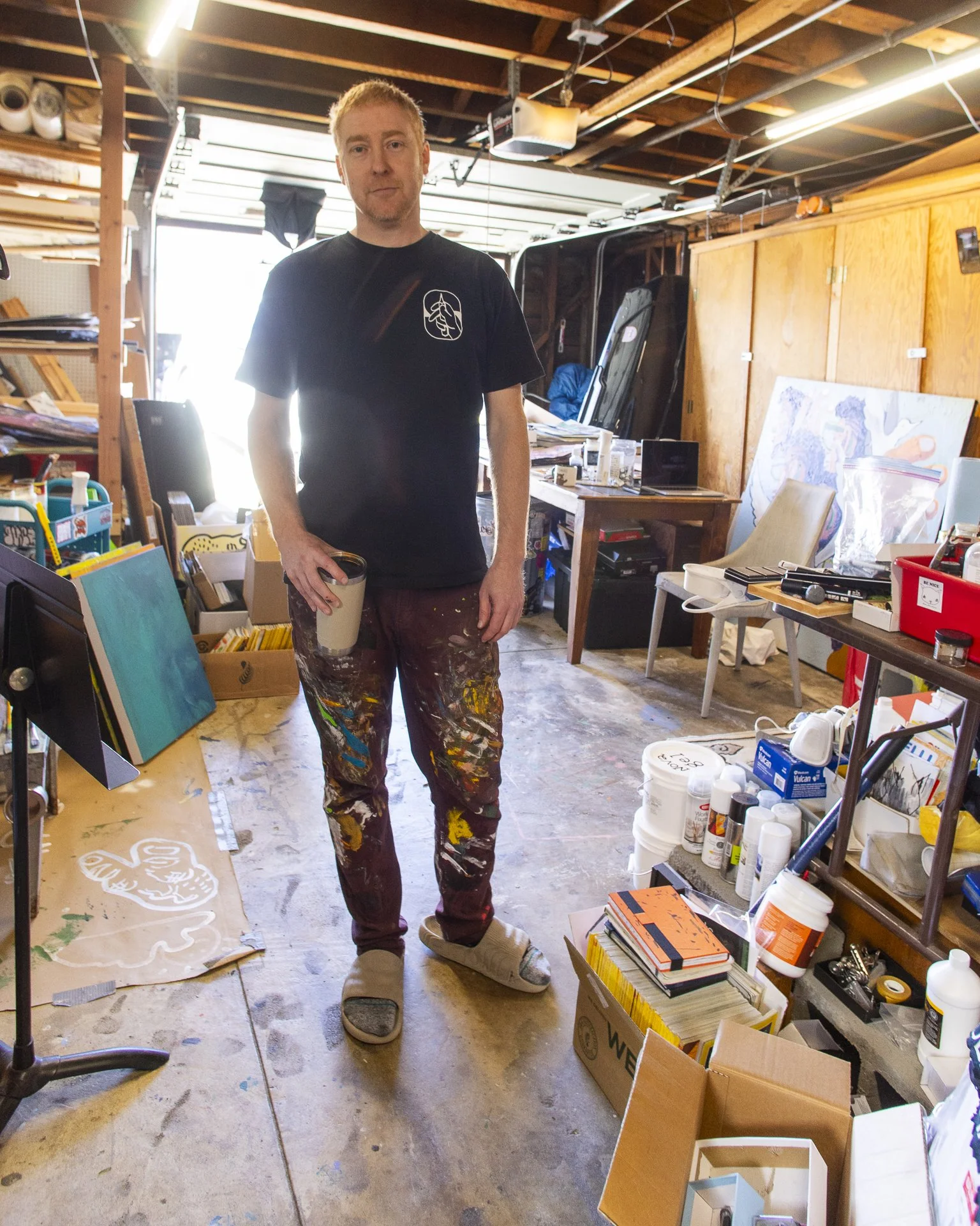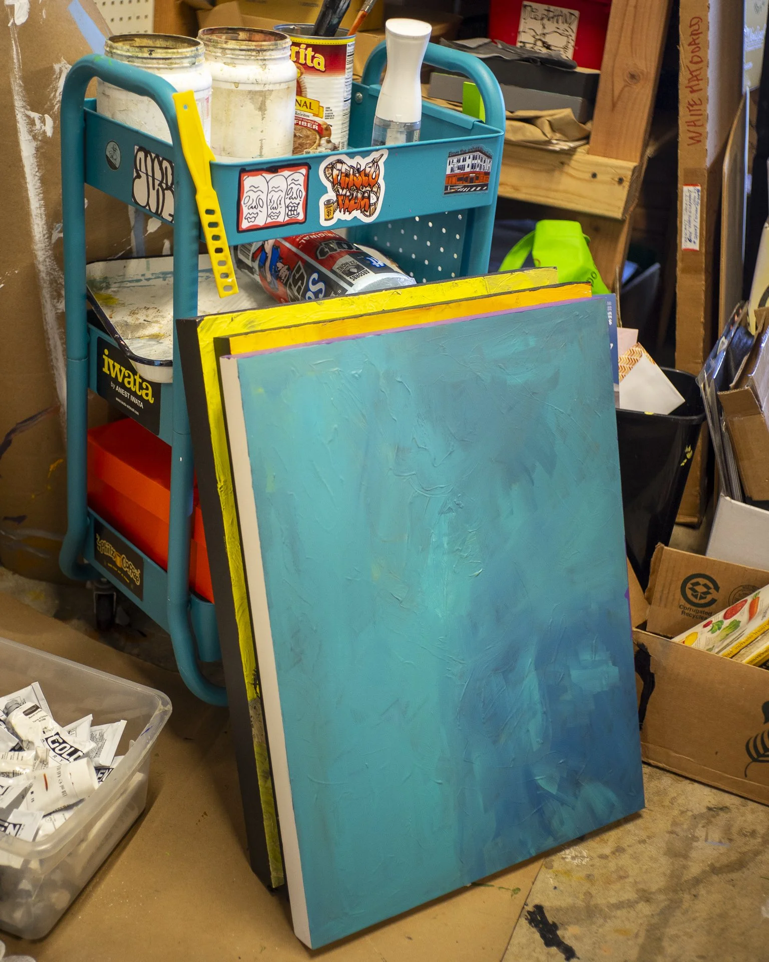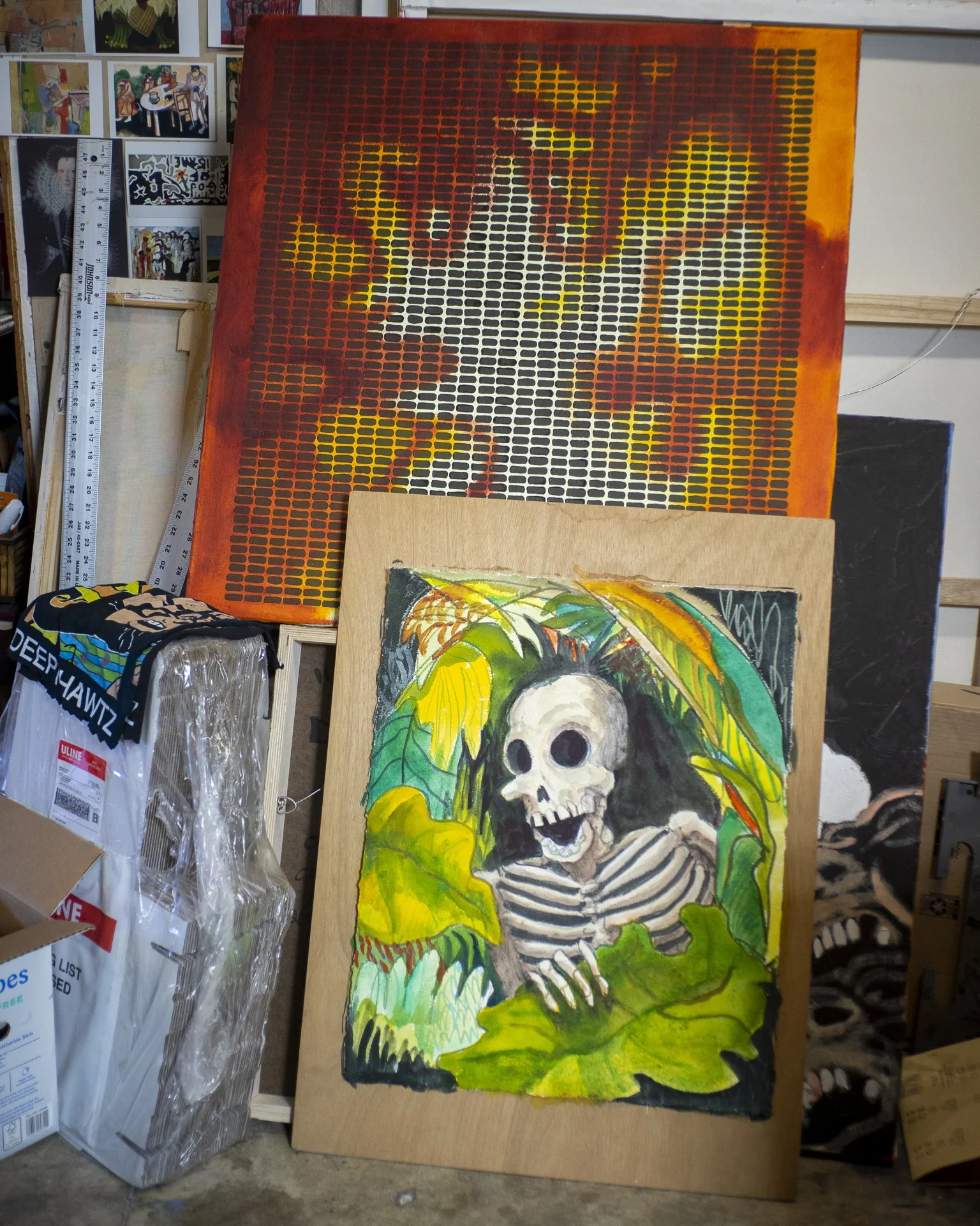 We return to the studio, strong coffee in hand, where Dylan and I discuss our shared interest in Image comic books from the 90’s, how he’s “medium agnostic” with his art, his practice of “sabotaging control” in his art and how that leads to a more zen-like state of painting. Dylan is teaching himself Spanish and phrases he’s integrating into his vernacular arise frequently. I find Dylan to be thoughtful when he speaks of his life as an artist, the challenges that life presents, the community he lives in, his routines and the family he has in California after moving from West Virginia in 1989.
