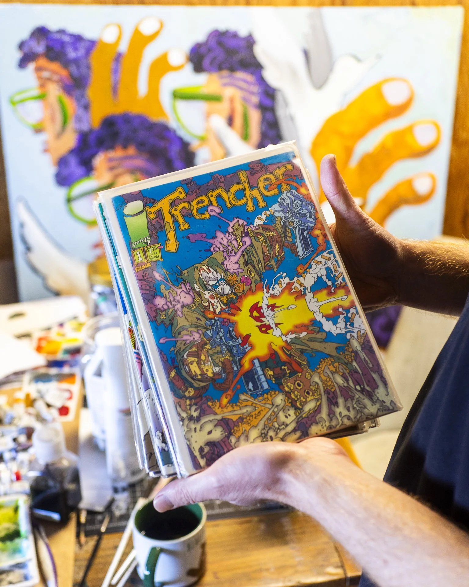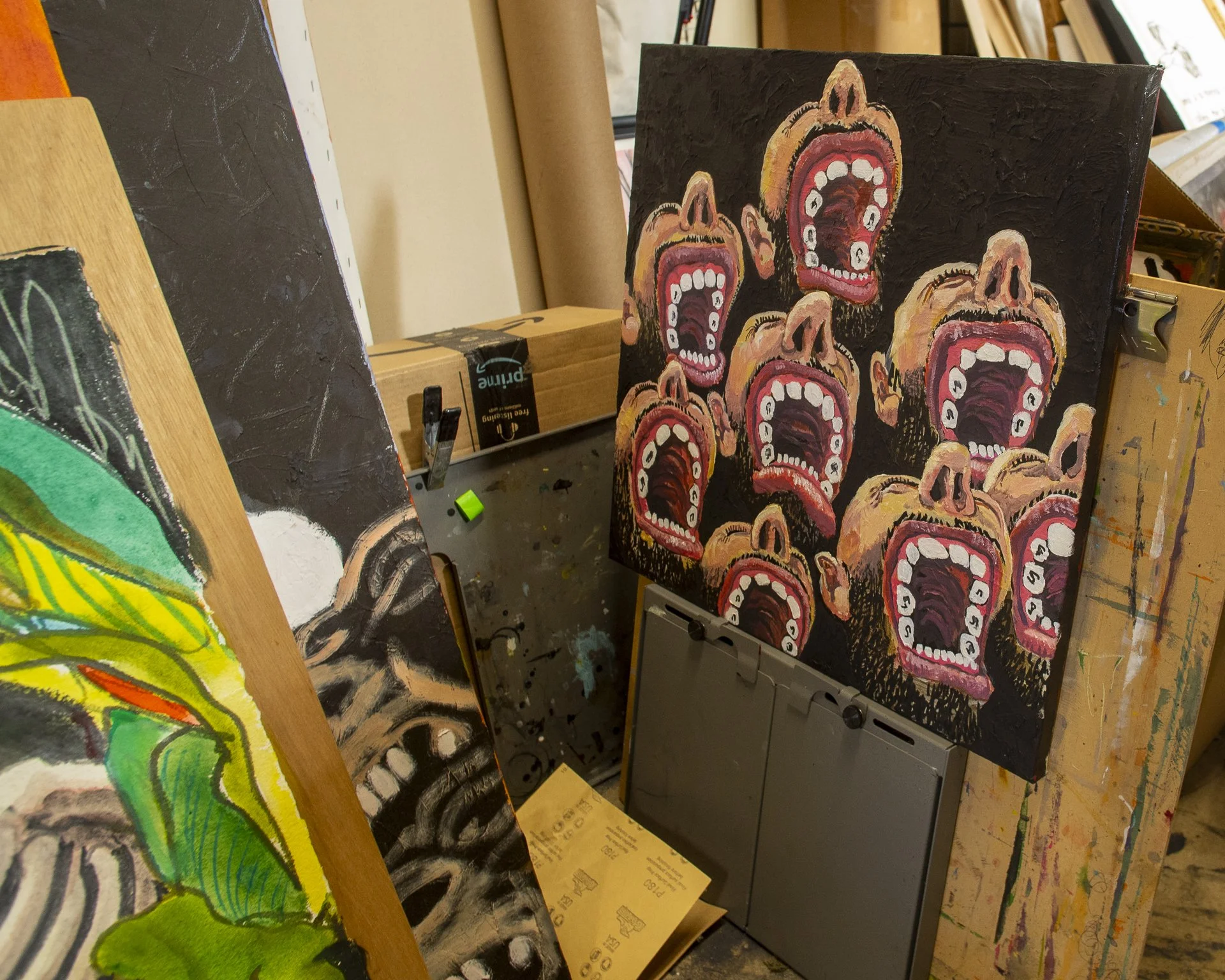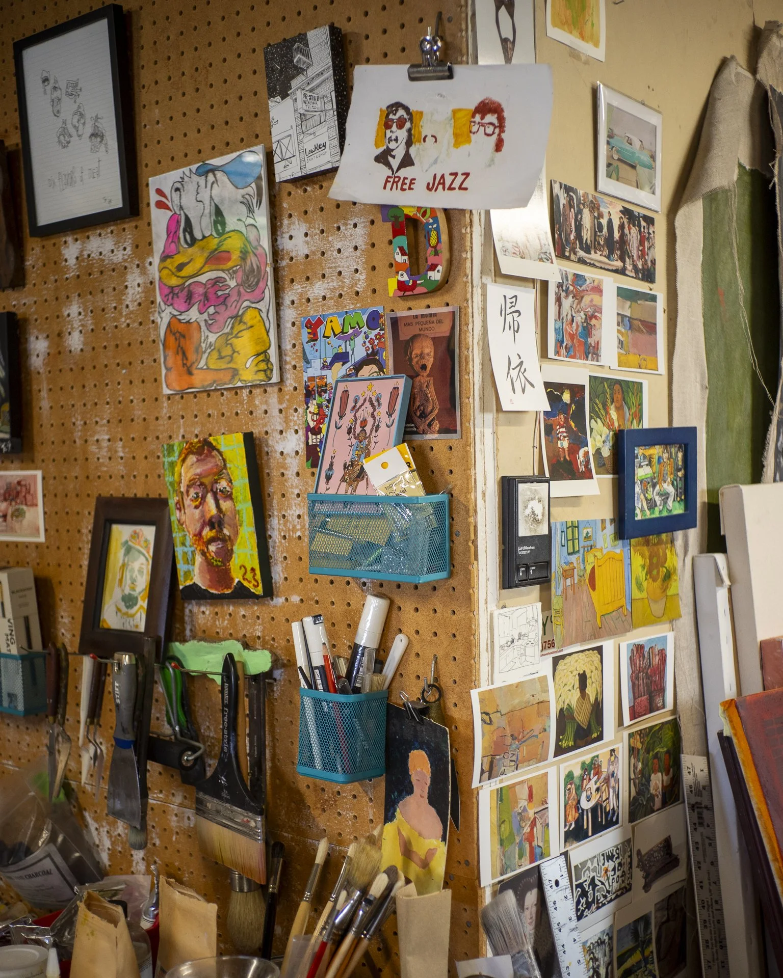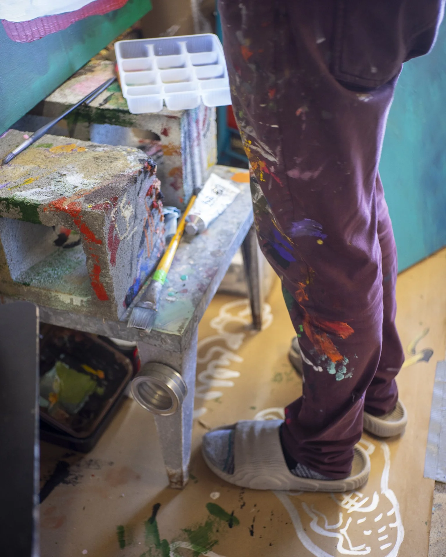 We return to the studio, strong coffee in hand, where Dylan and I discuss our shared interest in Image comic books from the 90’s, how he’s “medium agnostic” with his art, his practice of “sabotaging control” in his art and how that leads to a more zen-like state of painting. Dylan is teaching himself Spanish and phrases he’s integrating into his vernacular arise frequently. I find Dylan to be thoughtful when he speaks of his life as an artist, the challenges that life presents, the community he lives in, his routines and the family he has in California after moving from West Virginia in 1989.