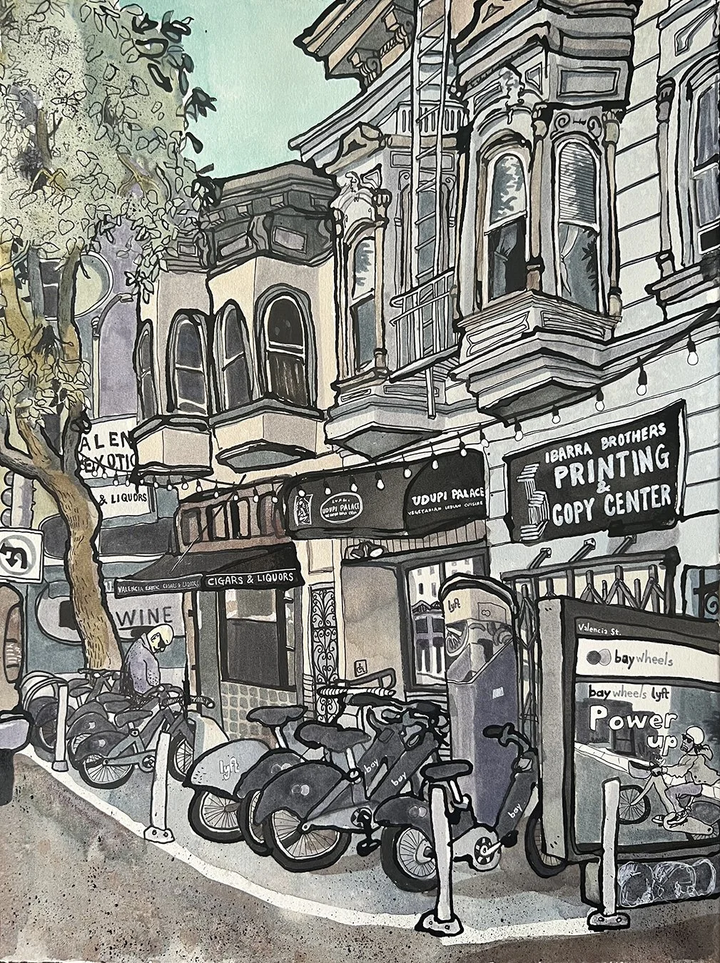 “Valencia & 21st” Ink and watercolor on paper by Dylan Clendenin.