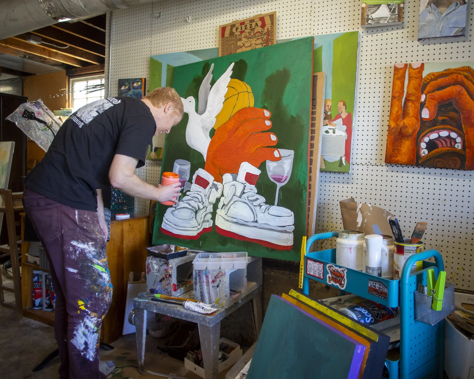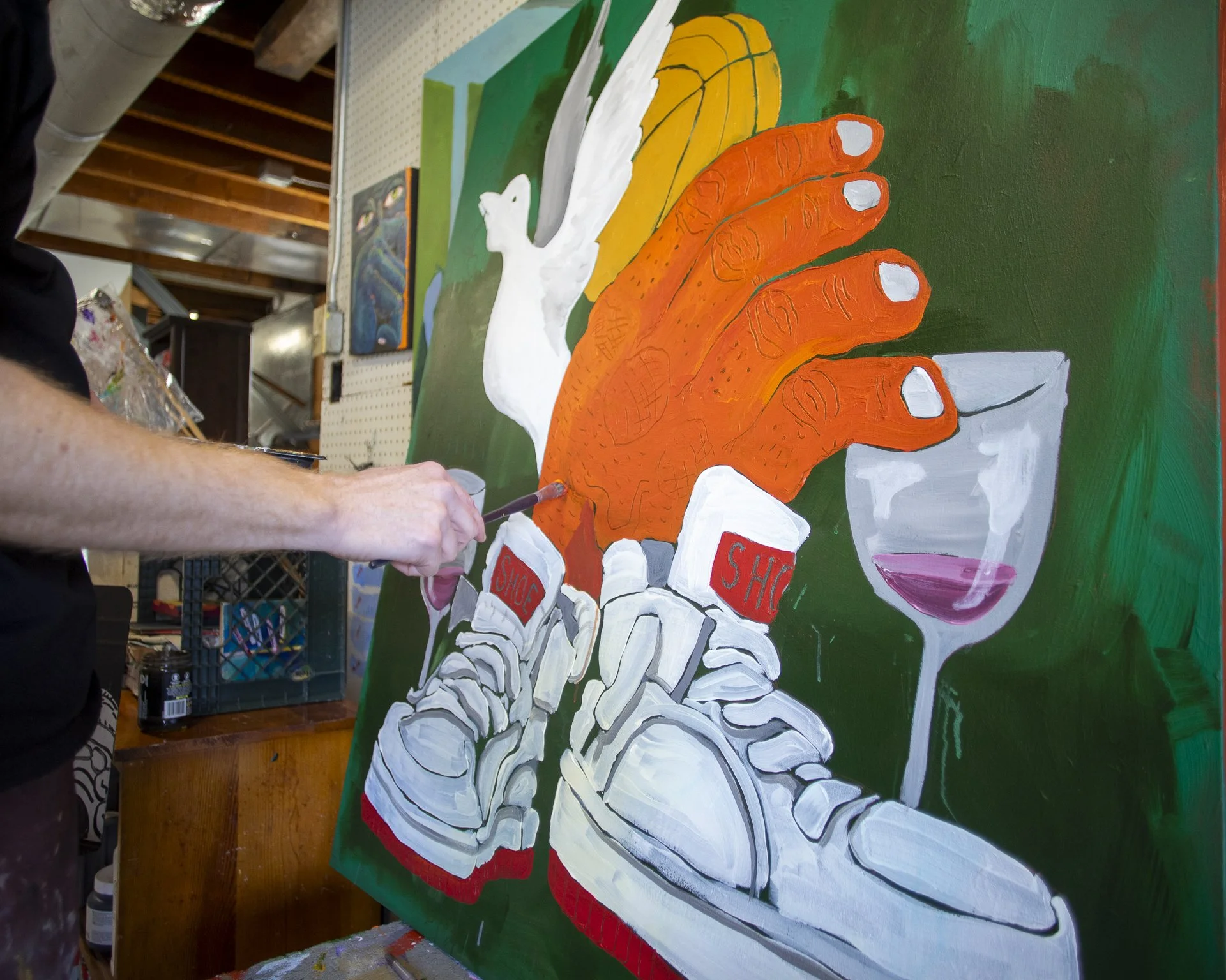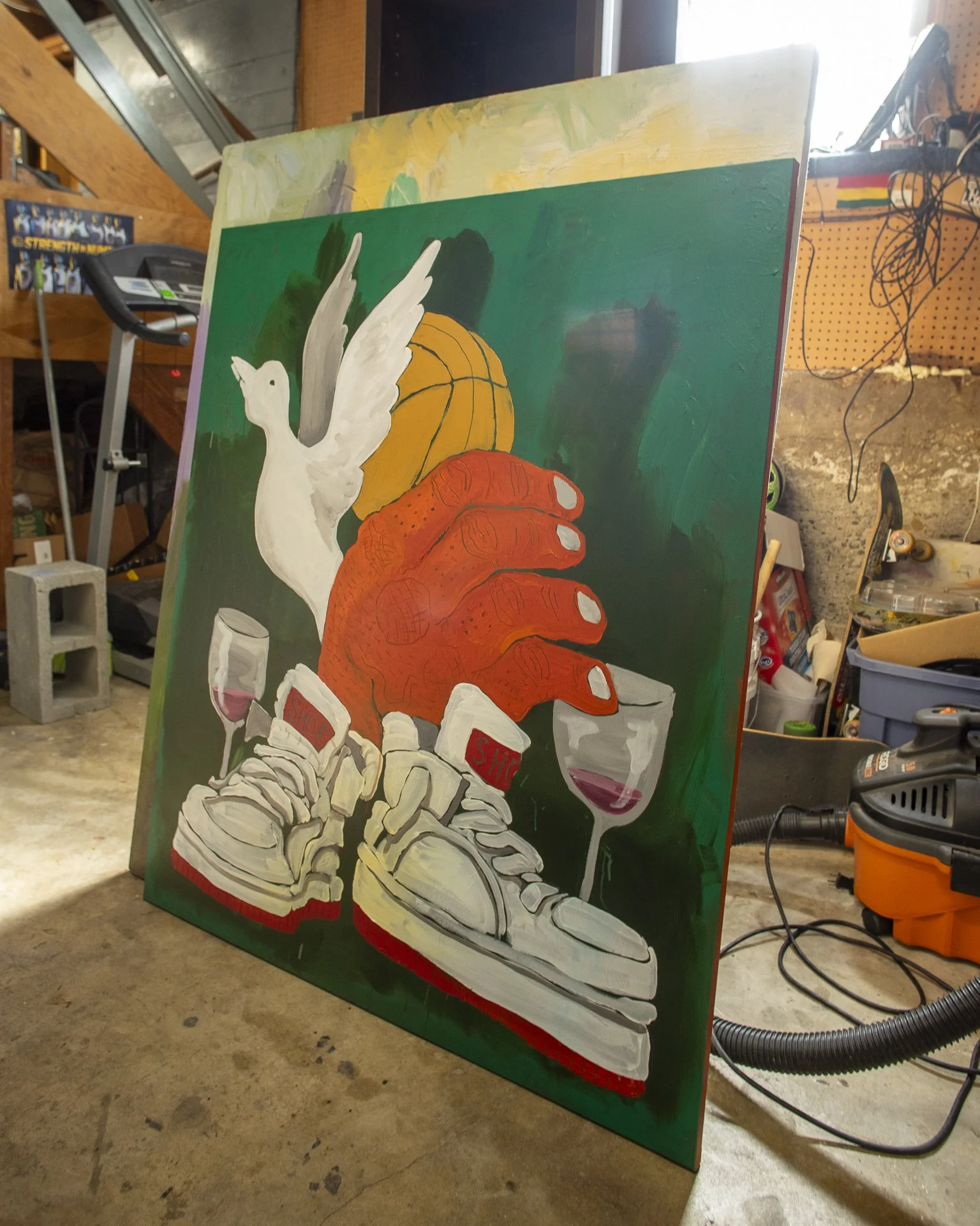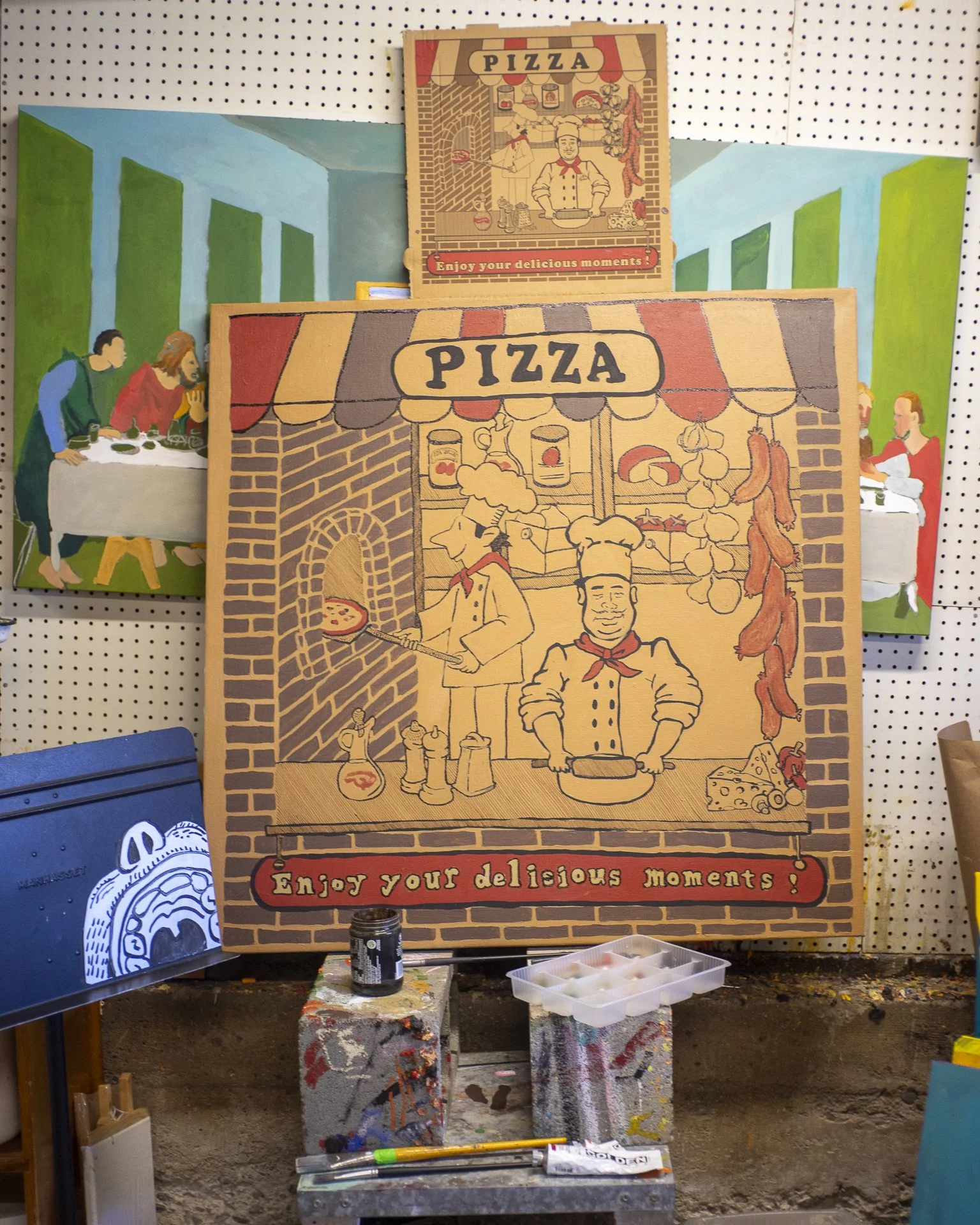 Dylan’s studio is in his home, in his garage specifically. That’s where I find him with the roll up door open, waiting for me. I notice a 4ft by 4ft painting in progress of a pizza box resting over Dylan’s homage to Leonardo Davinci’s The Last Supper. I find it humorous, whether intentional or not, that a larger than life recreation of a disposable modern food delivery totem rests over a study of a Renaissance painting depicting Jesus’ last meal. I make a mental note to discuss this juxtaposition with him later.