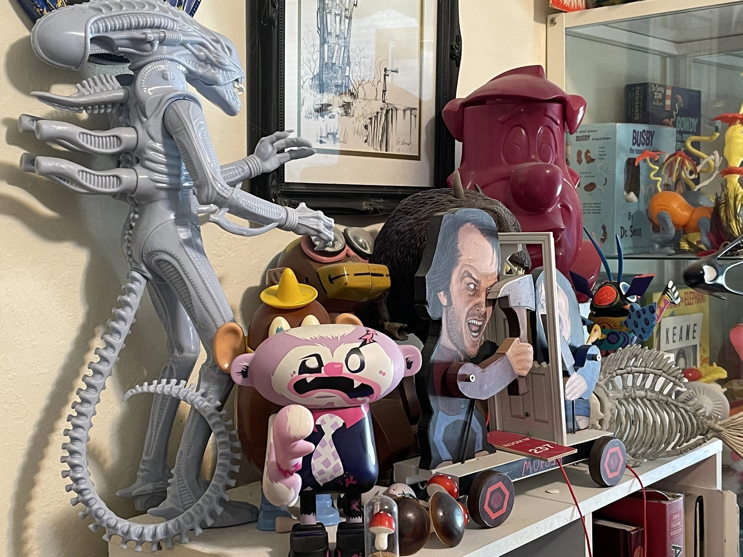 Oh, the house needs a rhyme to the reason, so to speak, of late. We're bad at displaying art, so it is kind of everywhere. Our bedroom which you didn't see, is mostly Margaret Keane prints form the 60s. We have a big Scott Musgrove bronze sculpture sitting on a ripped up piece of carpet. We've got works from Rob Sato, AJ Fosik, Dr. Seuss taxidermy heads, Mark Ryden, and tributes to our beloved deceased pets that artists have sent us. Things are still things, but my favorites are things given to me from my brother in law and my grandmother, and artist friends who appreciate what Annie and I do.