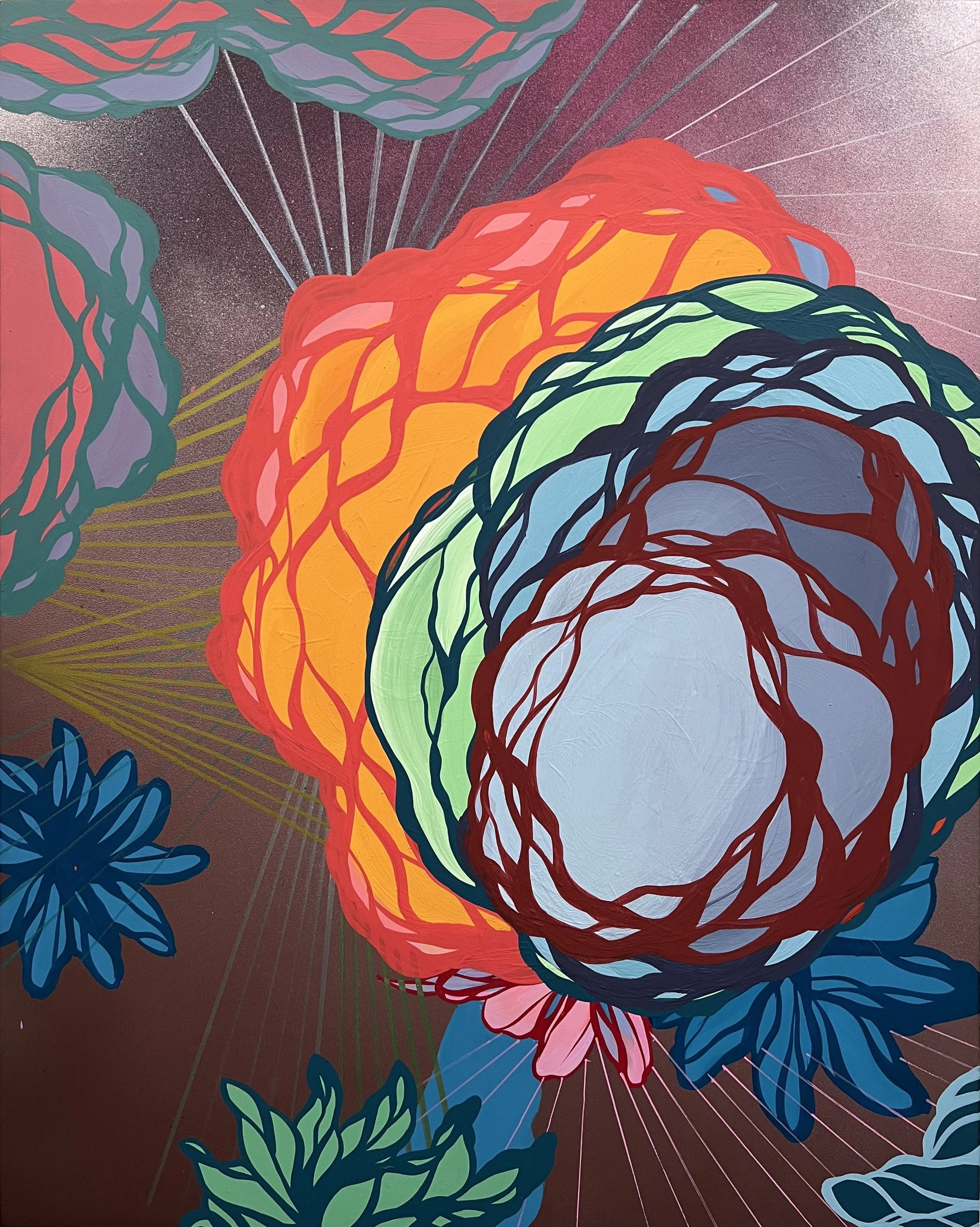 I hate watching paint dry, I'm impatient so I work on many pieces at once and "pollinate" them like a bee, or risk touching them. Nothing is done on the computer, no planning, hardly any reference is used ever. This way of working suits my personality and my neck condition, which can sometimes make it hard for me to focus, as my head will shake or lock up. I had a studio visit with the late Syd Mead, which had a big impact on me. He showed me how he breathed when he painted. And how he used a brush and a pen. To answer your question, I used to get motivated to paint, now I paint to get motivated to do all the other stuff. Making art for me is the opposite of "all the other stuff". I've never regretted making anything. And I continue to try to take risks to create my own language, hopefully one that is distinct. I have many influences, for certain: Kusama, Calder, Mead, Dubuffet, Oaxacan carvings and more, but when I need to make a creative decision, I try to go with "which one is most me?" and do that, regardless of the aesthetics, collectors, perception or the dreaded "brand".