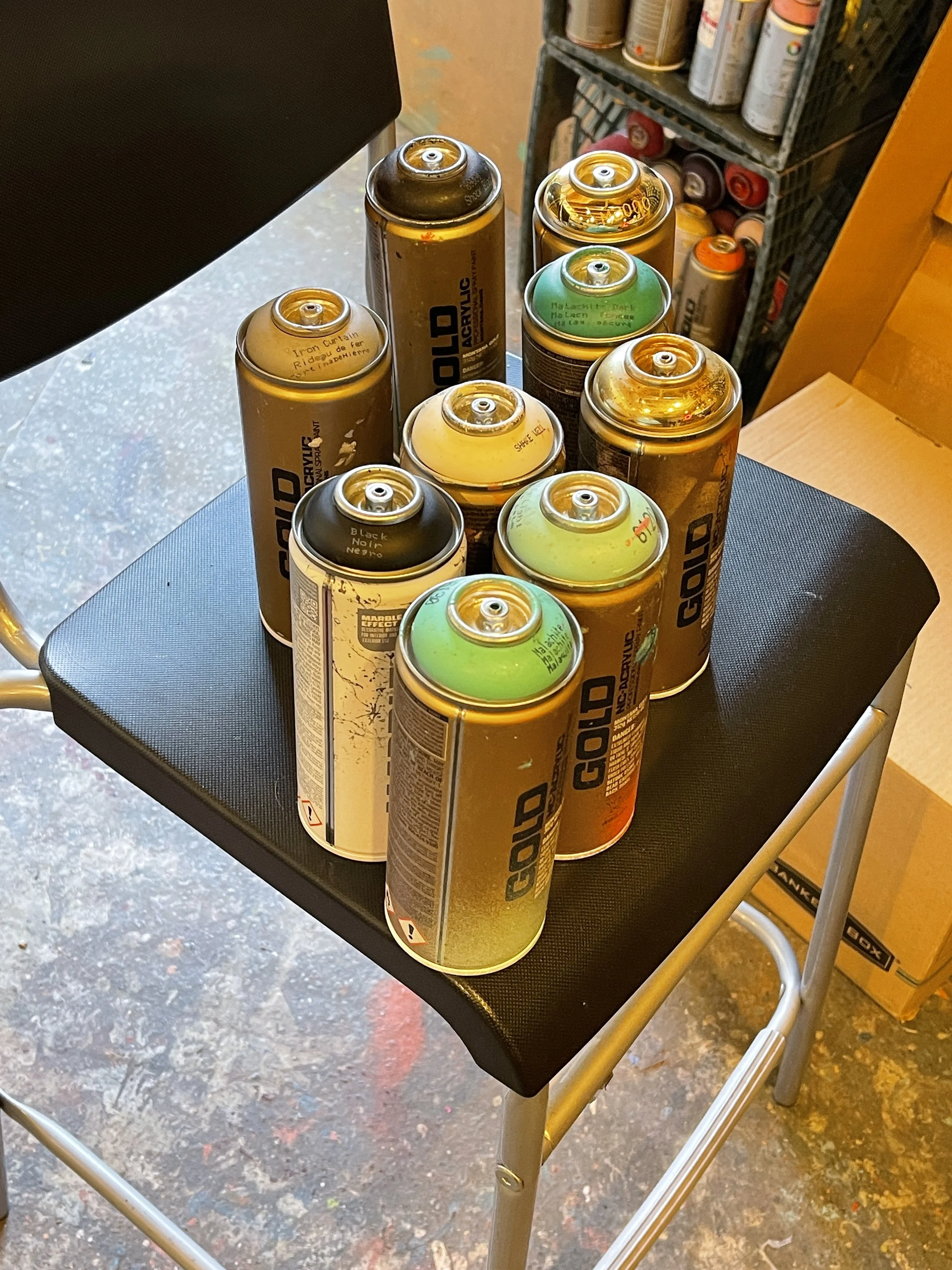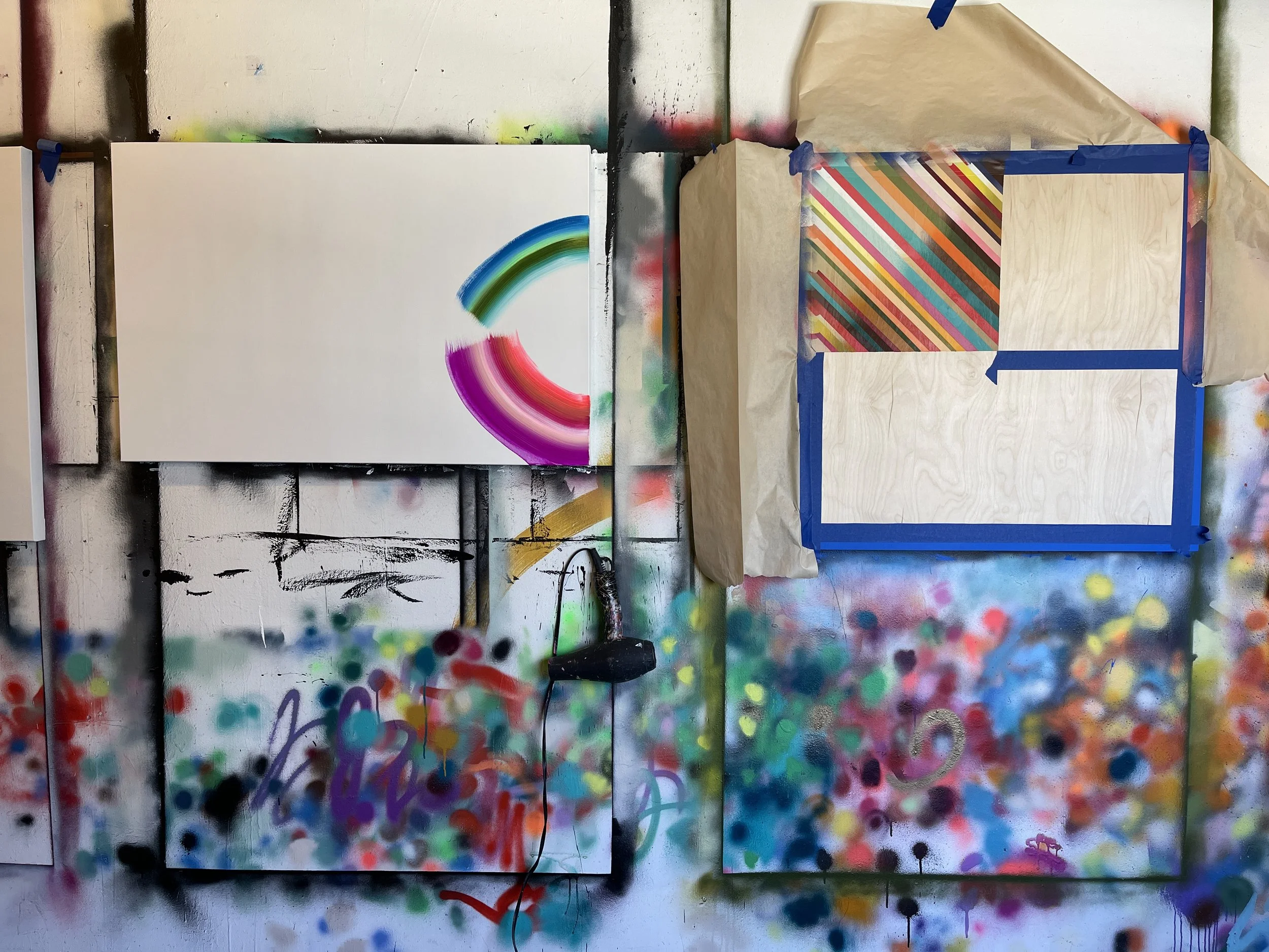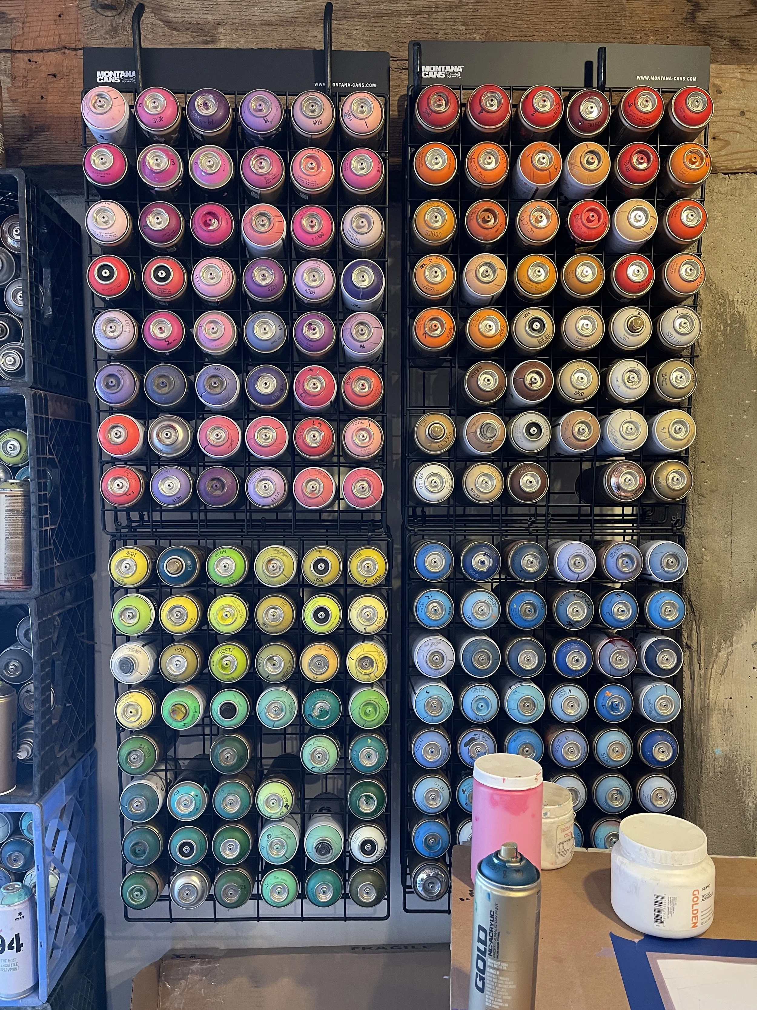 How to word this...I get high on color now :) I don't know how to speak about how excited I get picking out spray paint. Or watercolor. Or pastels. Or whatever. If it comes in a wide color selection I'm a kid in a candy store and I have no restraint...unsurprisingly. The patience the people at Blick and 14th Street have with me is unending. Because I often work in gradients I'll have all the cases open and I'm lining up the colors on the ground and just creating a ruckus (Blick). 14th Street Supply—I’m always "emergency" calling with my pants on fire about some color I can't find. You saw how big a smile I cracked when I showed you my new box of Edding spray paint. UGH the colors, the choices, the unending combinations!!!! Again, I'm trying to convey sights, smells, memories, vibes through non-representational art. So I'm specific about color choices. And so far, I don't paint about the bad shit. And as someone genuinely happy to be alive, my palettes reflect that.