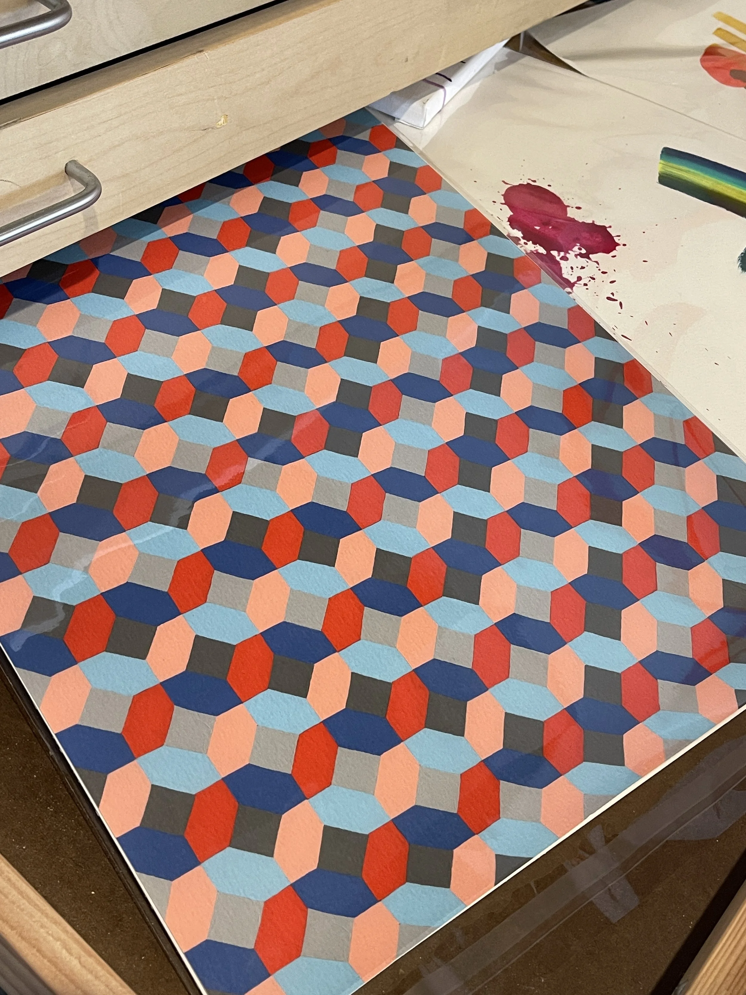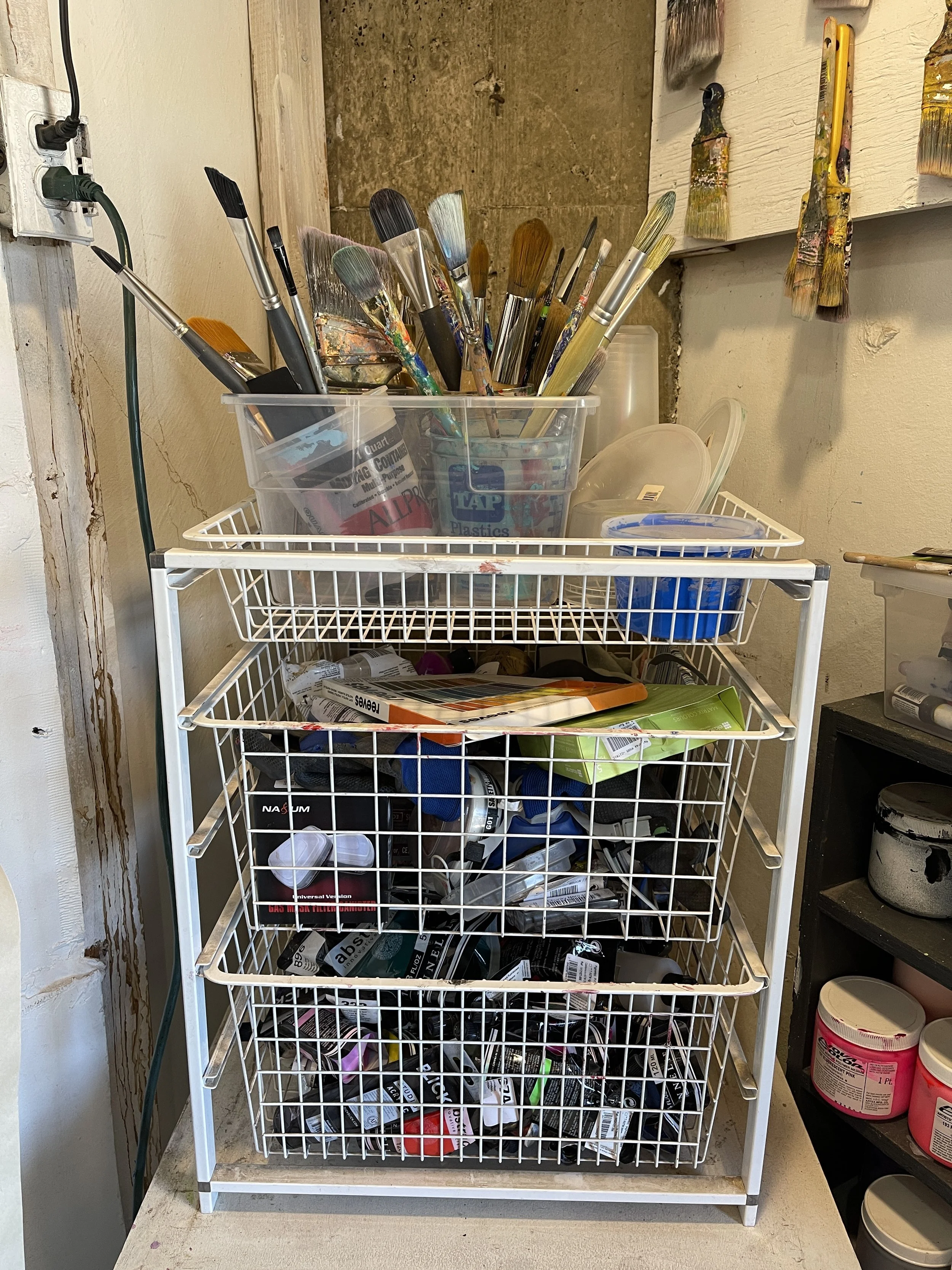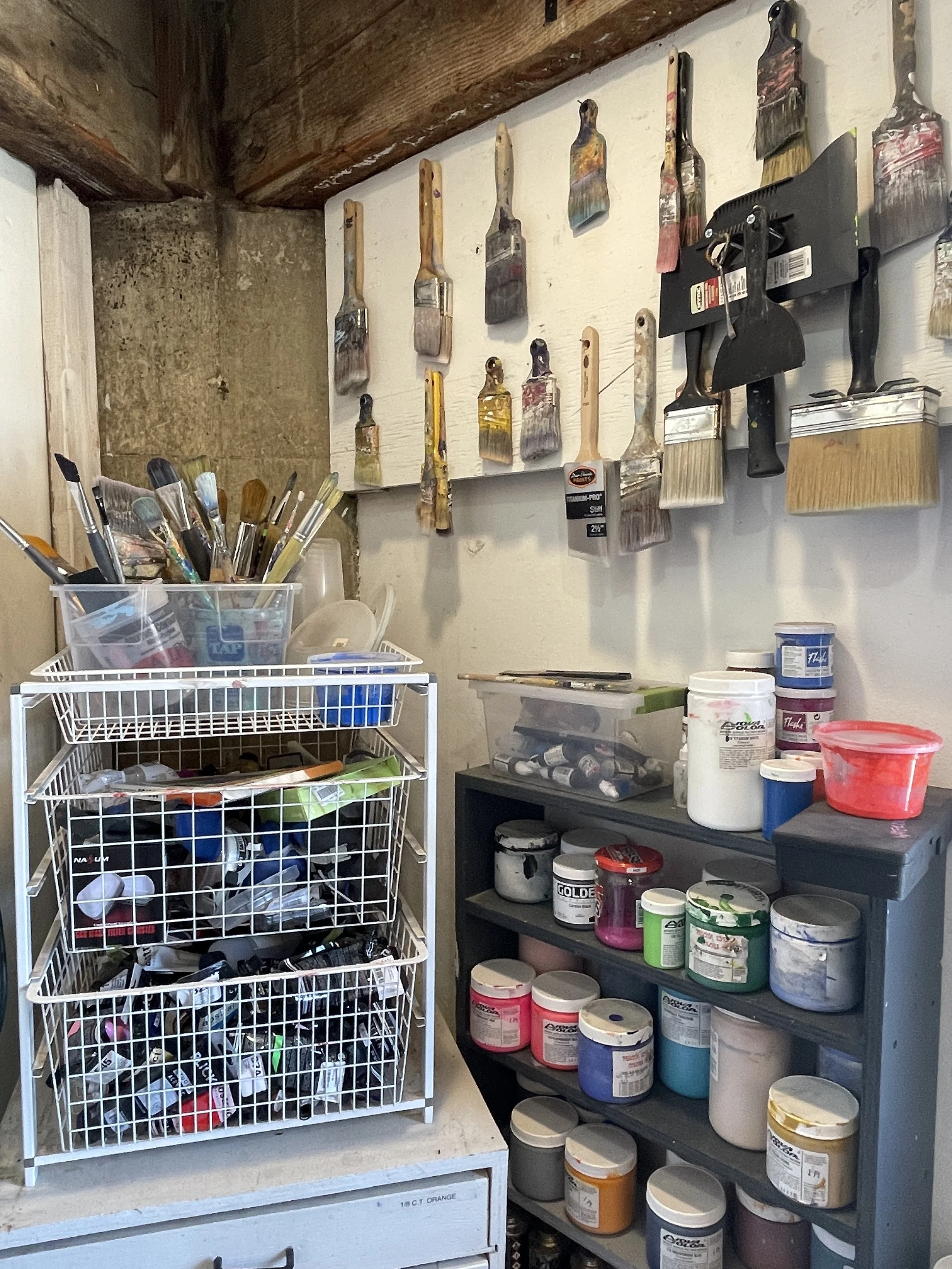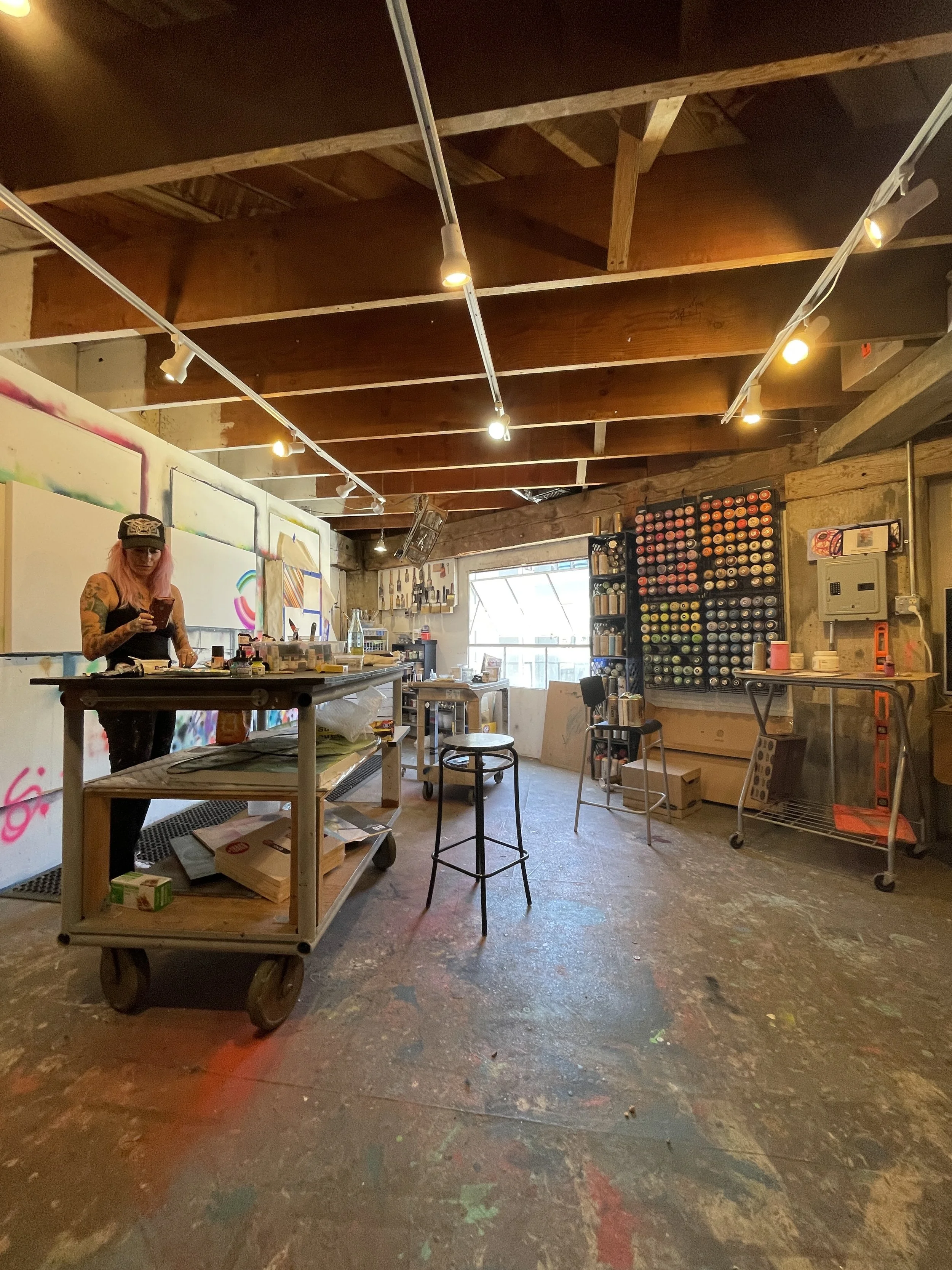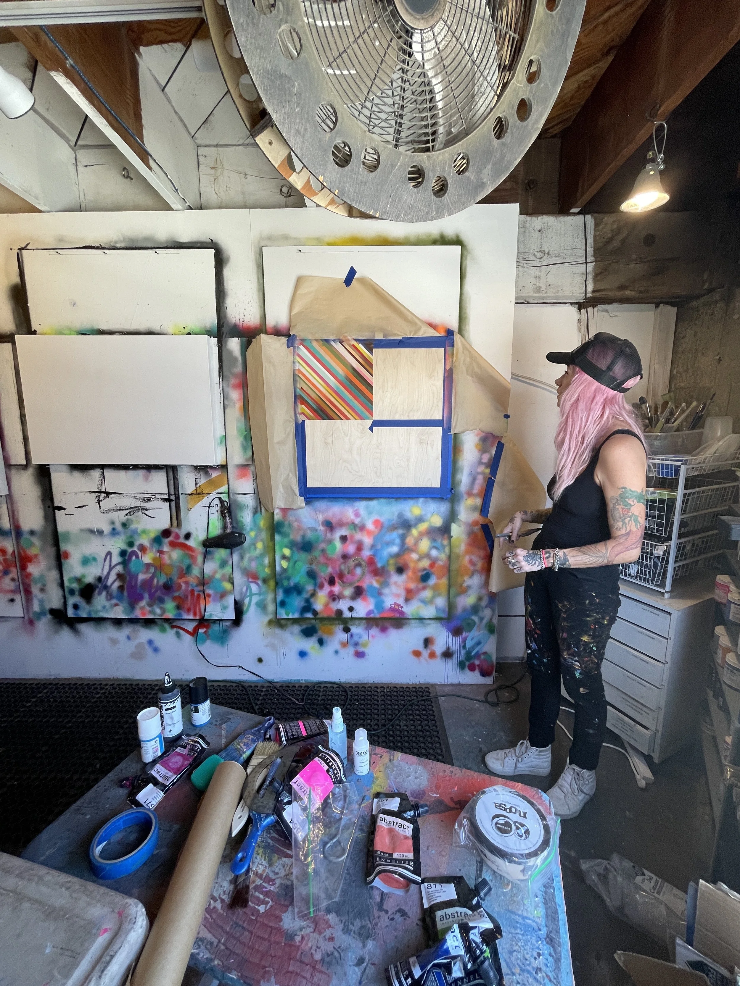 It's a warehouse located in the Mission with about 15-ish other visual artists and a smattering of other creatives. I occupy Erik Otto's old studio, he now lives and works in NYC. It's perfectly suited to my needs and I lucked out so hard (thank you DYOUNGV for that connect). Average day: get my dog Hank settled, make a second coffee, re-arrange everything at least once, and get to work in the first two hours. Usually I don't walk straight in and start unless I'm in the middle of something and it's already laid out and ready. If it's work that I'm just noodling on or exploring, I'm lucky to paint a couple hours out of 7. I clean when I don't know what to do, and also arrange things by color:)