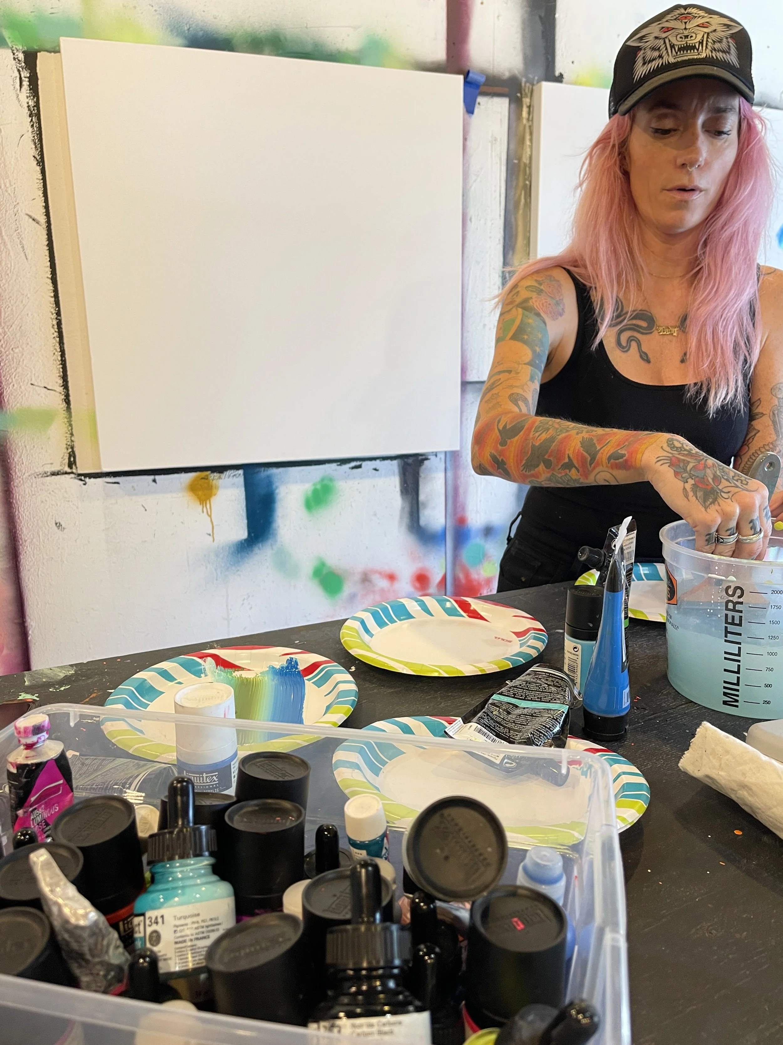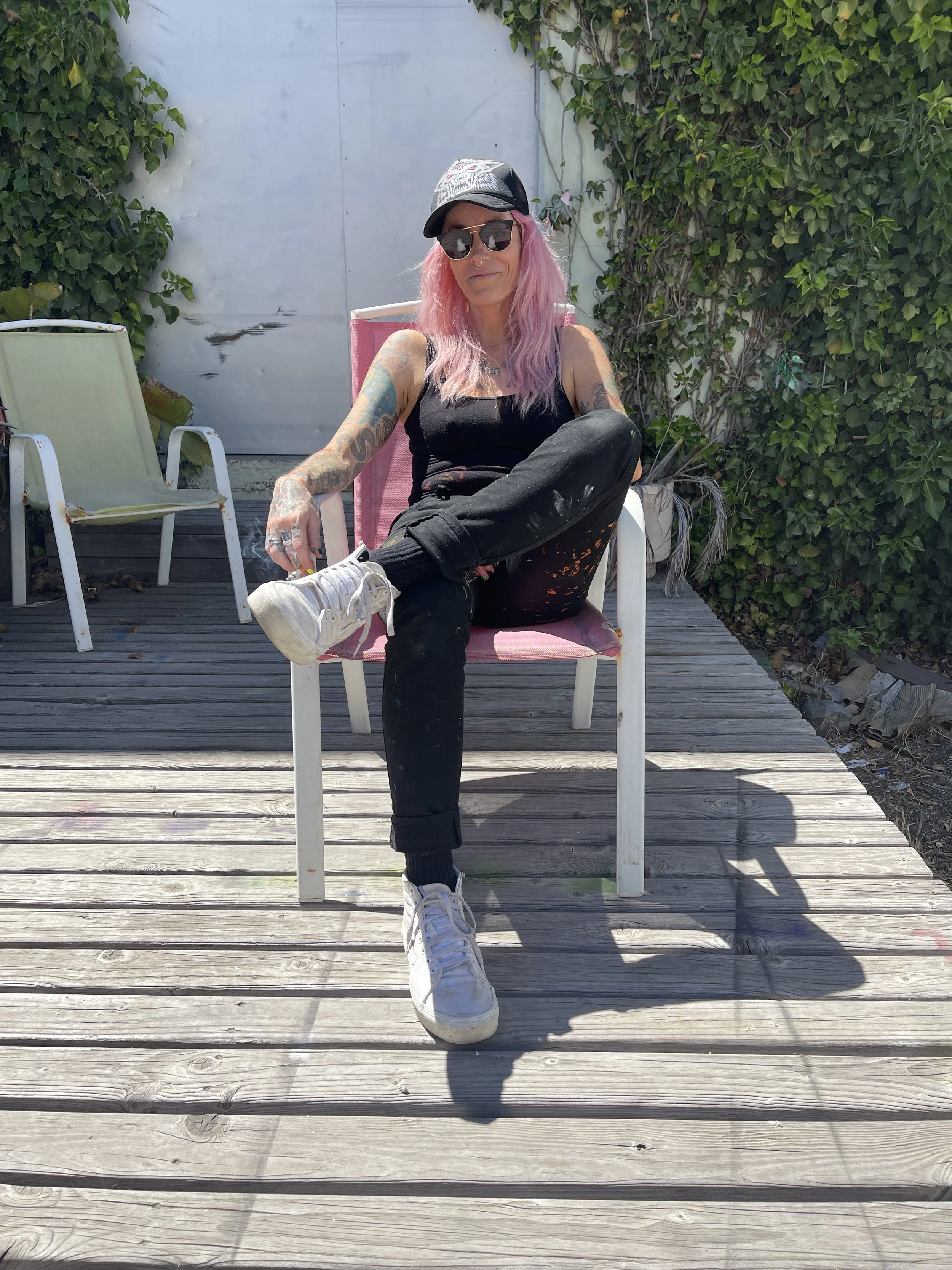Britt, to this day, doesn’t paint about the “bad shit” as she says. Her work is unapologetically positive and celebratory and it can be—because it foremost acknowledges the gratitude she has just to still be alive on this earth and for the opportunities she’s been given to create. It doesn’t forget that this wasn’t always the reality, and it could very well not be, as addiction strips these things from so many. Britt gets high on color now. And the ecstatic nature of her work is testament that starting over is possible, and a better life can always be found.