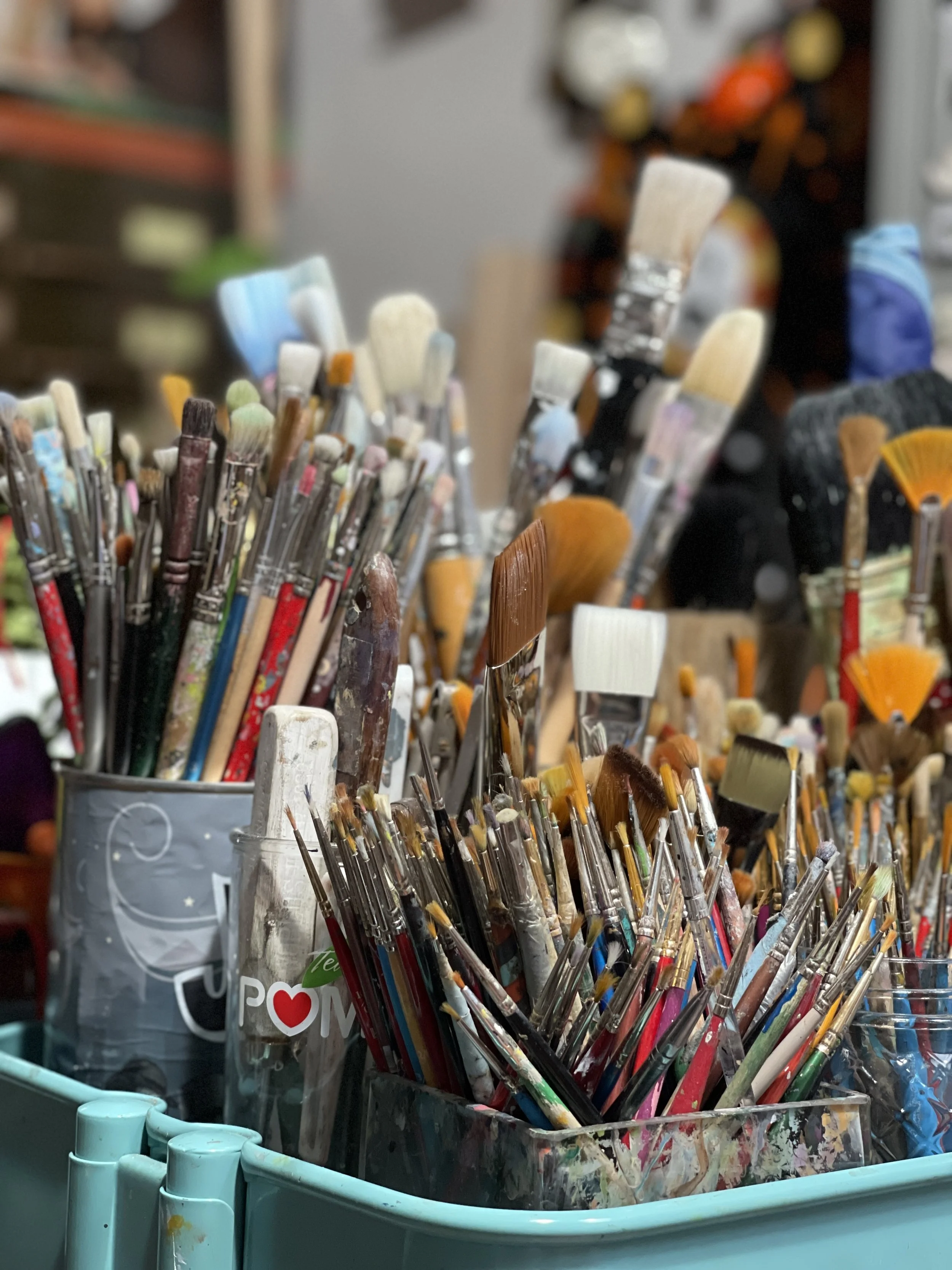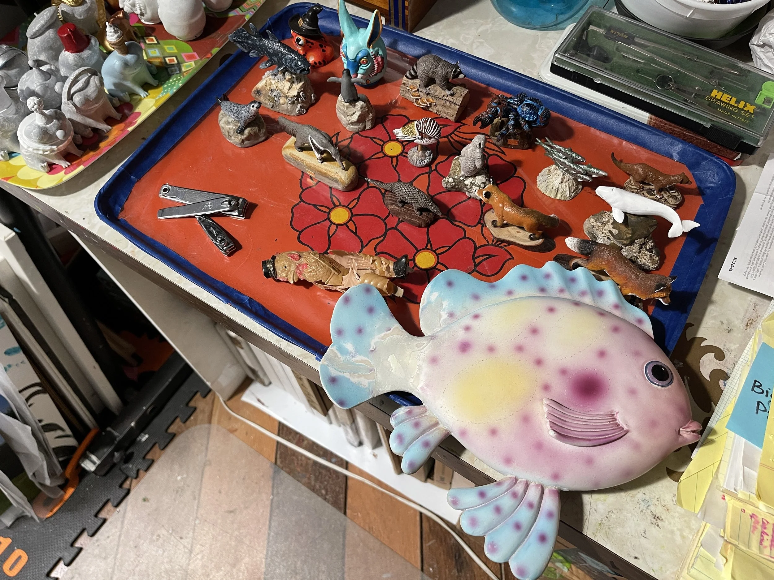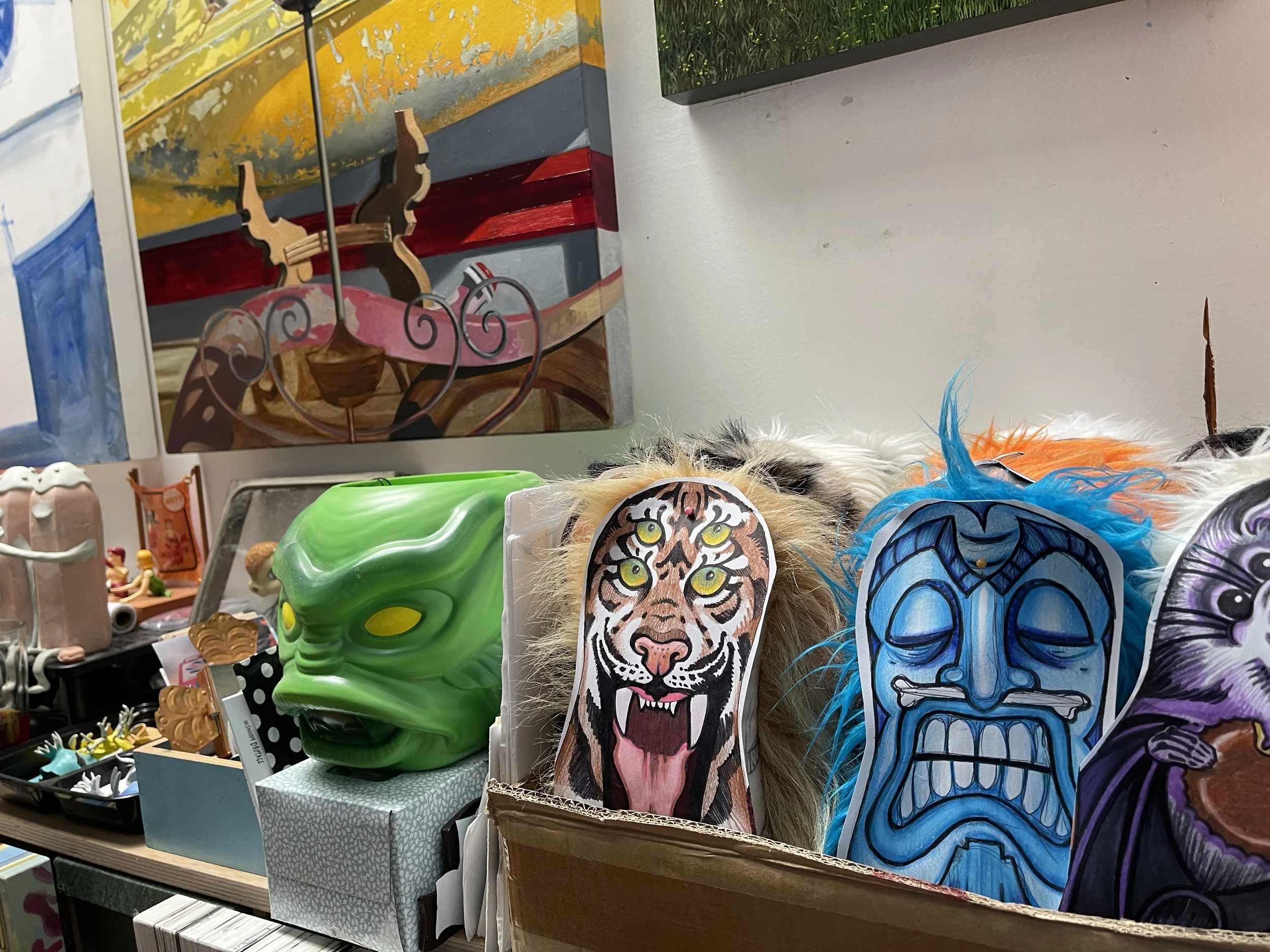 I kinda hoard craft supplies. Need black hot glue? Any color of felt? Need to gold leaf something at midnight? Weirdly enough I got it and so much more. For example, during shelter-in-place I designed and stitched up a dozen carnival punks just for fun. I looked around and thought yea, I don’t even need to go shopping. I had a dozen kinds of fake fur, heavy canvas, pillow stuffing, buckets of colorful thread, and acrylic paint all in studio. There were not many art shows during the first two years of Covid so yea, I made carnival punks..