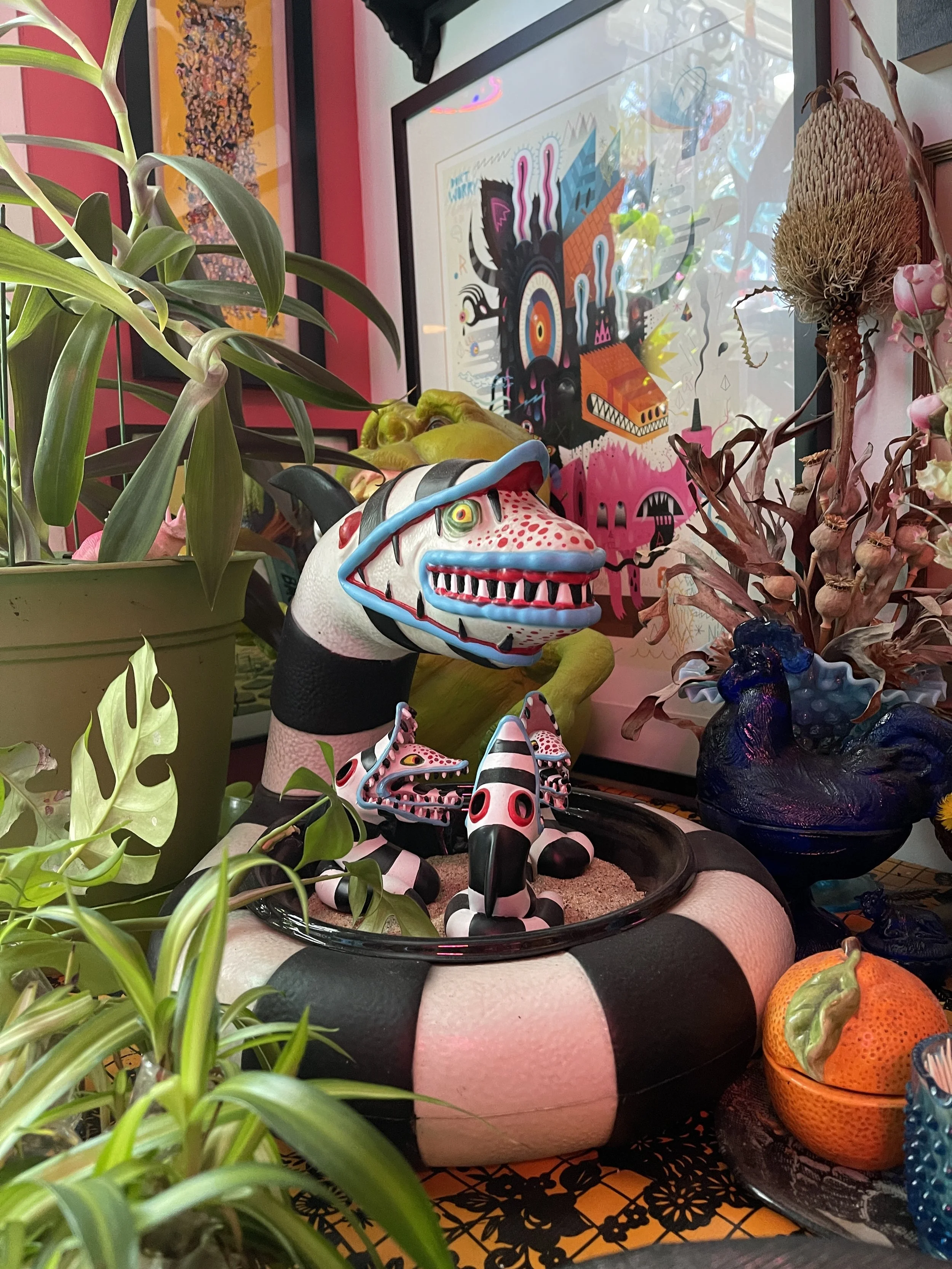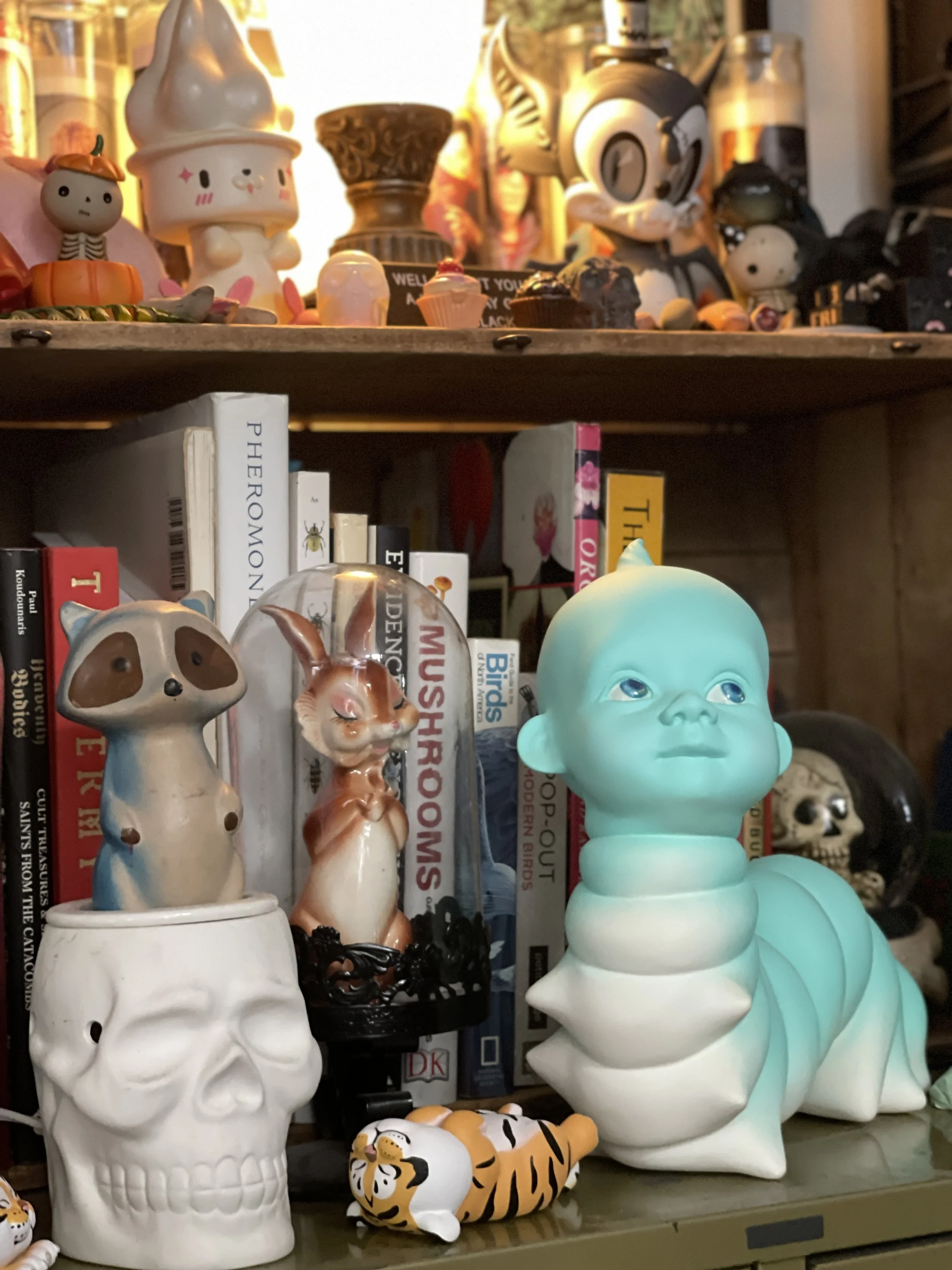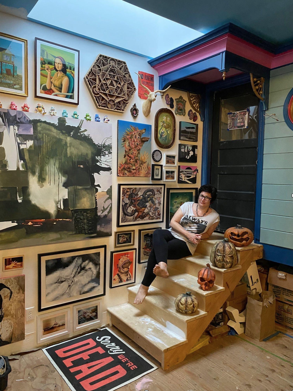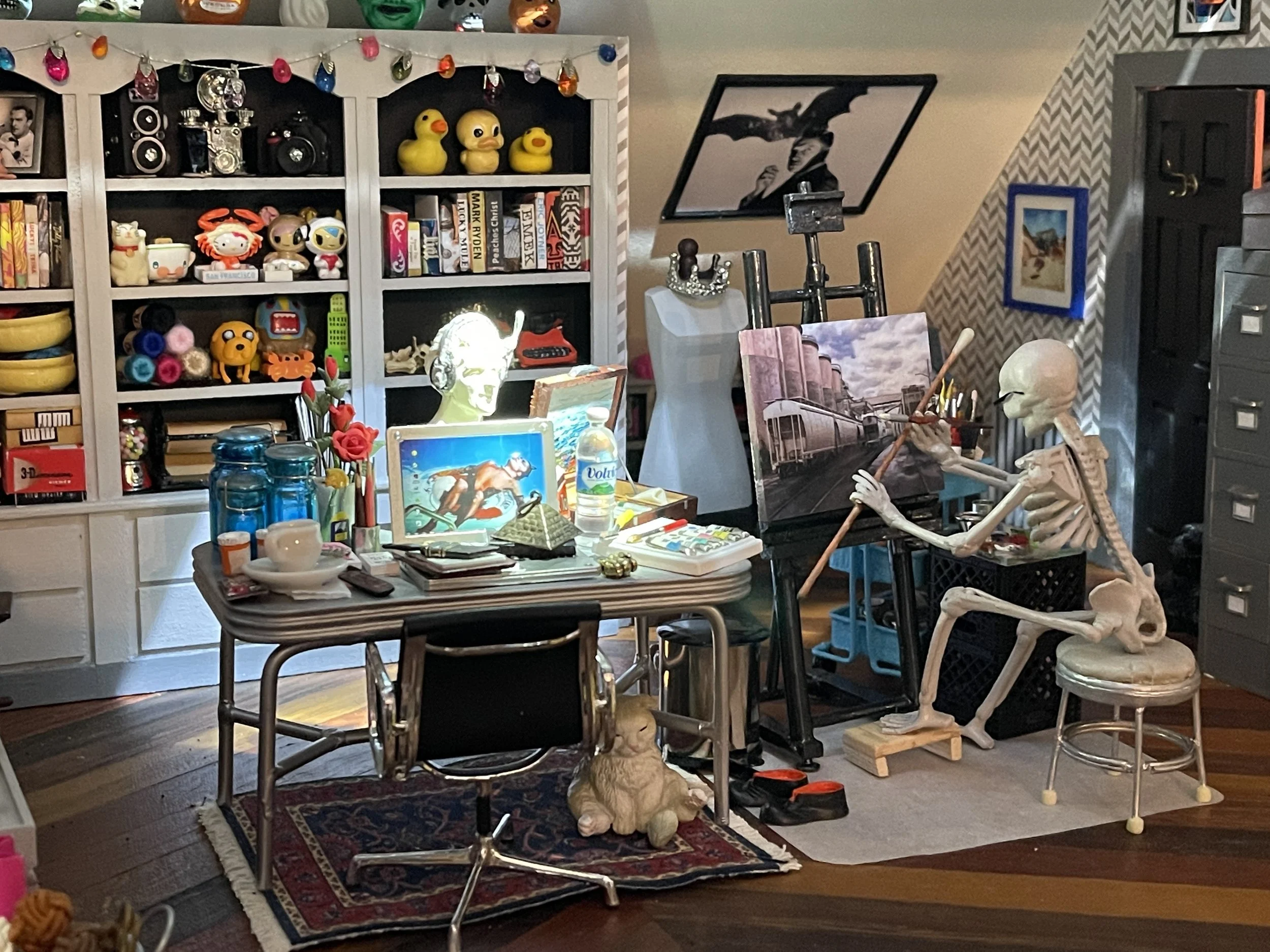 Featuring an extensive collection of Halloween paraphernalia, a bathroom decorated with vintage nudie photos, and even a small Victorian house within-their-house; Jess and Mars’ abode is the stuff that artsy, Meow Wolf style tourist attractions are made of. I doubt selling tickets and letting hordes of strangers into their home is on their agenda any time soon, but if they do I will be one of the first people in line. Centered in the middle of their home is Jess’s studio and workspace which hosts her sweeping masterpieces along with any number of other craft projects she’s expertly working on at the same time. My favorite of these is probably the “wee” houses—elaborate dollhouses that look to have almost as much attention put into them as their main house, only in painstaking miniature. Jess also has the interesting custom of fabricating teeny tiny works of art for the wee houses in instances where she can’t find or afford an original from an artist. After seeing their home I can safely say that never before has being a “stuff” person seemed so downright appealing.