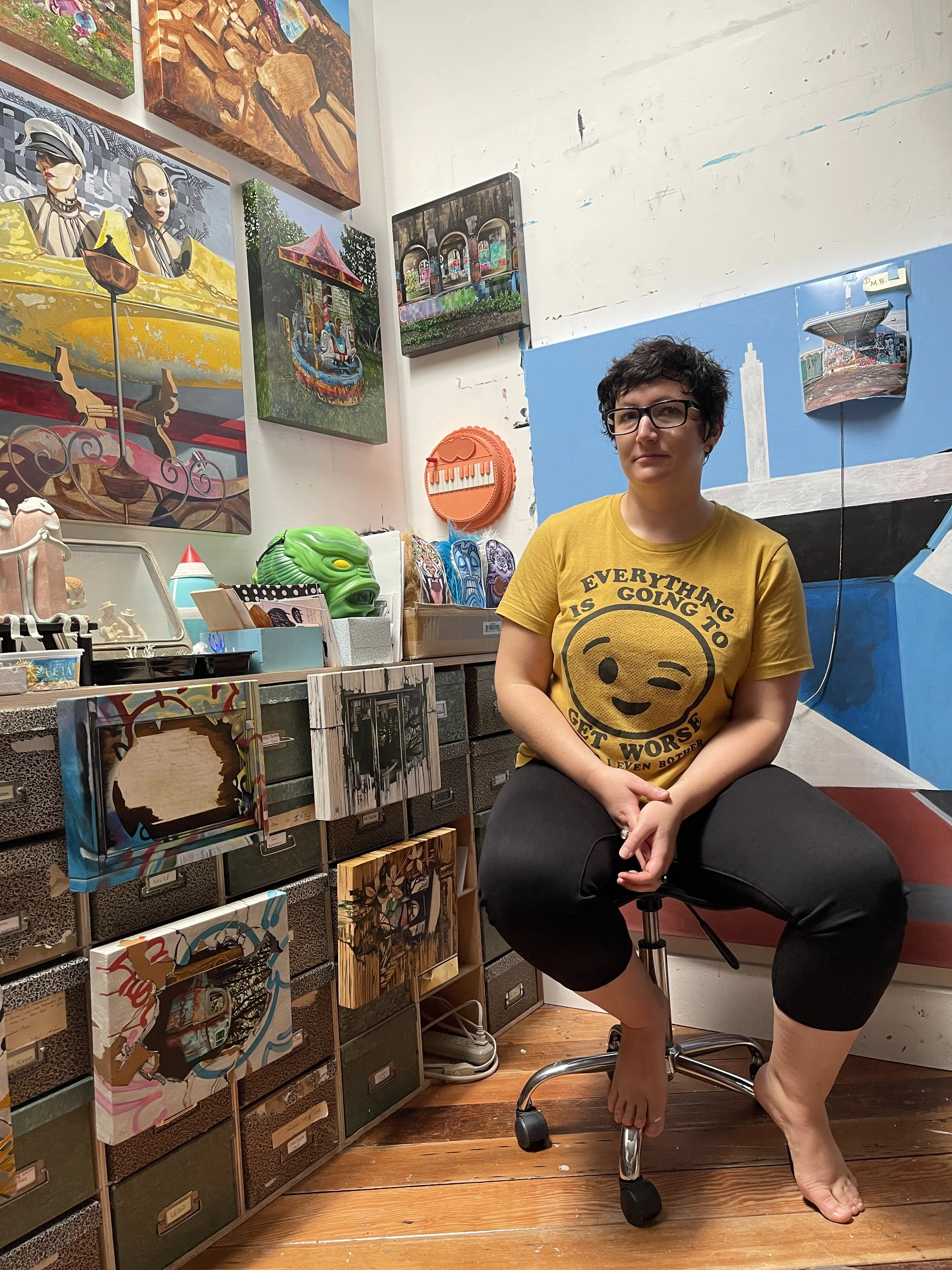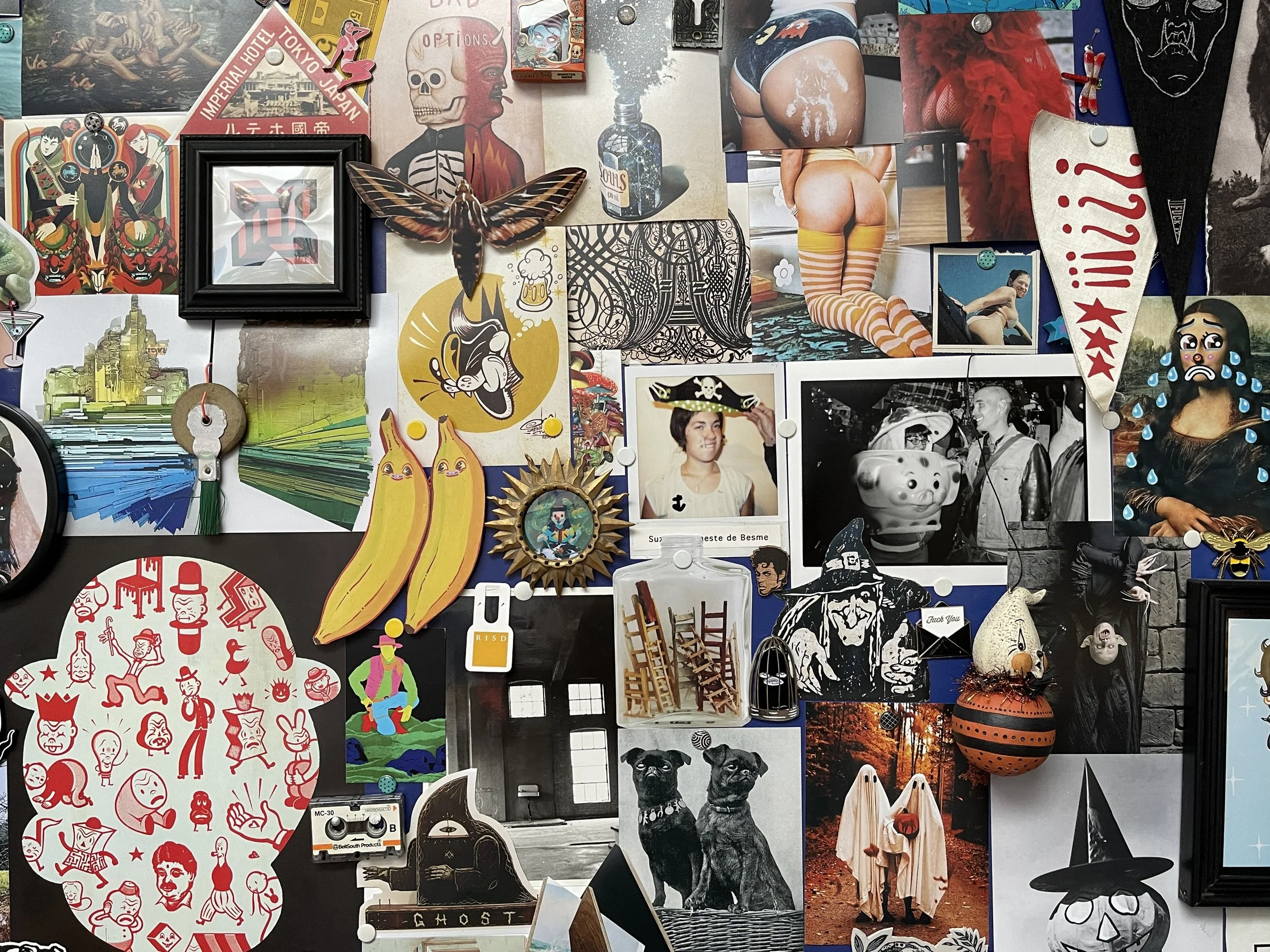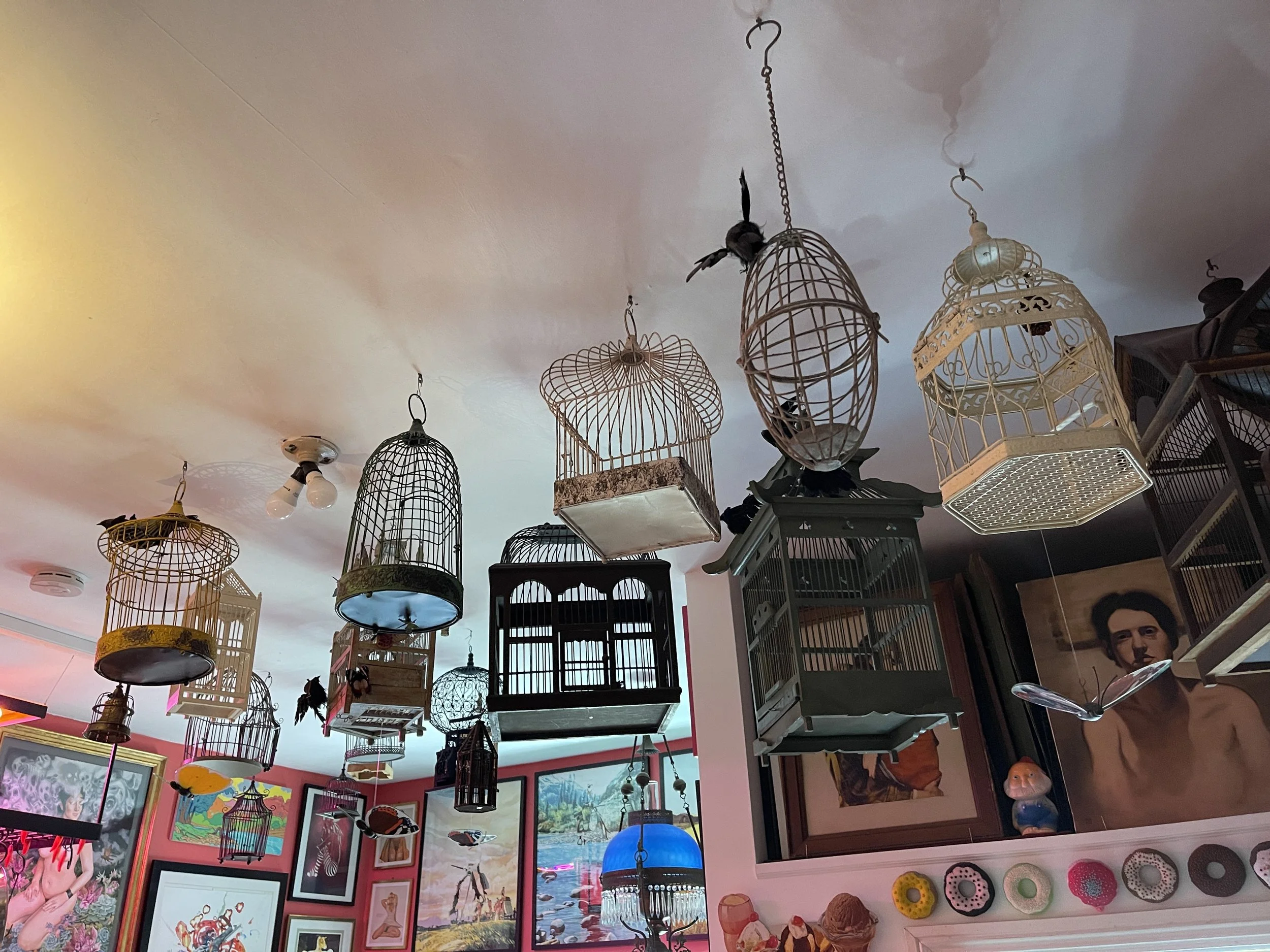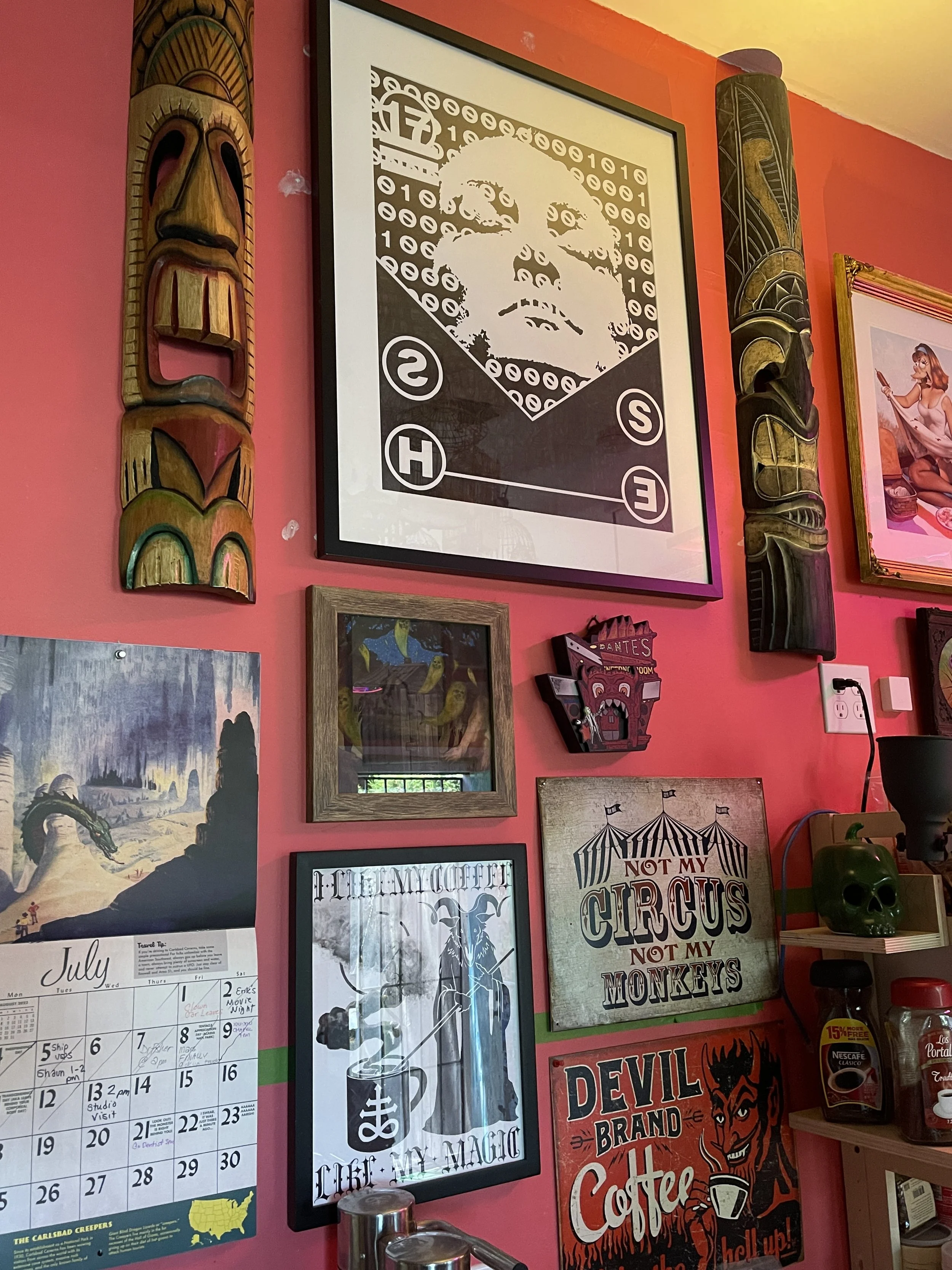 Featuring an extensive collection of Halloween paraphernalia, a bathroom decorated with vintage nudie photos, and even a small Victorian house within-their-house; Jess and Mars’ abode is the stuff that artsy, Meow Wolf style tourist attractions are made of. I doubt selling tickets and letting hordes of strangers into their home is on their agenda any time soon, but if they do I will be one of the first people in line. Centered in the middle of their home is Jess’s studio and workspace which hosts her sweeping masterpieces along with any number of other craft projects she’s expertly working on at the same time. My favorite of these is probably the “wee” houses—elaborate dollhouses that look to have almost as much attention put into them as their main house, only in painstaking miniature. Jess also has the interesting custom of fabricating teeny tiny works of art for the wee houses in instances where she can’t find or afford an original from an artist. After seeing their home I can safely say that never before has being a “stuff” person seemed so downright appealing.