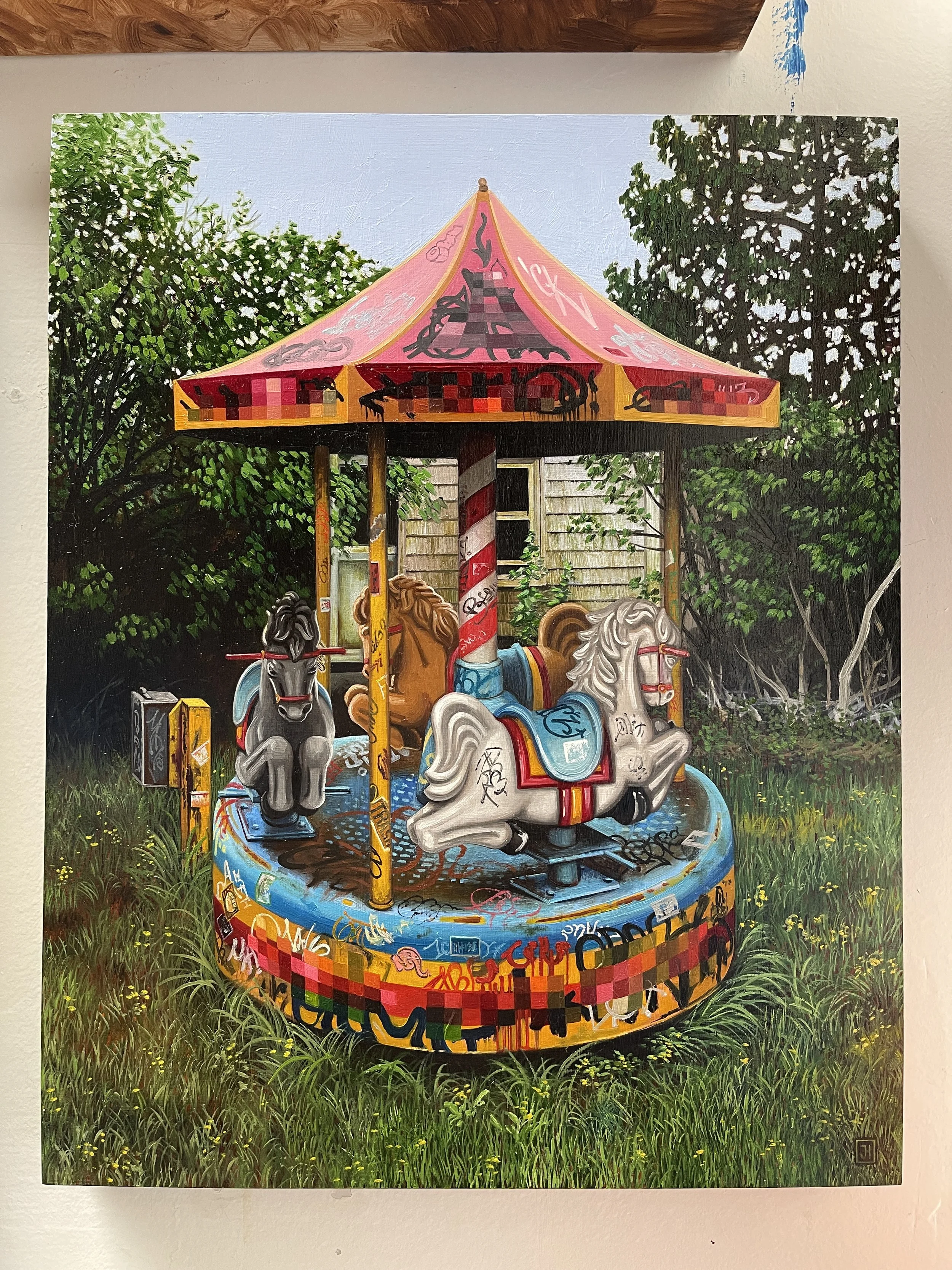 As for Jess’s main art practice, it’s on a level entirely it’s own. Pioneering a style of hyperrealist oil painting that focuses on the dilapidated ruins of urban society, often sheathed in layers of graffiti and vandalism—Jess’s latest series brings these vivid depictions of abandon and decay into our ever-evolving modern age by incorporating hand-painted pixellation techniques. This new work draws interesting lines between her classically trained approach and very corporeal subject matter—and the digital revolution we are all being inadvertently drawn into. It is left to the viewer to then ponder all of the existential questions posed therein. Personally, I find there to be a sublime beauty that Jess has discovered in this juncture between the debris of an old world and the advent of one that is new and still not yet fully understood. There are also hints of longing in this contrast—and perhaps consternation—as is common when on the verge of a total transformation as a society and as a species. And however one might feel about what the nuances of this new work may suggest, one thing is certain—it’s important that it exists, as it always falls into the lap of great artists to document the human experience in the most pivotal moments of history.