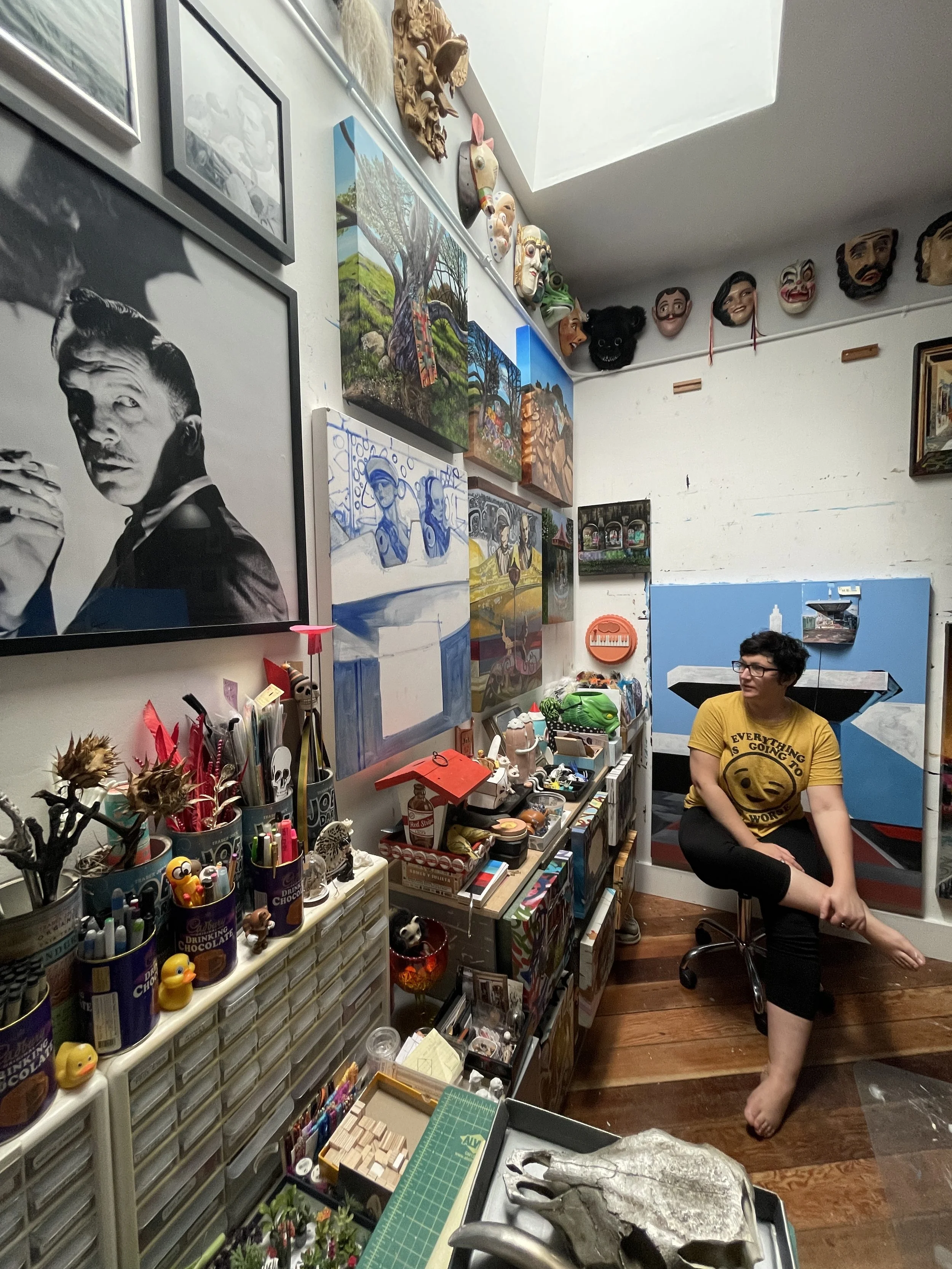 Jess Hess is someone I am ceaselessly impressed with. Aside from being a phenomenal and innovative oil painter, she’s earned a longstanding reputation as an important member of the Bay Area artist community and huge supporter of fellow artists. On top of collecting more art than any other artist I’ve ever met, she has a long history of standing up for herself and others—often in situations where nobody else would. In tandem with our upcoming exhibit “Constant Variables” featuring Jess and veteran collage artist Hope Kroll who I have also been a longtime fan of, I made a trip to visit Jess’s home which she and her partner Mars have been steadily building into a beautiful, colorful oasis from near scratch in an old industrial building in Oakland. Seeing this place and all of the love and inventiveness being poured into it, as well as the countless other crafts, hobbies, and projects Jess keeps on the side, has multiplied my already enormous appreciation for her and everything she does.