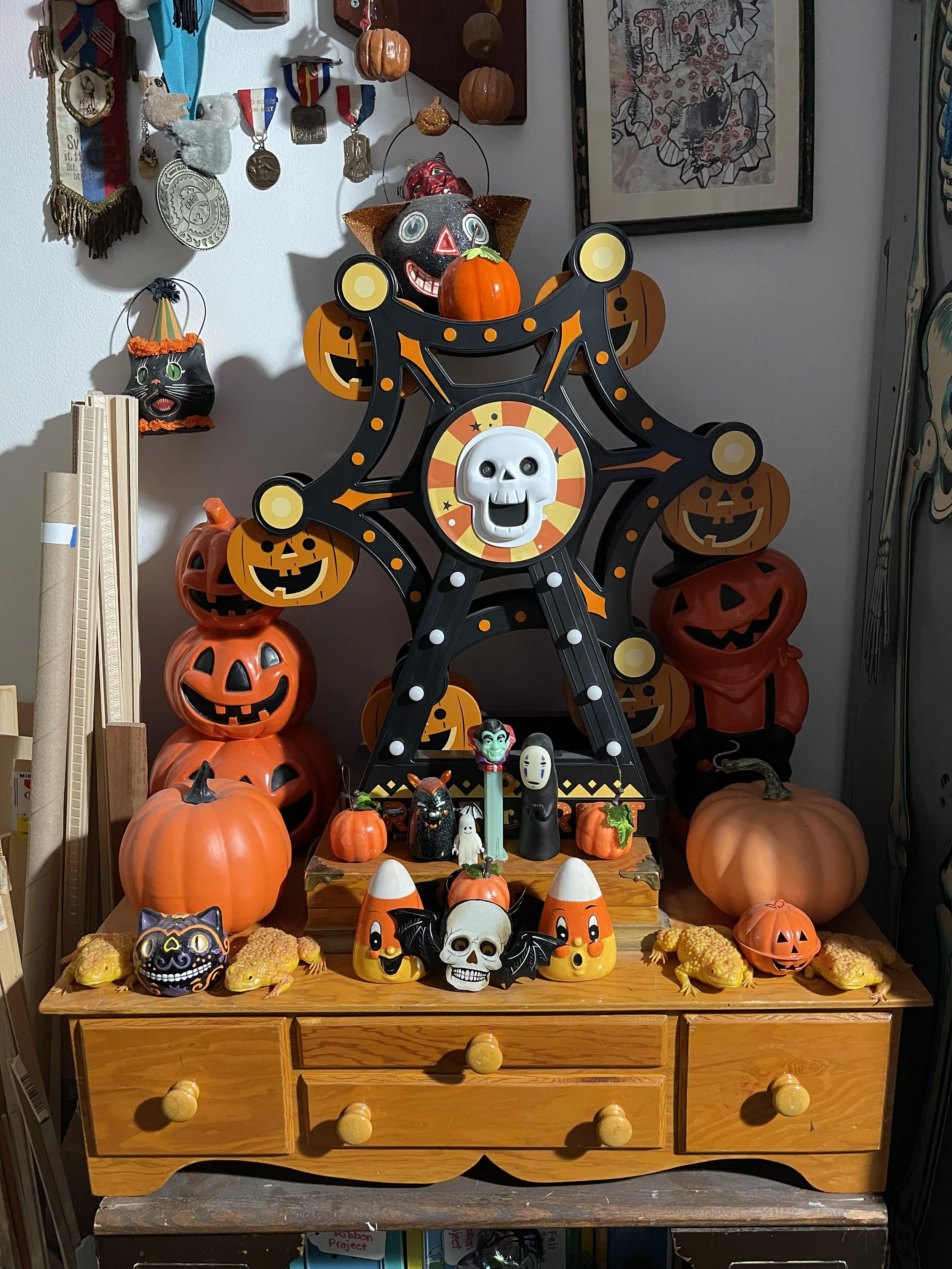 I like sculpting and painting my own original toys. I get back to my Illustration Major roots when I make Adventure Time and Bob’s Burgers fan art. Just for fun, just for me. I have fun making pop-up cards for my father. Every October I make some pretty elaborate Halloween costumes for myself and select friends. I am sure to never schedule art shows for the month of October as these are my personal “High Holy Days” during which I carve a dozen pumpkins, make costumes, and do some major home decorating. But honestly, my Halloween decor is up all year.