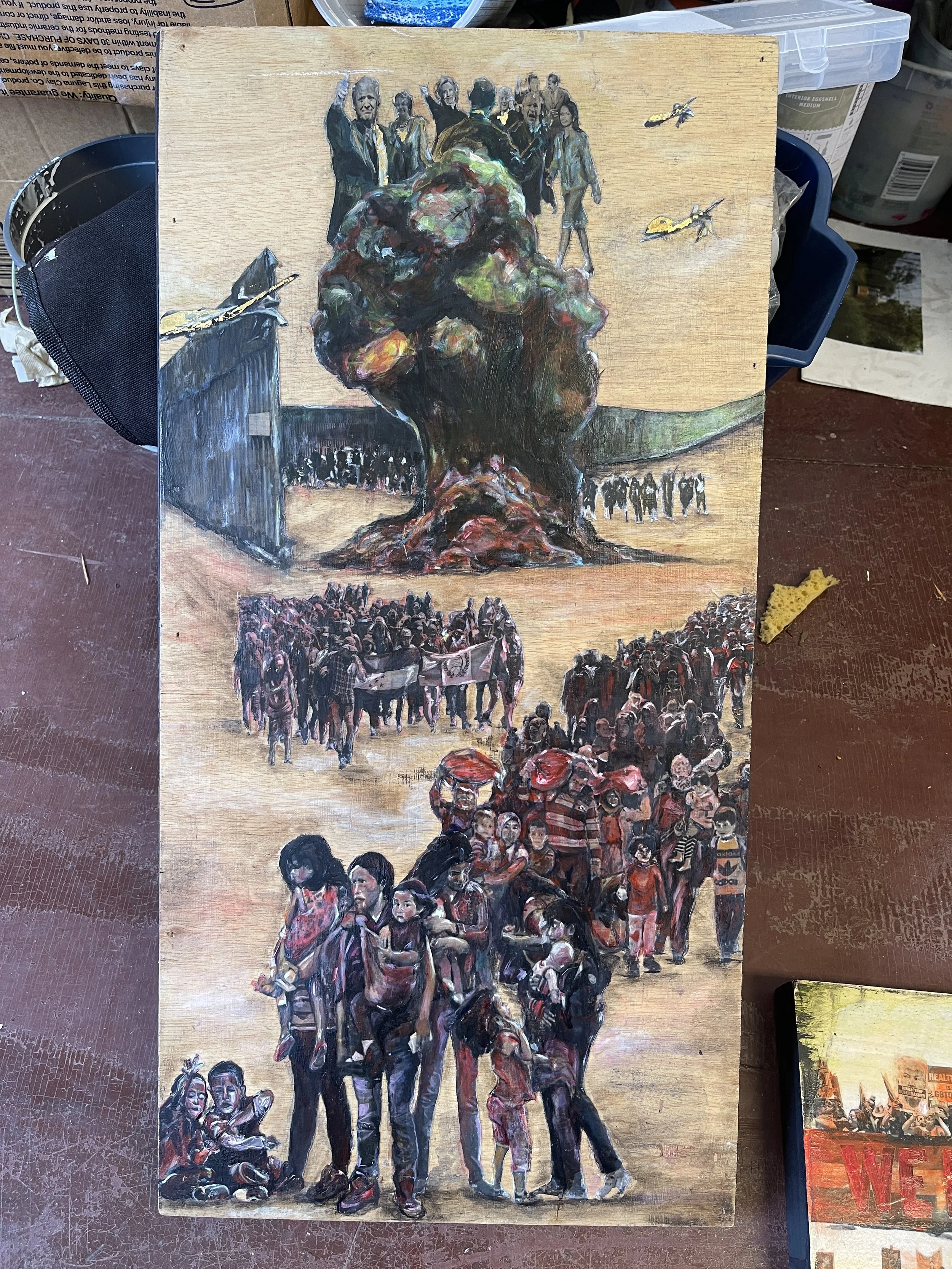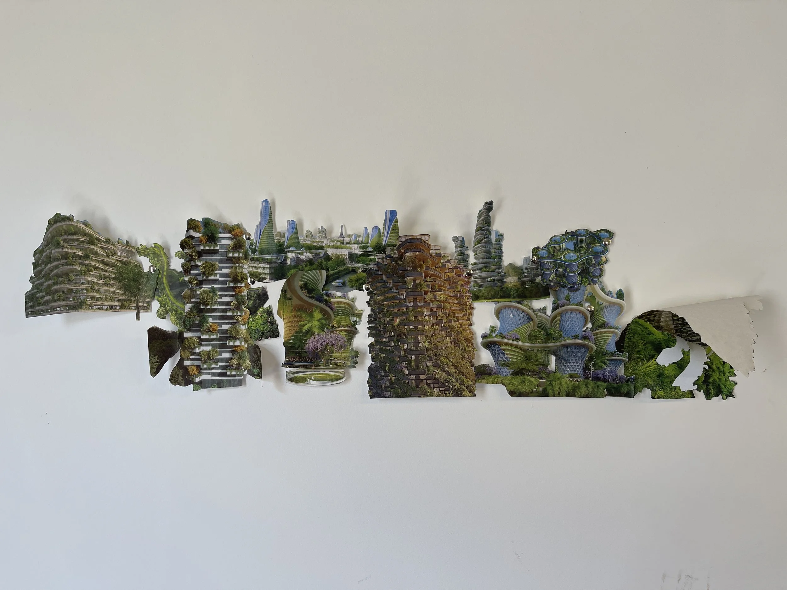 The painting depicts a version of Oakland that has green belts and public light rail lines instead of being polluted and choked by highways and private cars. Instead of the gray concrete of the city, I depicted an urban forest to give an idea of what a more ecologically harmonious Oakland would look like. This vision of a future Oakland, however, is obstructed by the metal gate sculpture, symbolizing the current societal and economic barriers that stop us from attaining this reality.
