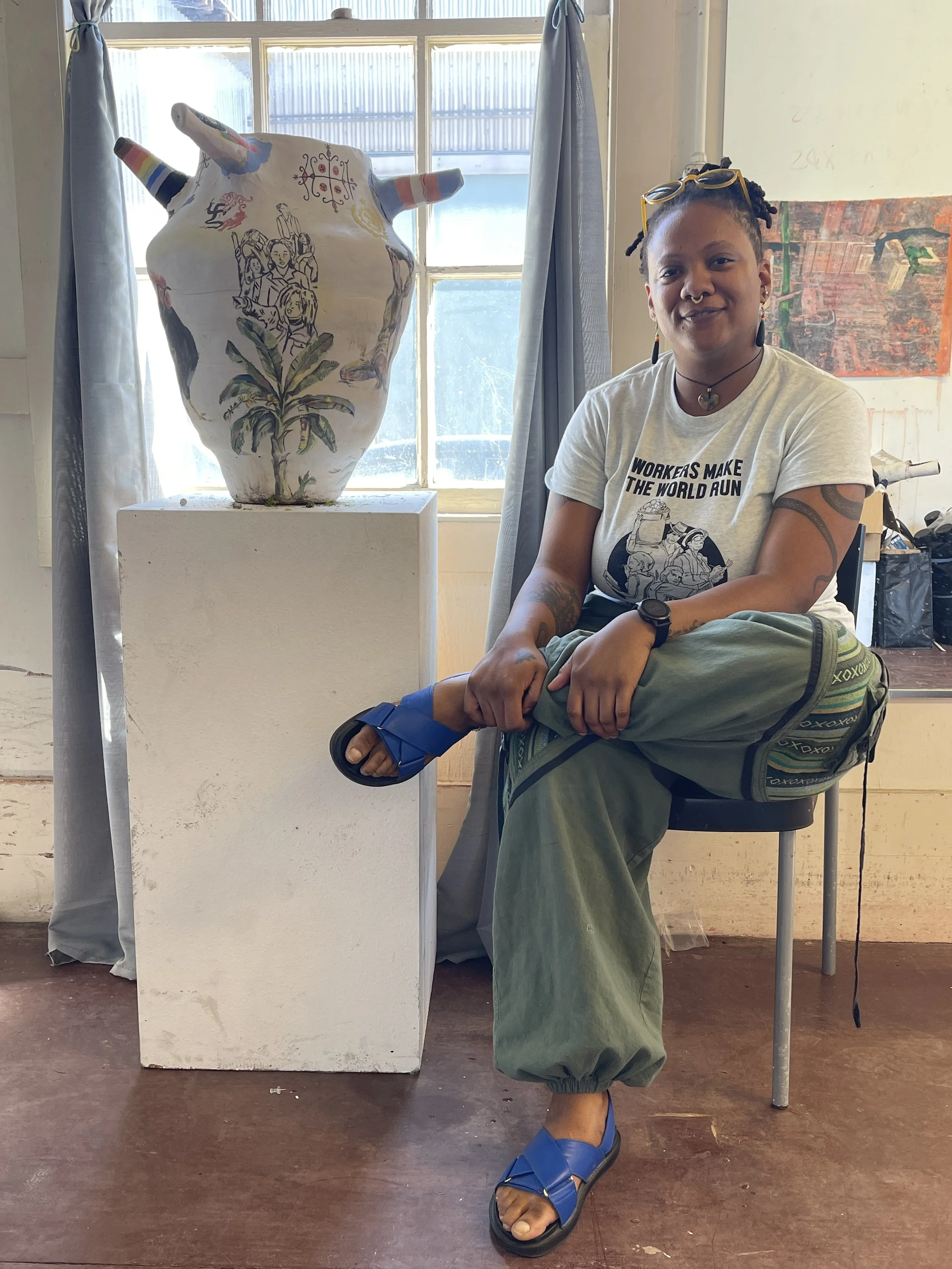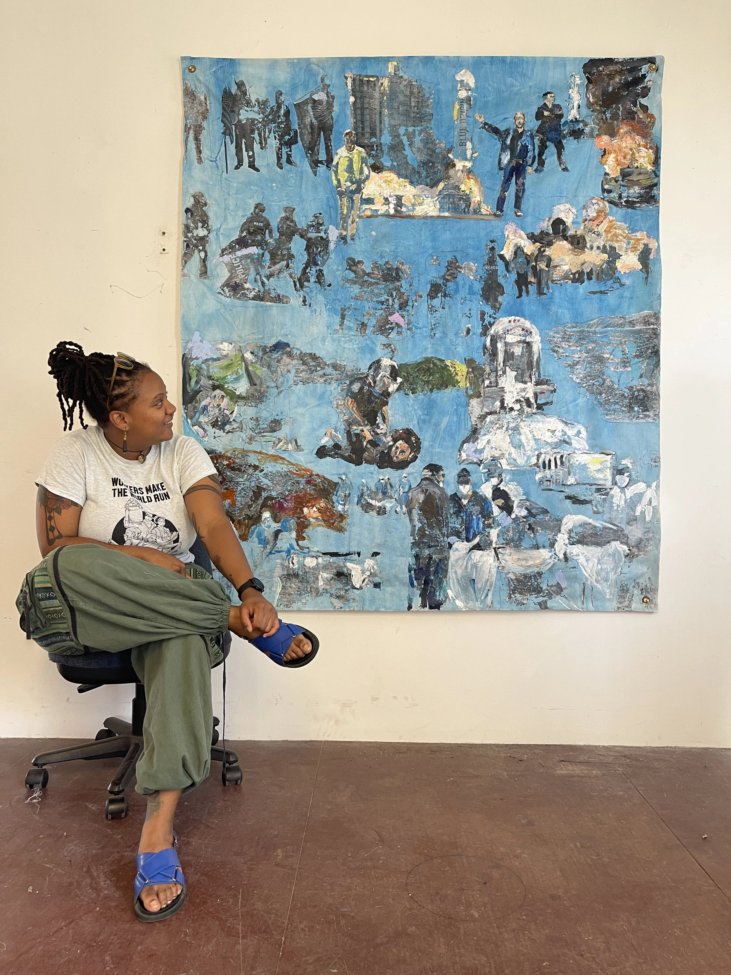 So at a very young age, class, economic inequality and state instability were things I was aware of and had to confront. Some of these were things that I also had to come to terms with again when I came to the US, where on top of the issues that arise with being Black immigrants here we also went from being middle-income working-class to becoming low-income working-class. All of this gave me a strong sense of civic duty and made me realize that a lot of these struggles were interconnected. This is why in my work, I pull from examples of international struggles and fight for the liberation of the oppressed and exploited.
