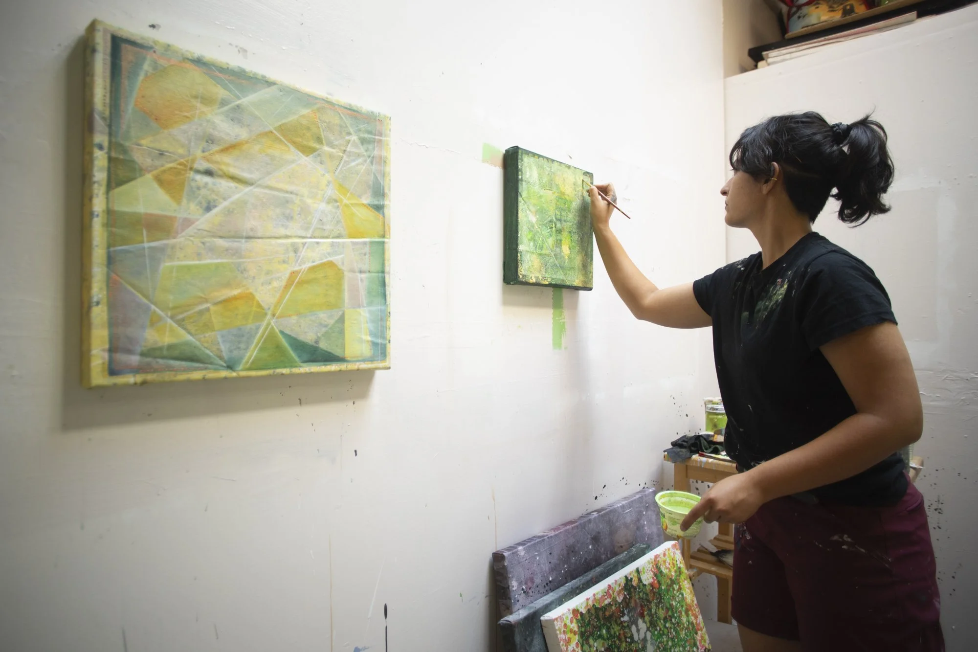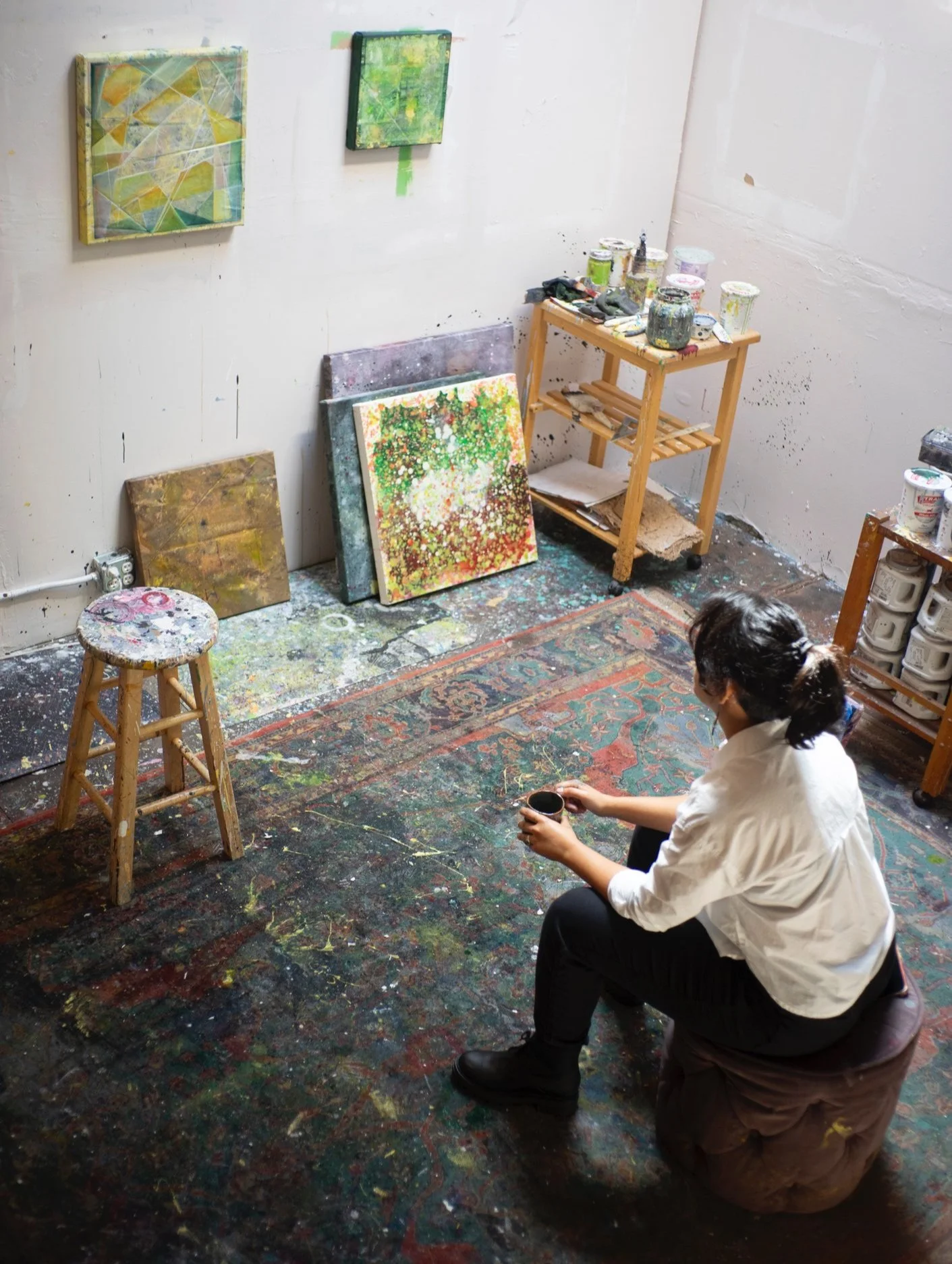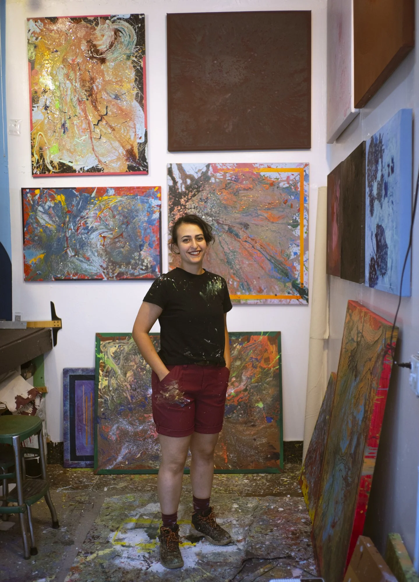 In a cozy artist warehouse at the edge of The Mission District, in one of the numerous points where San Bruno Ave is interrupted with an overpass of the 101, I met Termeh Behbahani pouring color on canvases in her studio. Behbahani’s studio is quaint, a skylight illuminates the room, the walls are lined floor to ceiling with finished art, works in progress, paint and mixers for paint, splatters of paint on the floor and a lofted nook where she decompresses. Behbahani offers coffee and we set out to discuss her practice as an abstract studio artist and a muralist. Her two styles of work are vastly different in approach and aesthetic but the core of her process remains consistent, finding control and herself within the color.