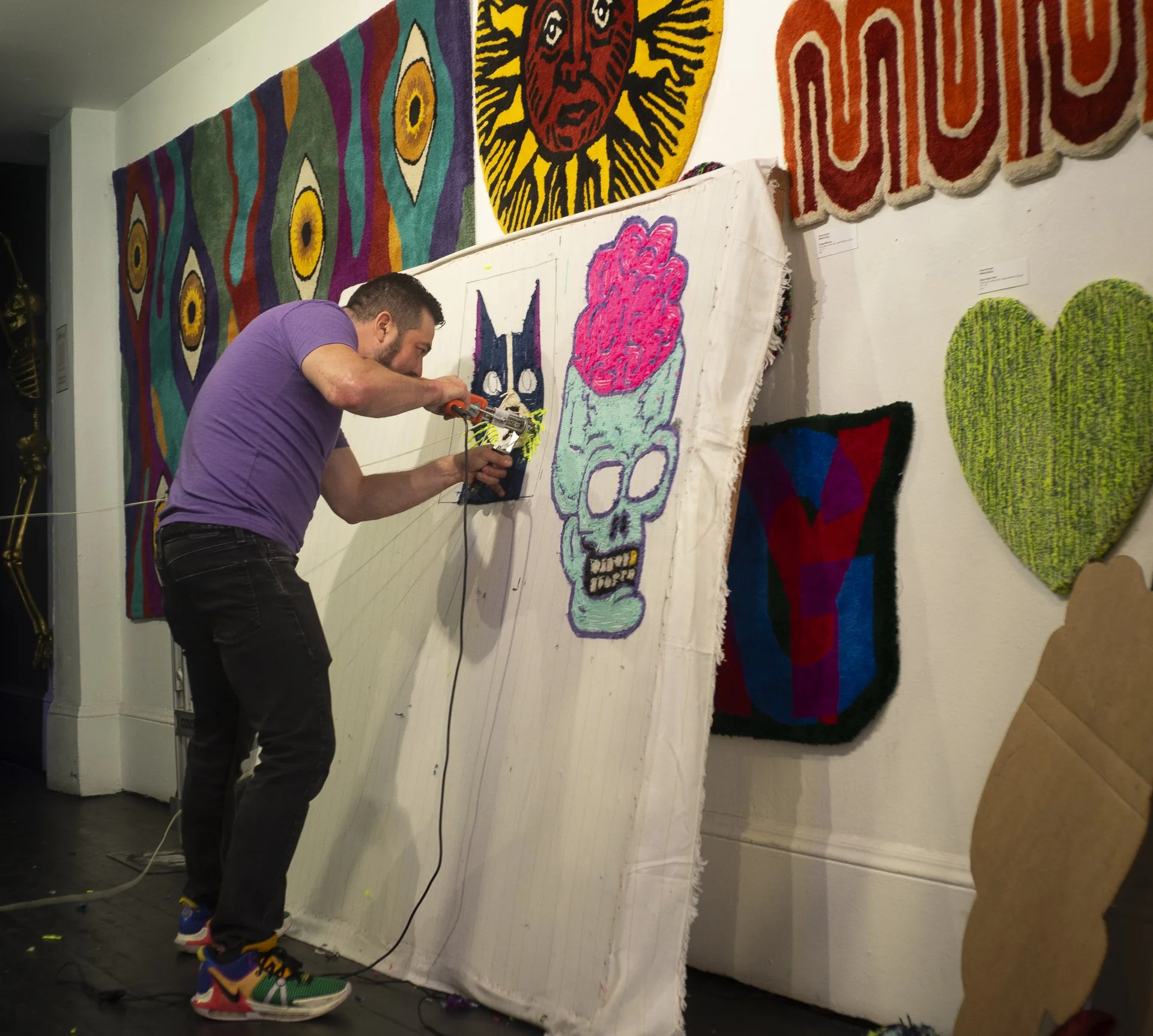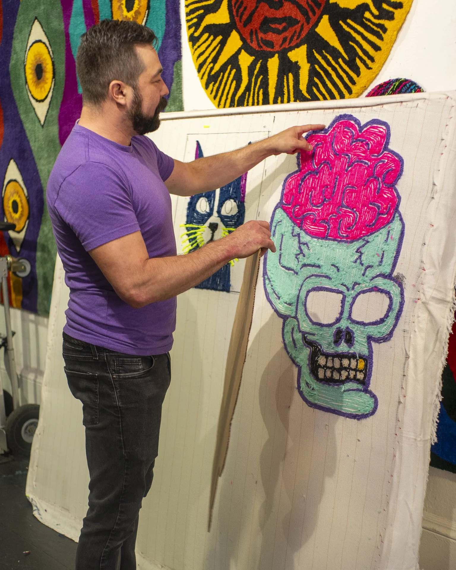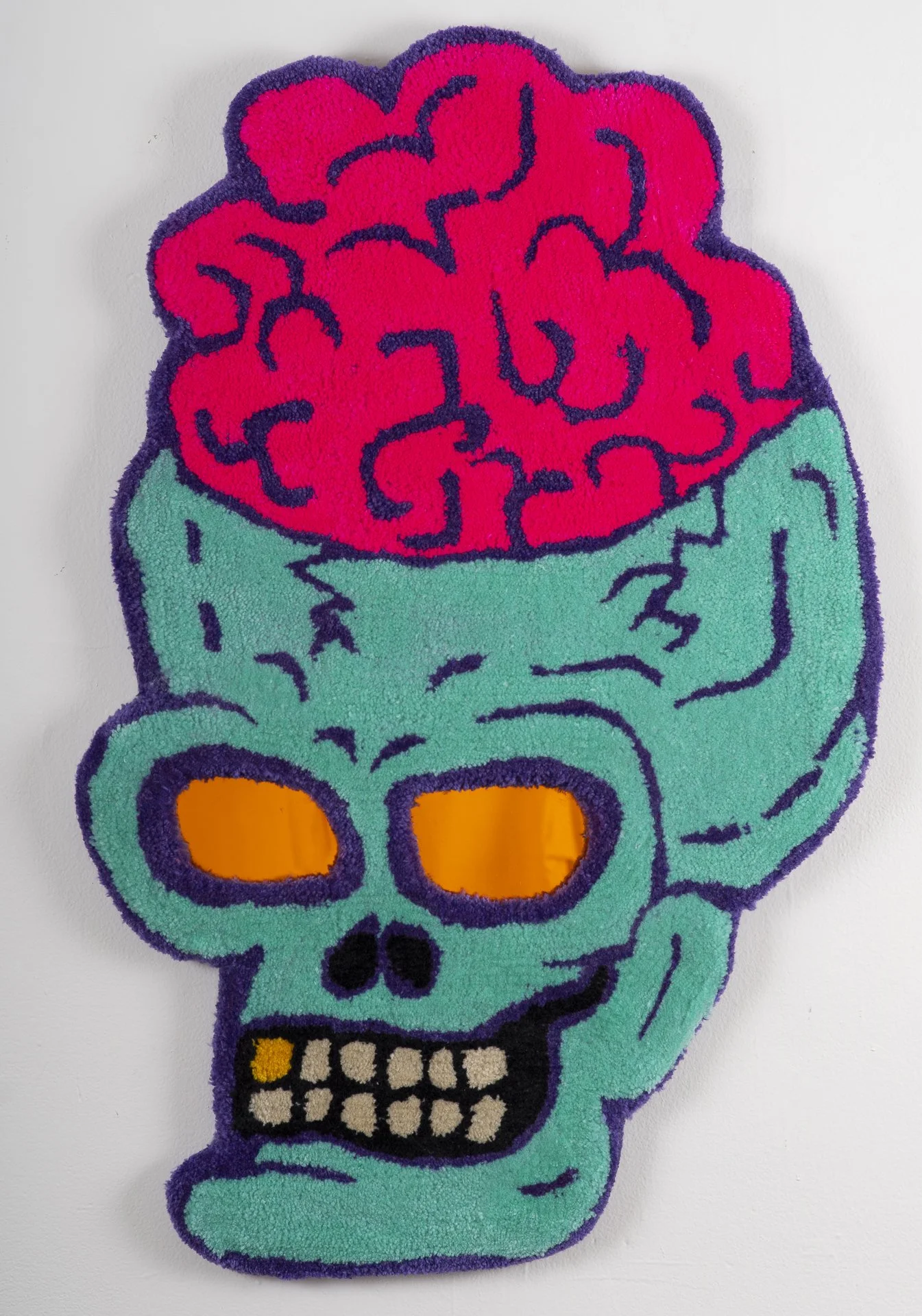 Cabure is a curator and creative who stays busy as a photographer, art collector, plant propagator and rug maker. His most recent tufted rug, ‘Brainiac’ is part of Moth Belly Gallery’s 6th Annual Fundraiser Auction & Group Show. ‘Brainiac’ is a plush brightly colored tufted rug in the shape of a turquoise blue skull with a protruding visible brain reminiscent of the Martians from Mars Attacks.