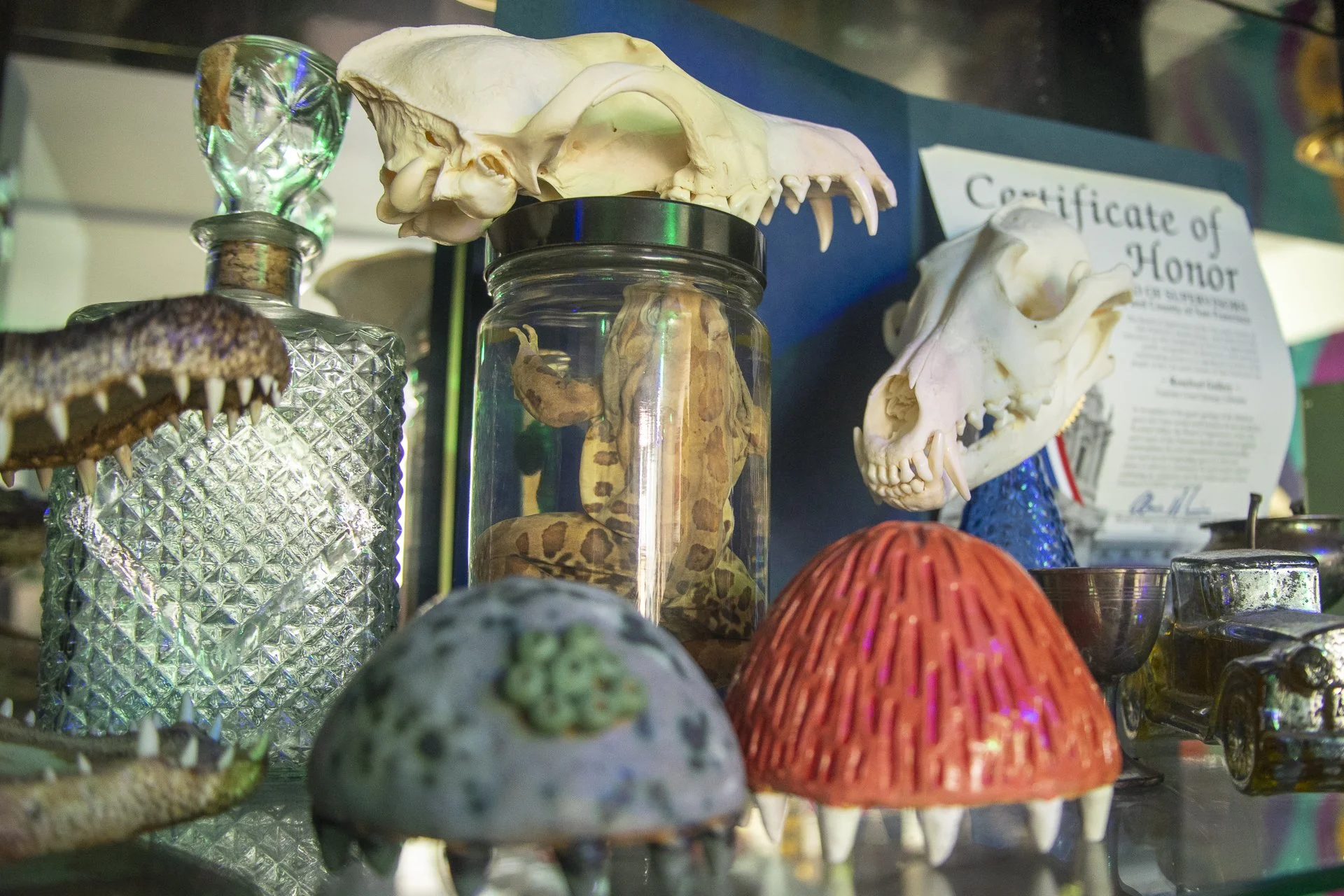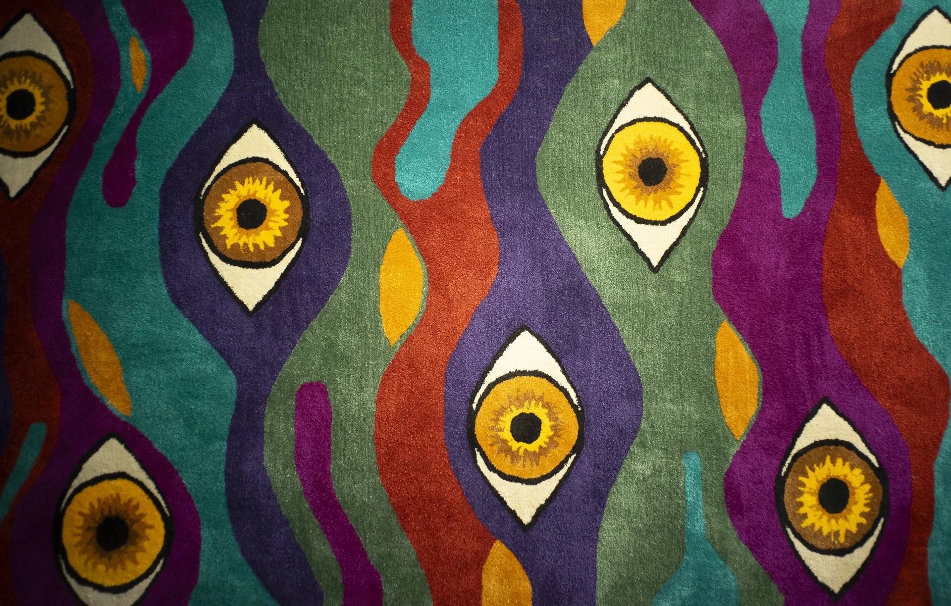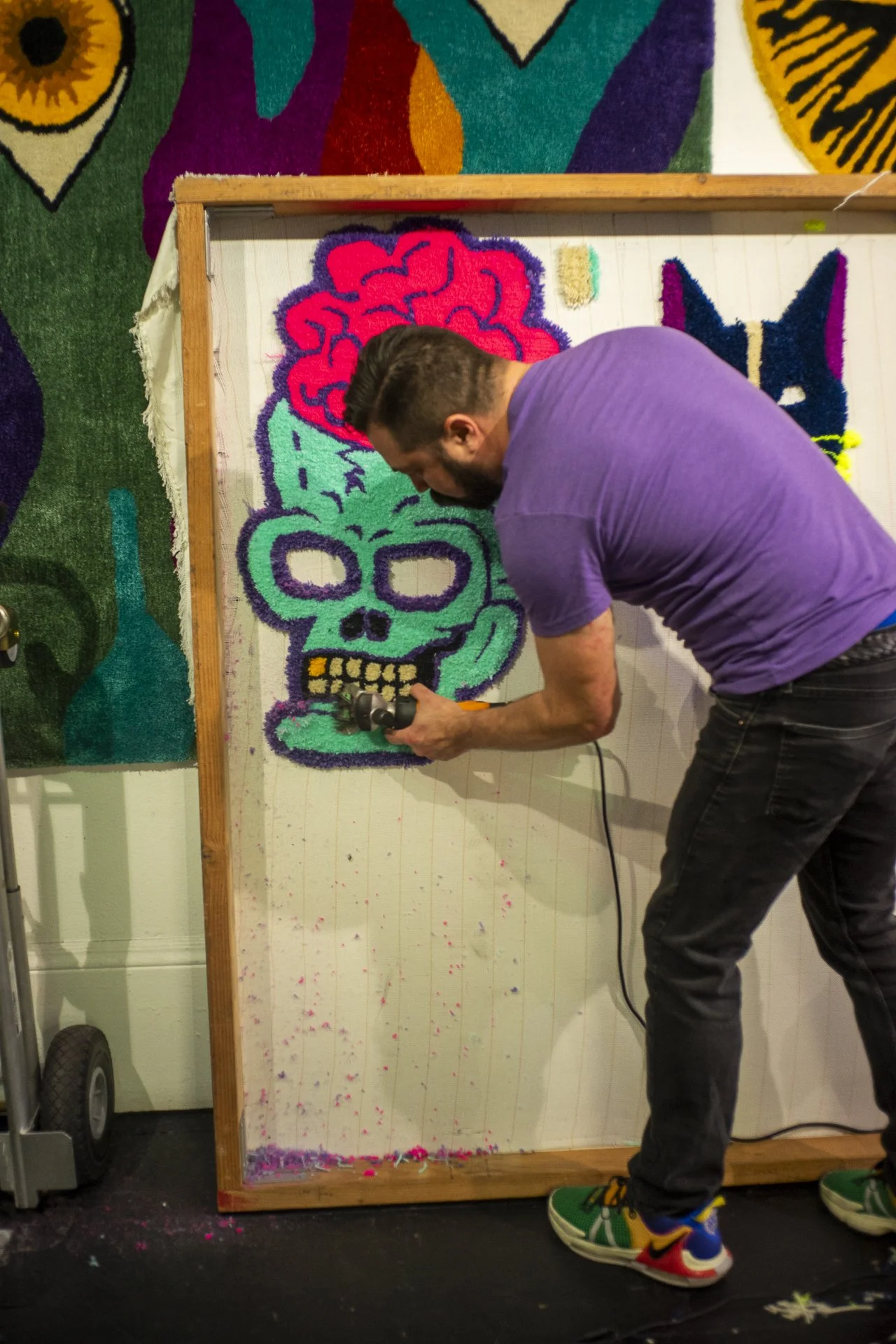Cabure is a curator and creative who stays busy as a photographer, art collector, plant propagator and rug maker. His most recent tufted rug, ‘Brainiac’ is part of Moth Belly Gallery’s 6th Annual Fundraiser Auction & Group Show. ‘Brainiac’ is a plush brightly colored tufted rug in the shape of a turquoise blue skull with a protruding visible brain reminiscent of the Martians from Mars Attacks.