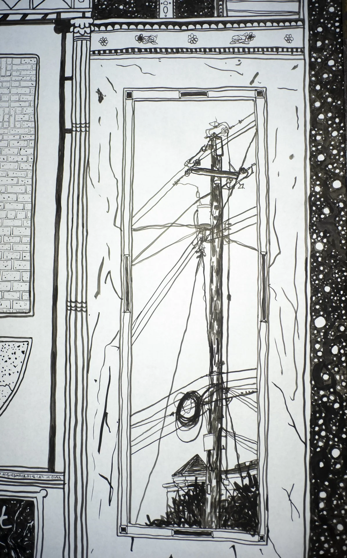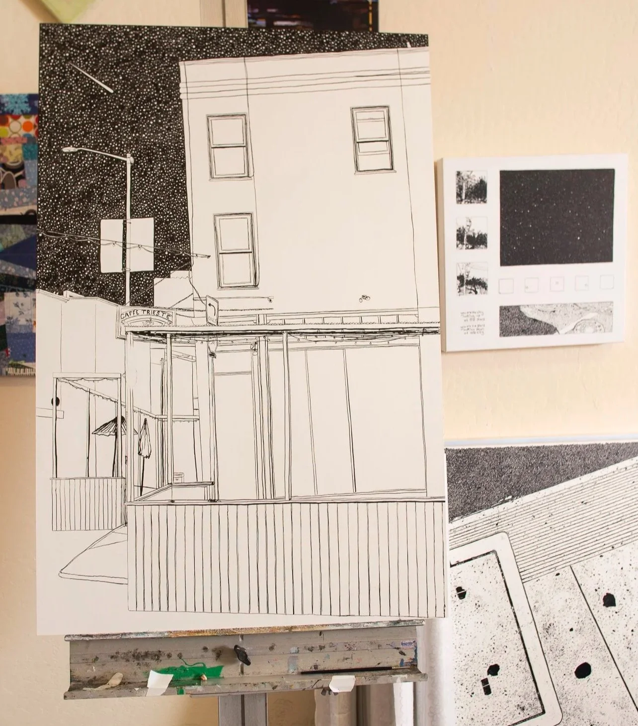 I met E Dyer at her studio inside Mini Mart on Geary and Leavenworth in San Francisco’s Tenderloin Neighborhood. I saw her work for the first time several years ago at Fleetwood’s 100 under $100 show. I was immediately struck and impressed by the ornate intricacies of the details, all in black and white, and how the art evoked a powerful observational presence. I was witnessing a moment, something bigger than a simple landscape, that warranted introspection. Dyer described her works as ‘Not straight-on street scenes. They’re more like glimpses and edges of things. You might be looking up at a building, or through a tangle of wires, or at something seen from a distance.’