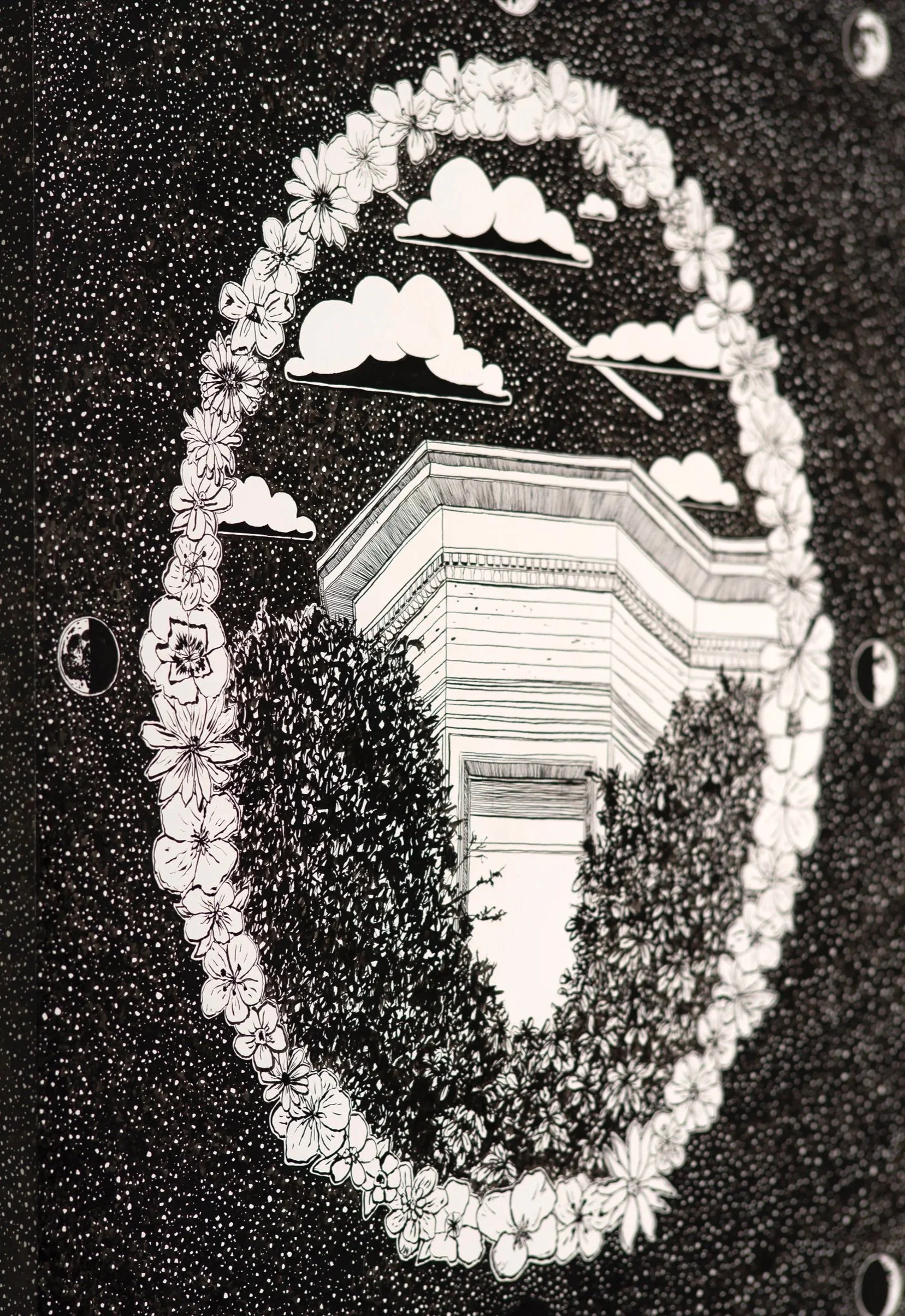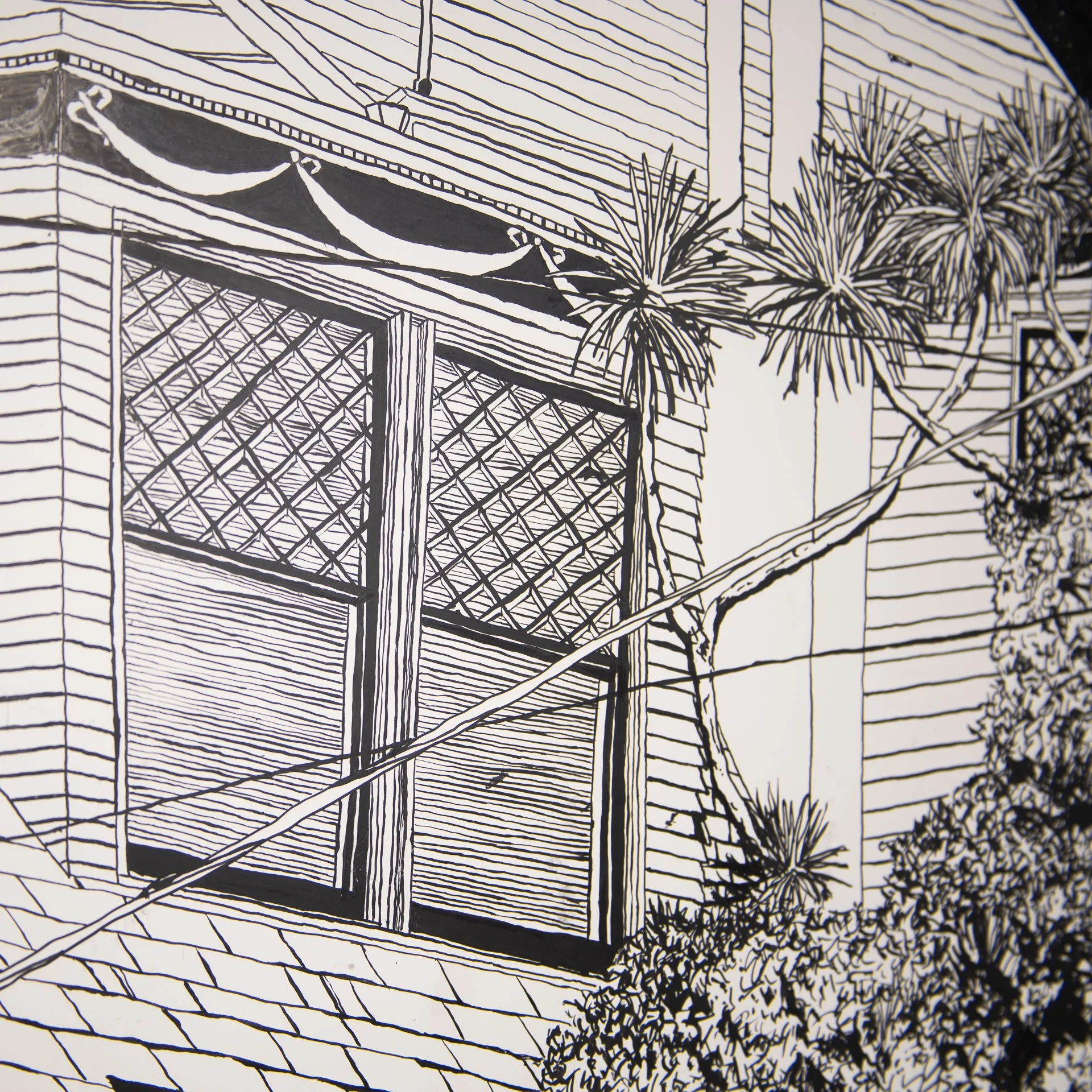 Many of Dyer’s works feature landmarks and environments ubiquitous to San Francisco, a monochromatic palette and an obsessive focus on the finer nuanced details of a scene. I was impressed to learn the only paint color used in her black and white works is black. She builds from the foreground to the background, leaving negative white space from the gessoed canvas for the white spaces.