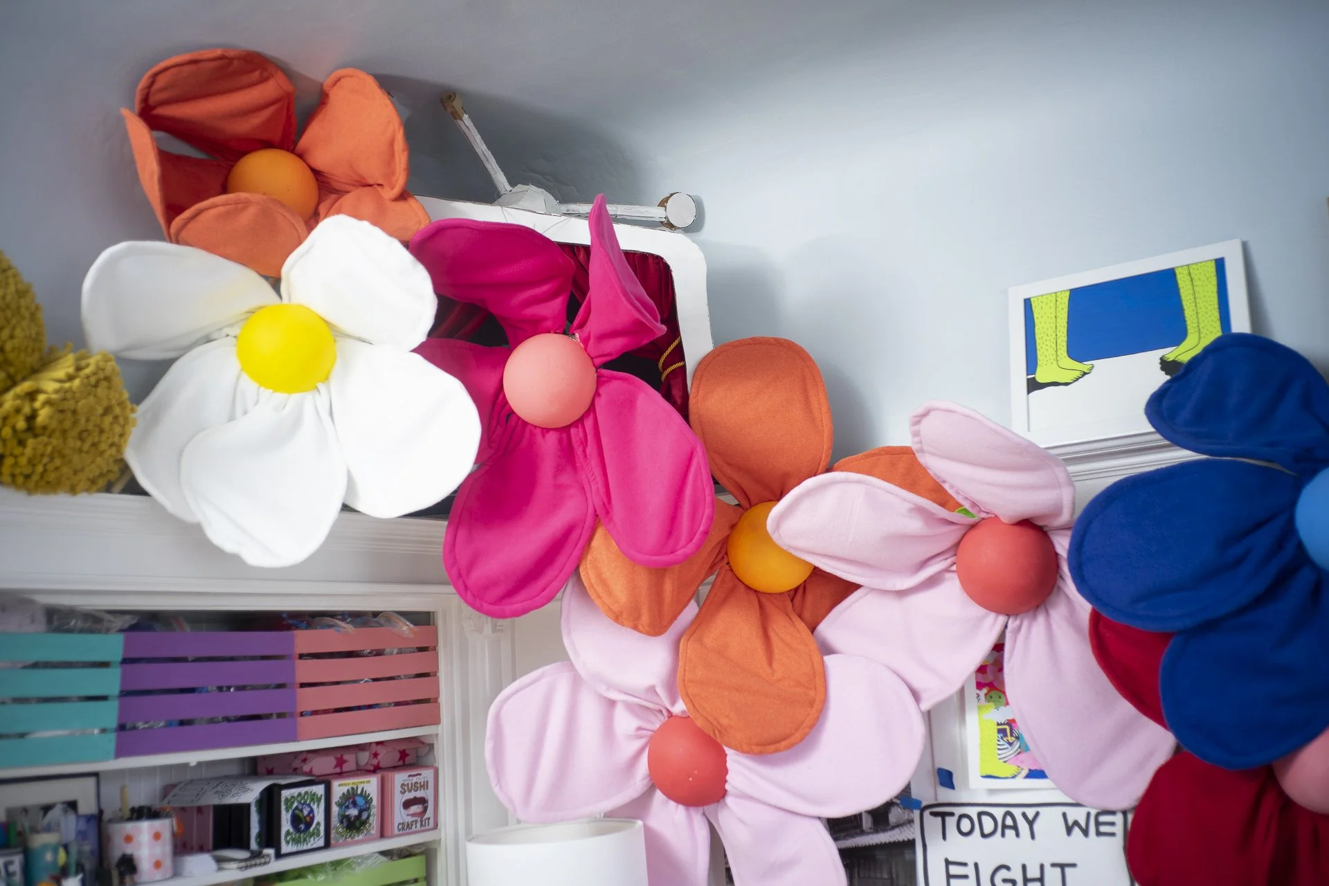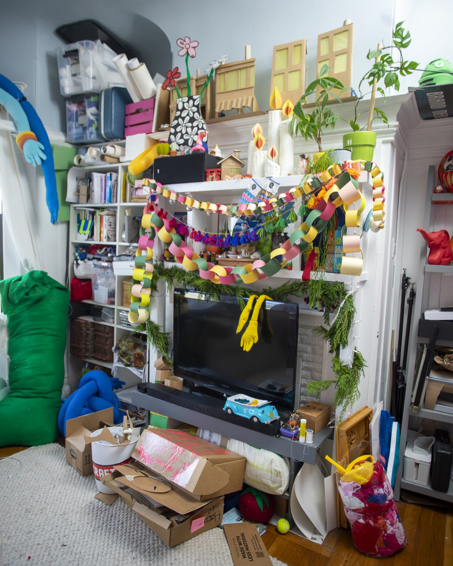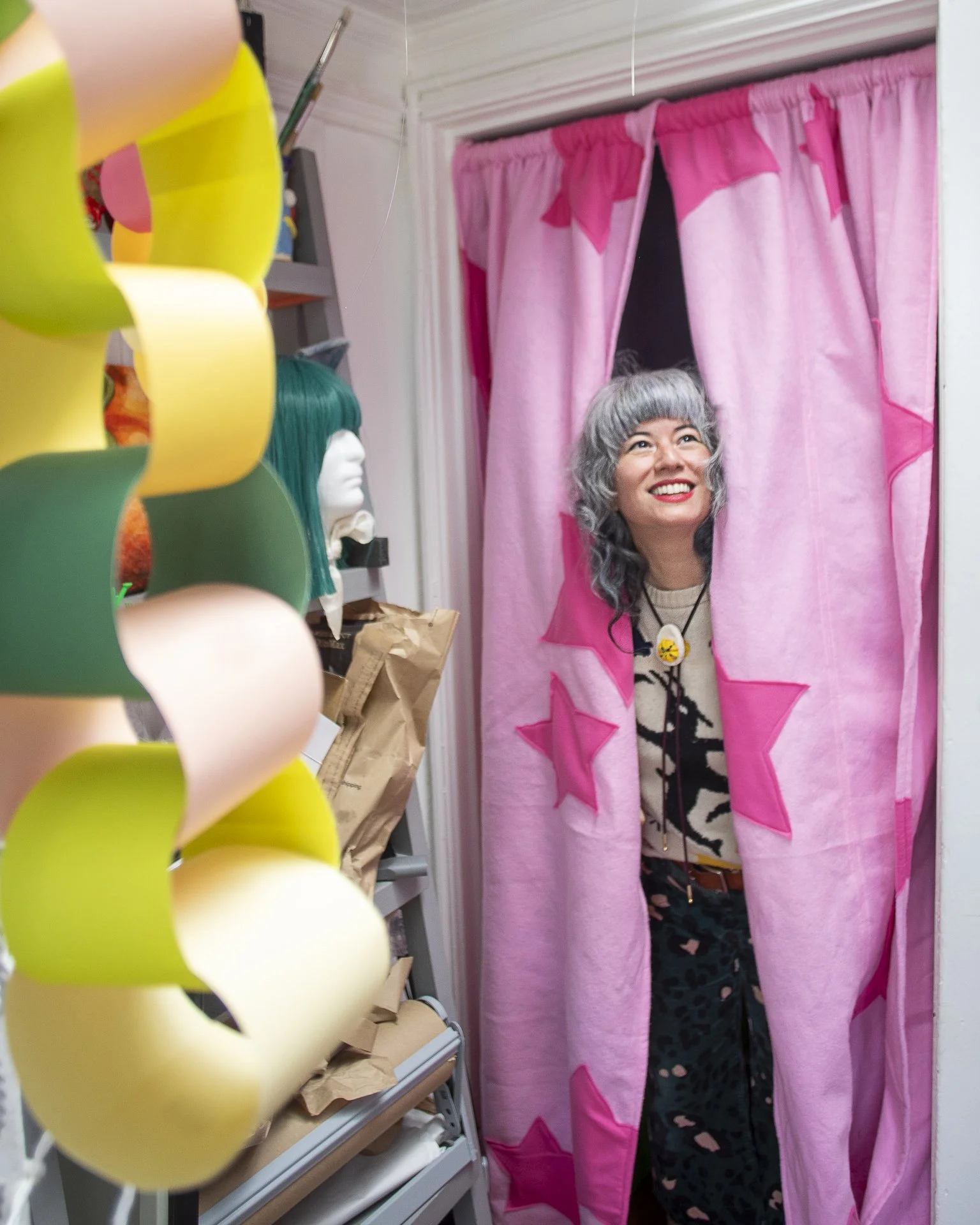Even the curtains placed to help keep heat in her studio have a fun and playfulness to them. Photo by Brandon Joseph Baker.