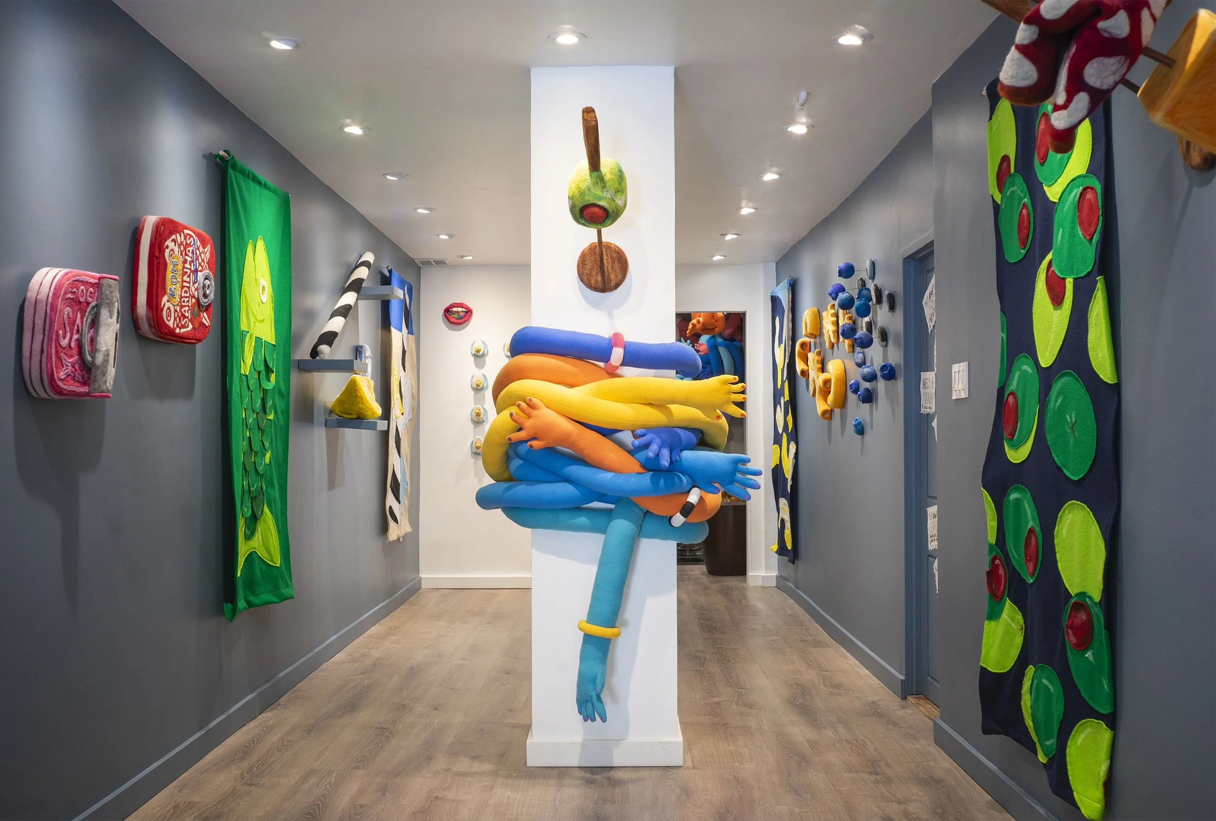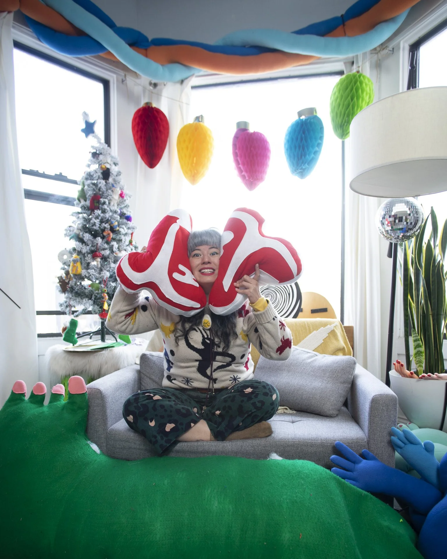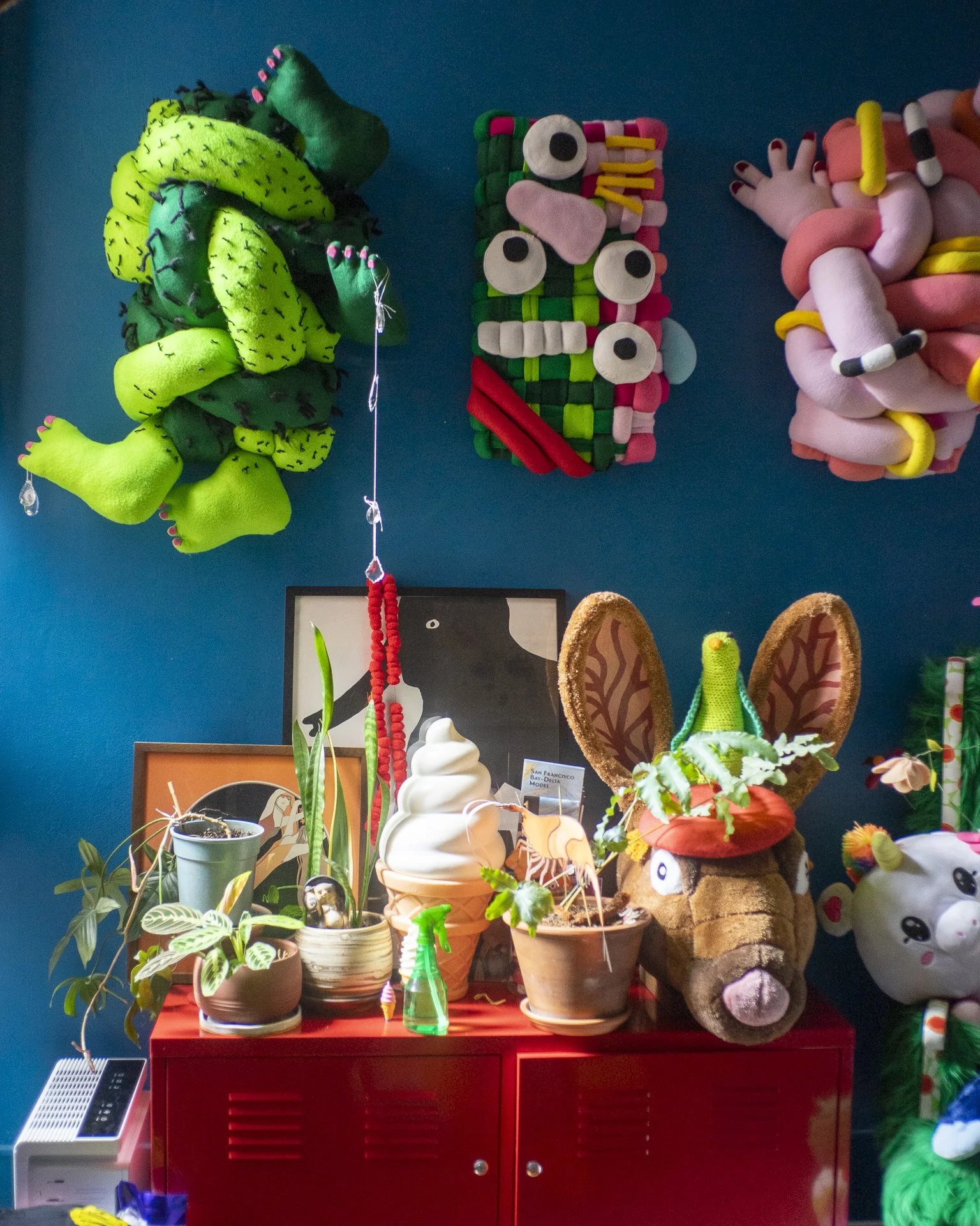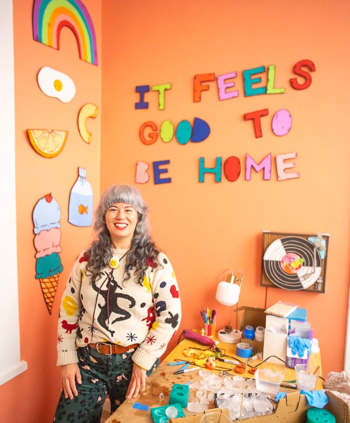 Risa Iwasaki Culbertson’s studio is a little pocket of wonder in a nondescript 8 unit apartment building in The Richmond neighborhood in San Francisco. As I take my shoes off in the studio doorway, I wonder if her neighbors have any idea of all the bright colorful works she’s created inside. The kitchen is in deviled eggs and shrimp bolo ties production, giant cocktail garnishes are mounted to the walls like taxidermy trophies, quirky plush puppets hang out in nearly every corner and overstuffed flowers grow to the ceiling.
