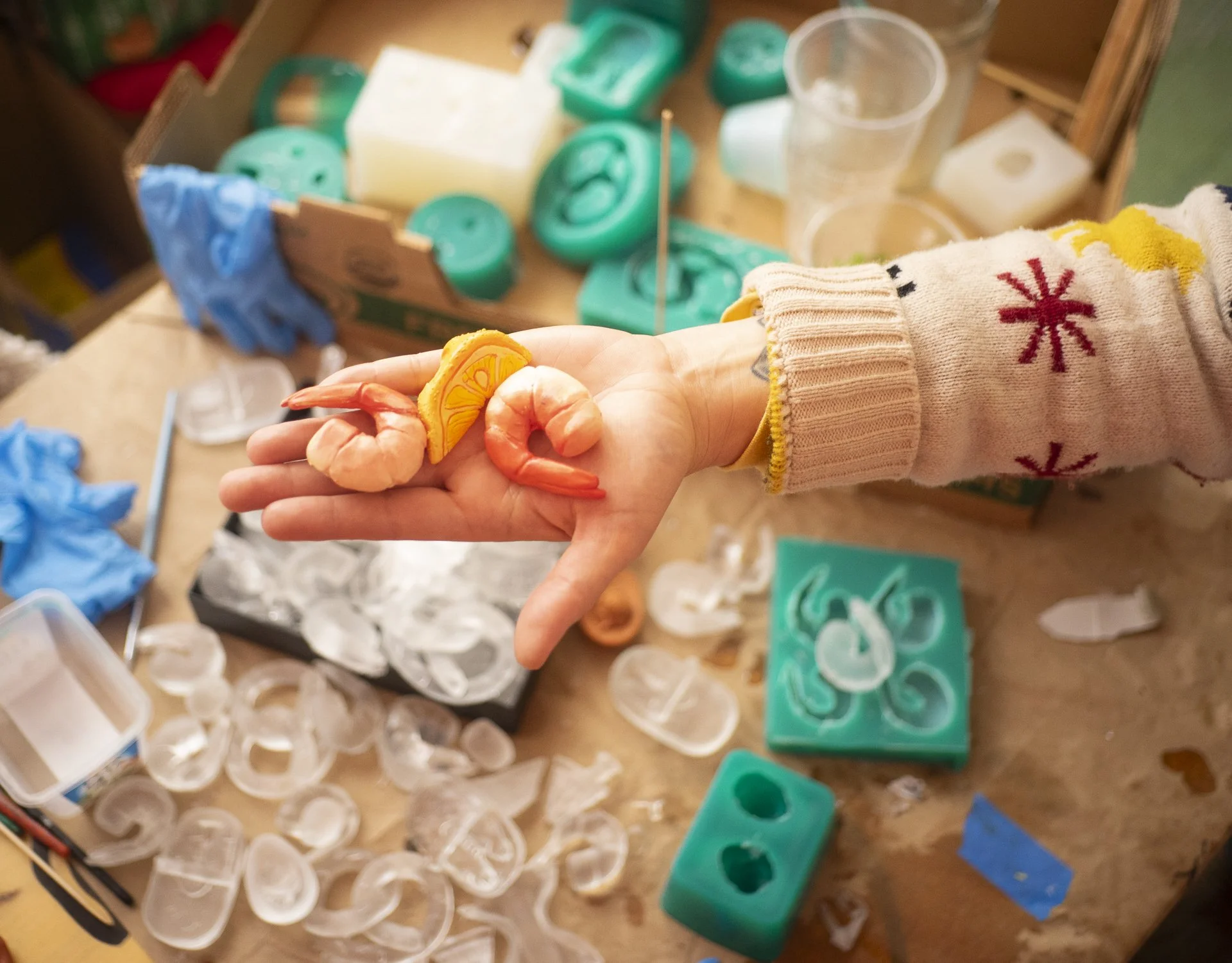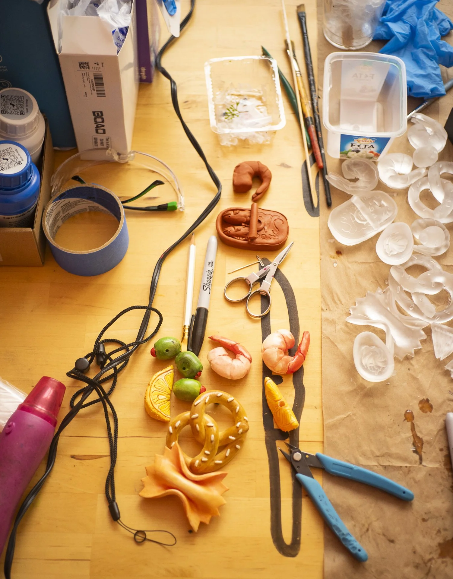 Hand painted resin casts as part of a shrimp cocktail Risa made in her studio. Photo by Brandon Joseph Baker